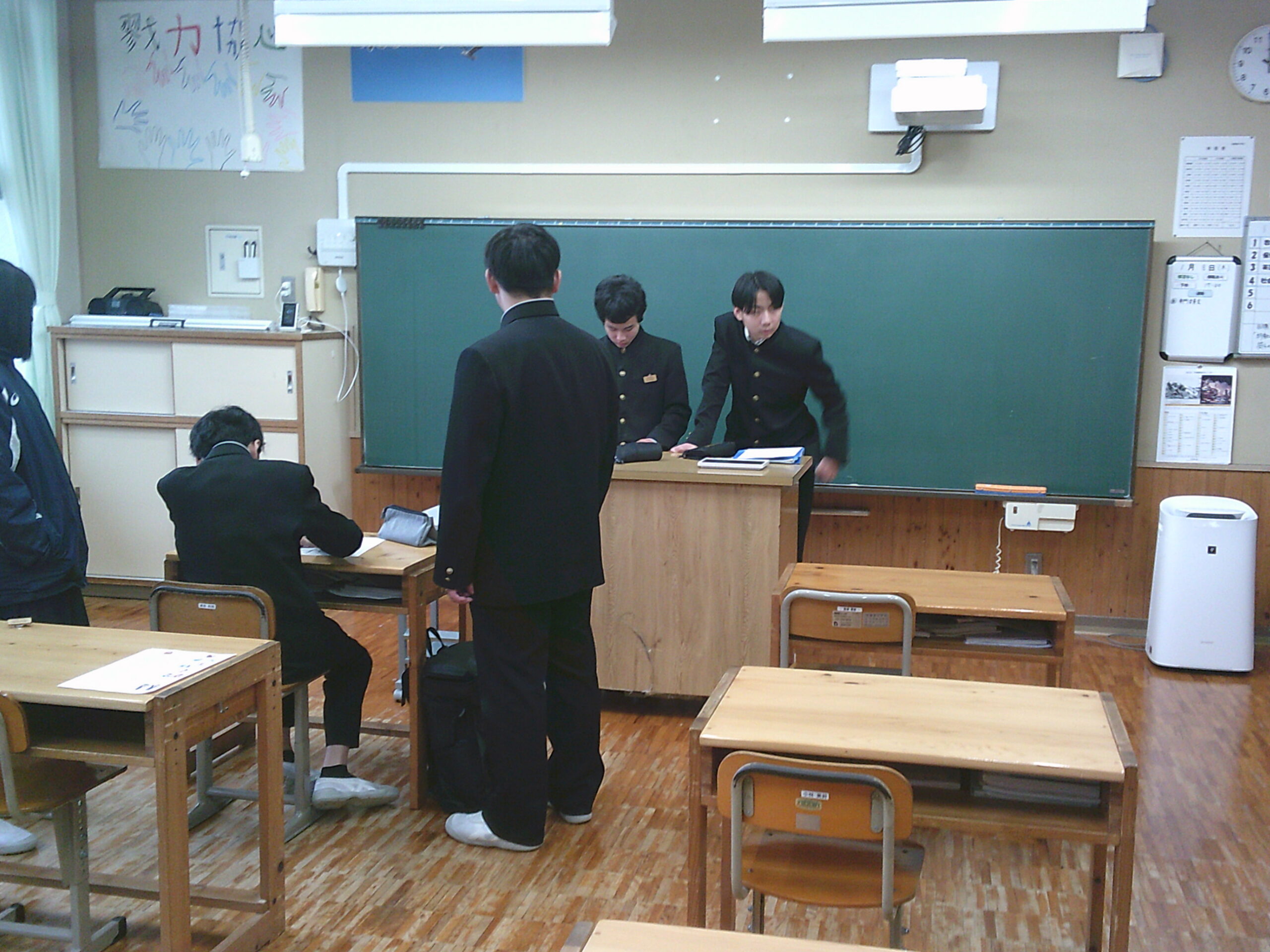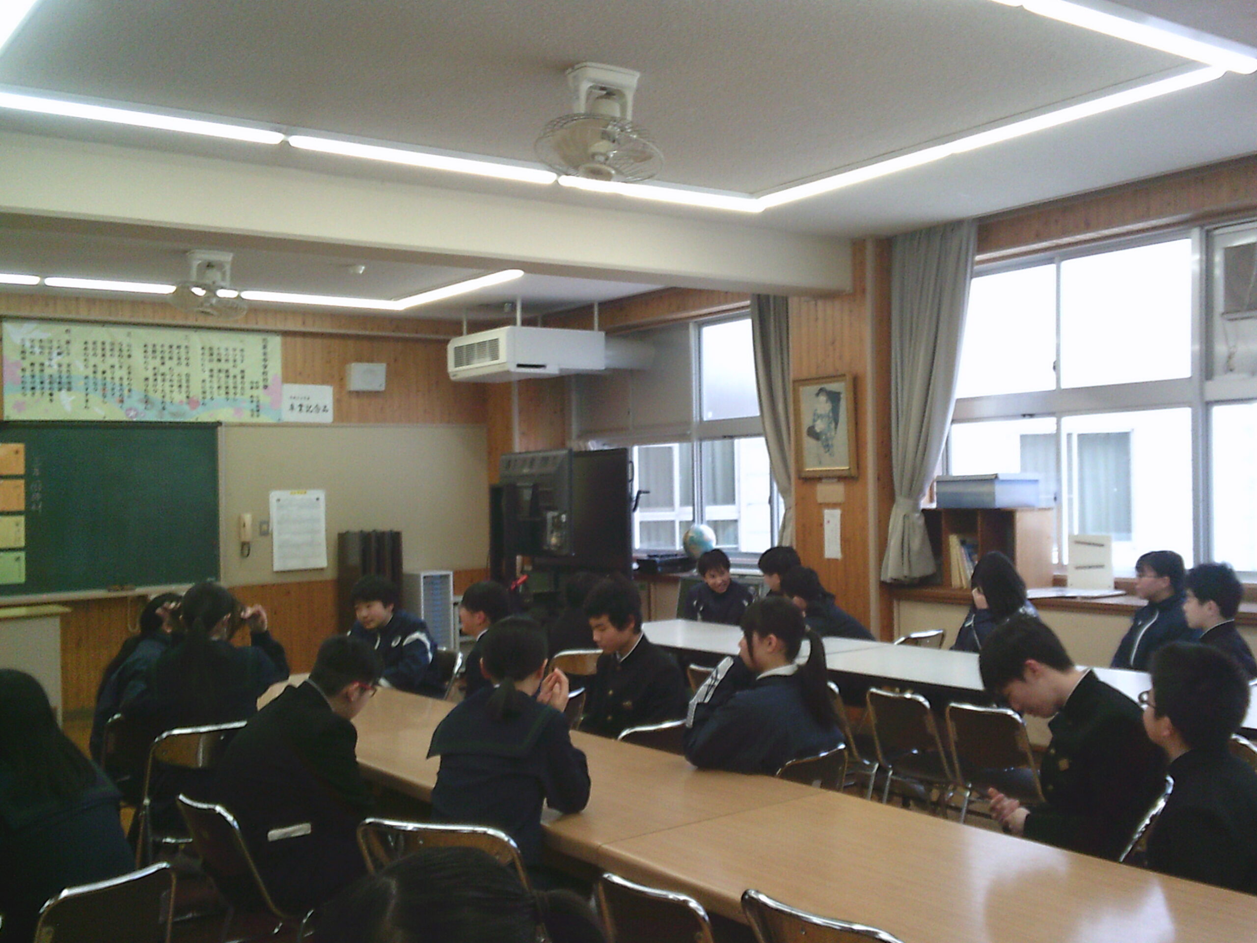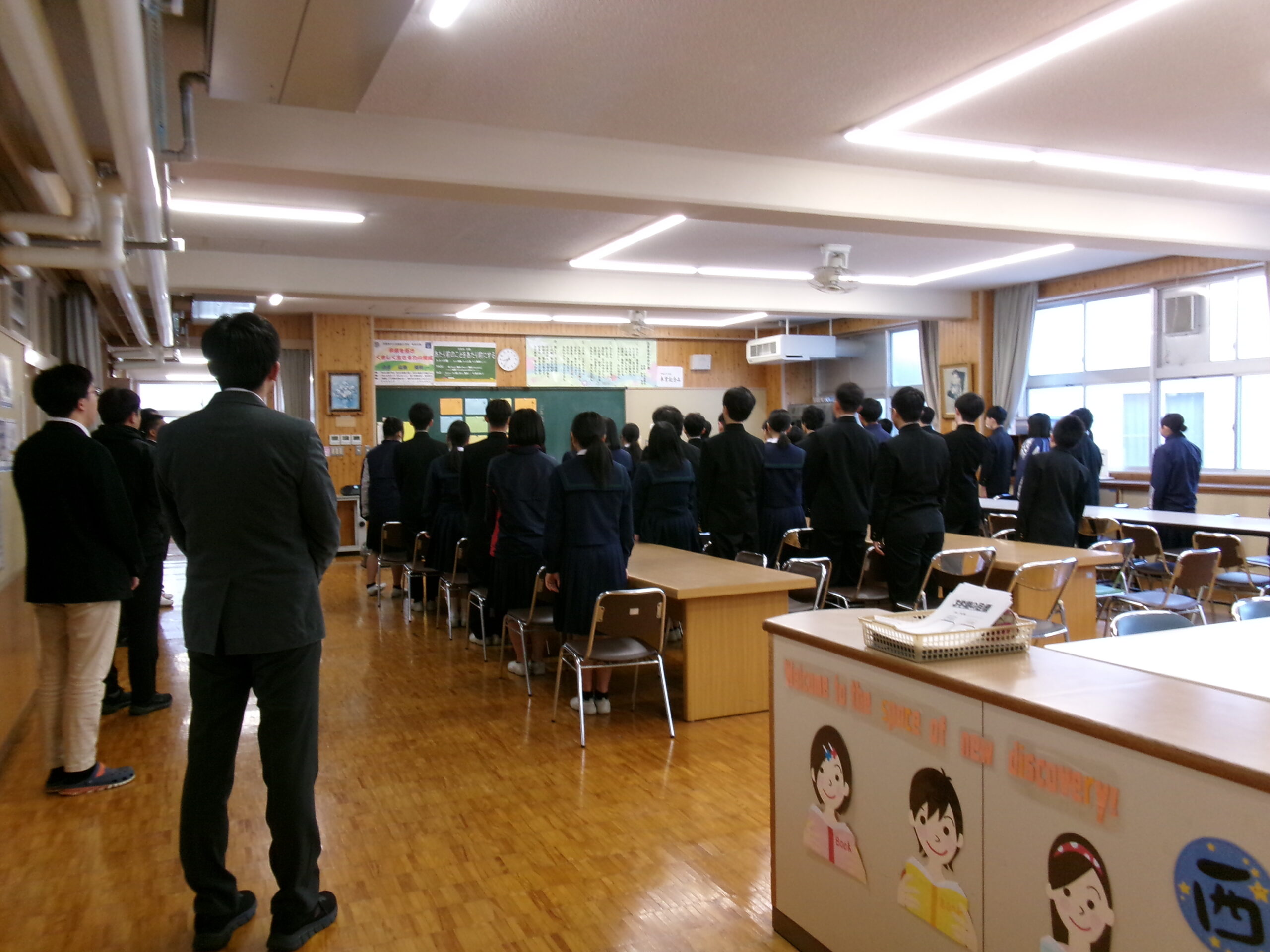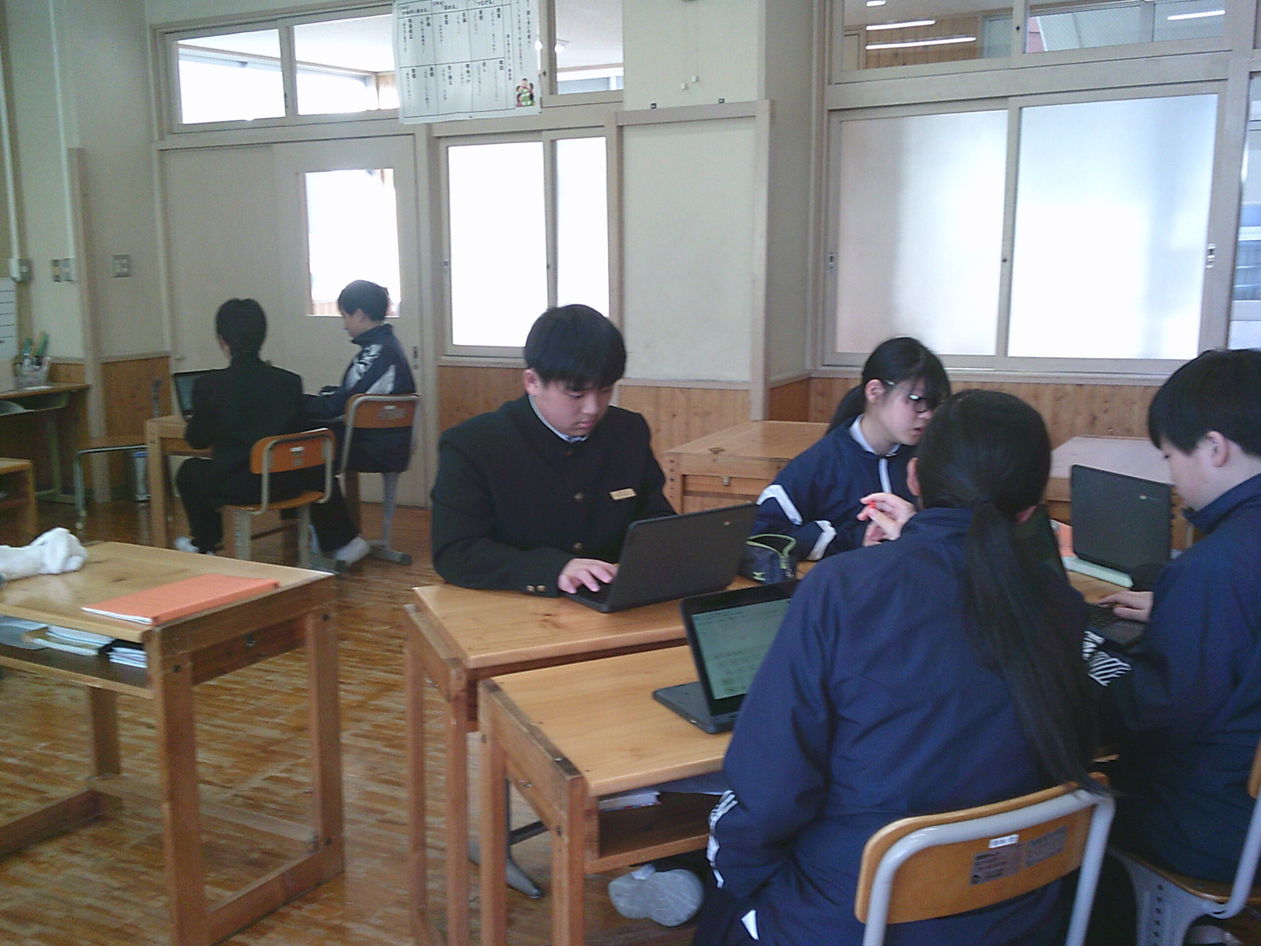 今日の午後は学期に1回の大掃除です。1年生は学級閉鎖のため、2年生の協力も仰ぎ、机を廊下に出し、1年団の先生で頑張りました。普段掃除できていない場所も丁寧に雑巾で拭き取ったり、床をきれいにした後、整備分科委員が中心になりさらに残ってワックスがけをしたりしました。先輩方から受け継いだ校舎を大切に使っていく気持ちが表れた大掃除でした。(掃除中の写真撮影をしておらず、申し訳ありません。)