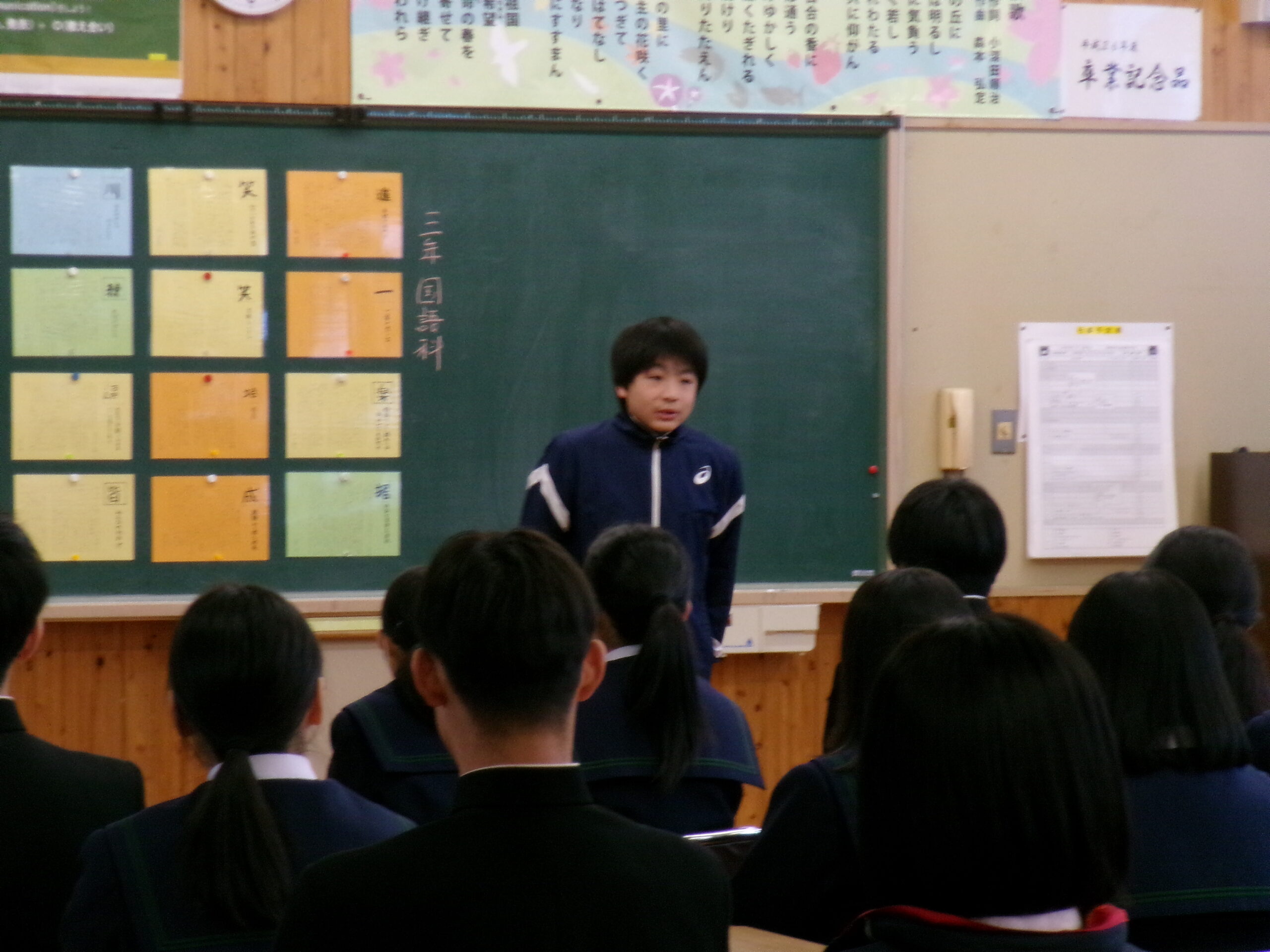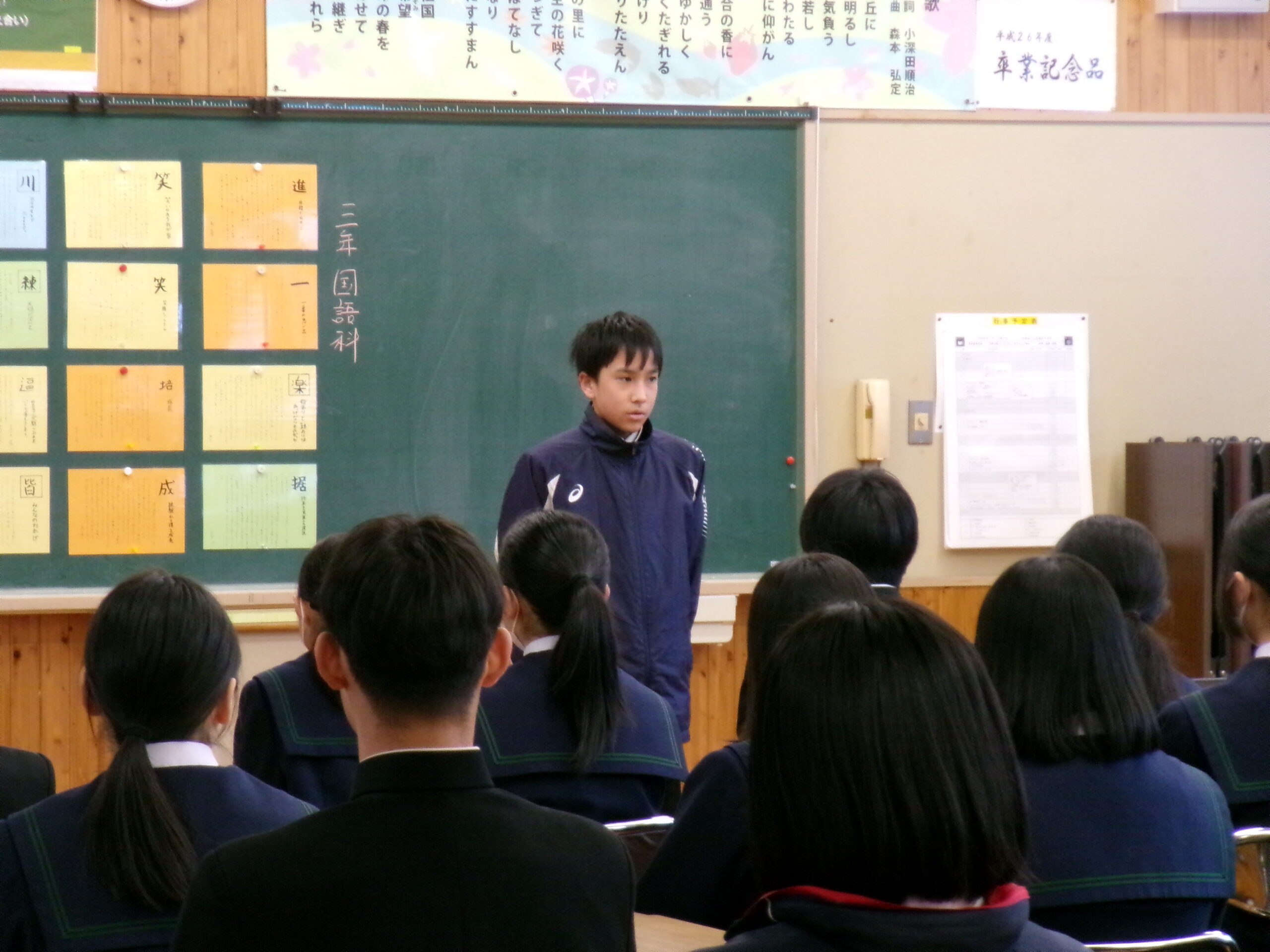 2学期終業式では、校歌斉唱からはじまり、それぞれの学級の2学期について、学級委員長が総括しました。2学期協力して学習に取組めたり仲良く過ごせた反面、勉強に集中できなかったり、家庭学習ができていなかったりといった反省が出ていました。校長からの話では、行事では、リーダーが入れ替わりながら活躍した2学期だったこと、西中統一模試では、西粟倉村が大切にしている「学びを楽しむ」という姿が見られたことなどの総括がありました。式に引き続いて行われた表彰伝達では、書道や作文など様々分野で活躍している人の賞状を披露し伝達を行っています。