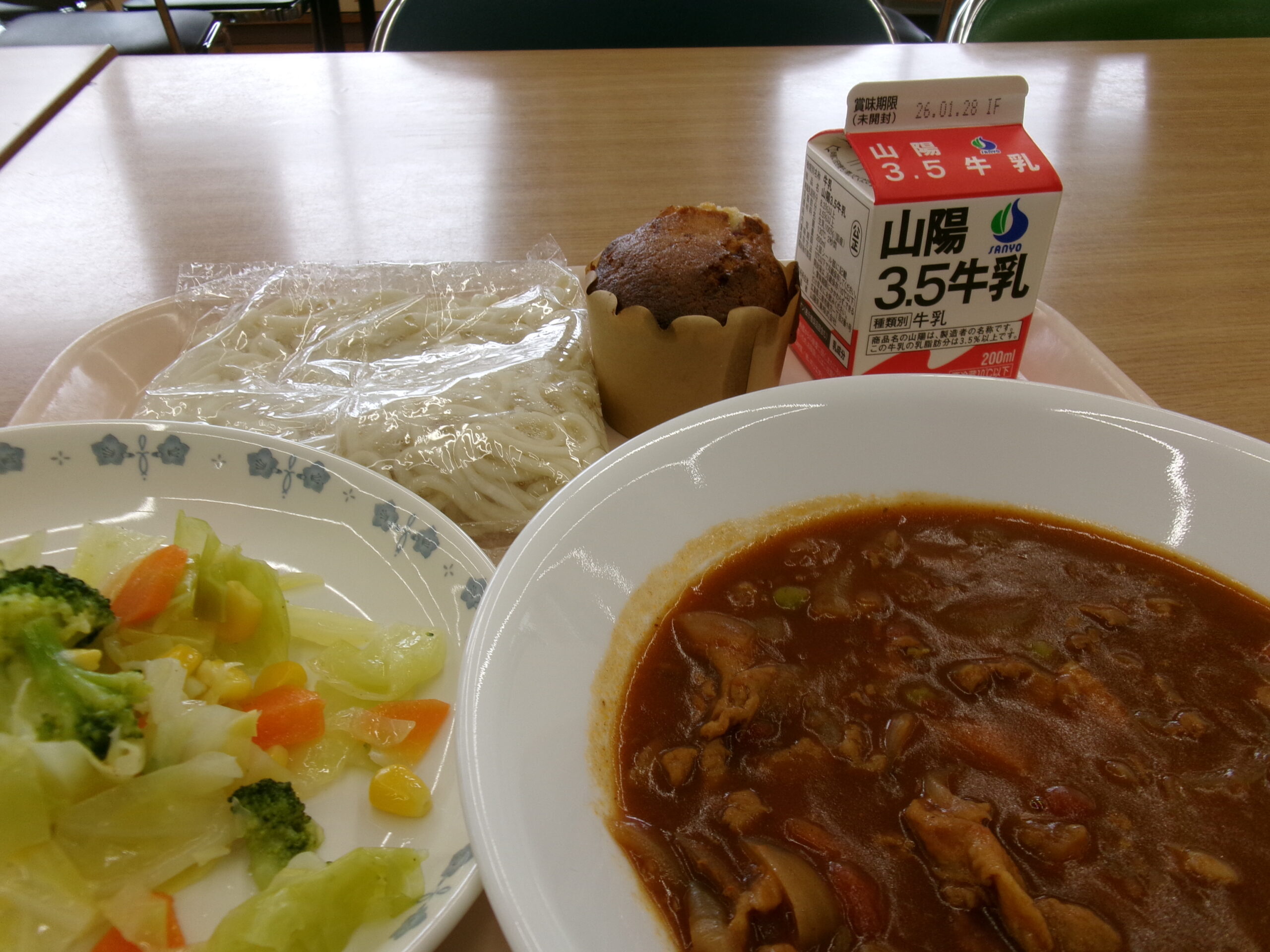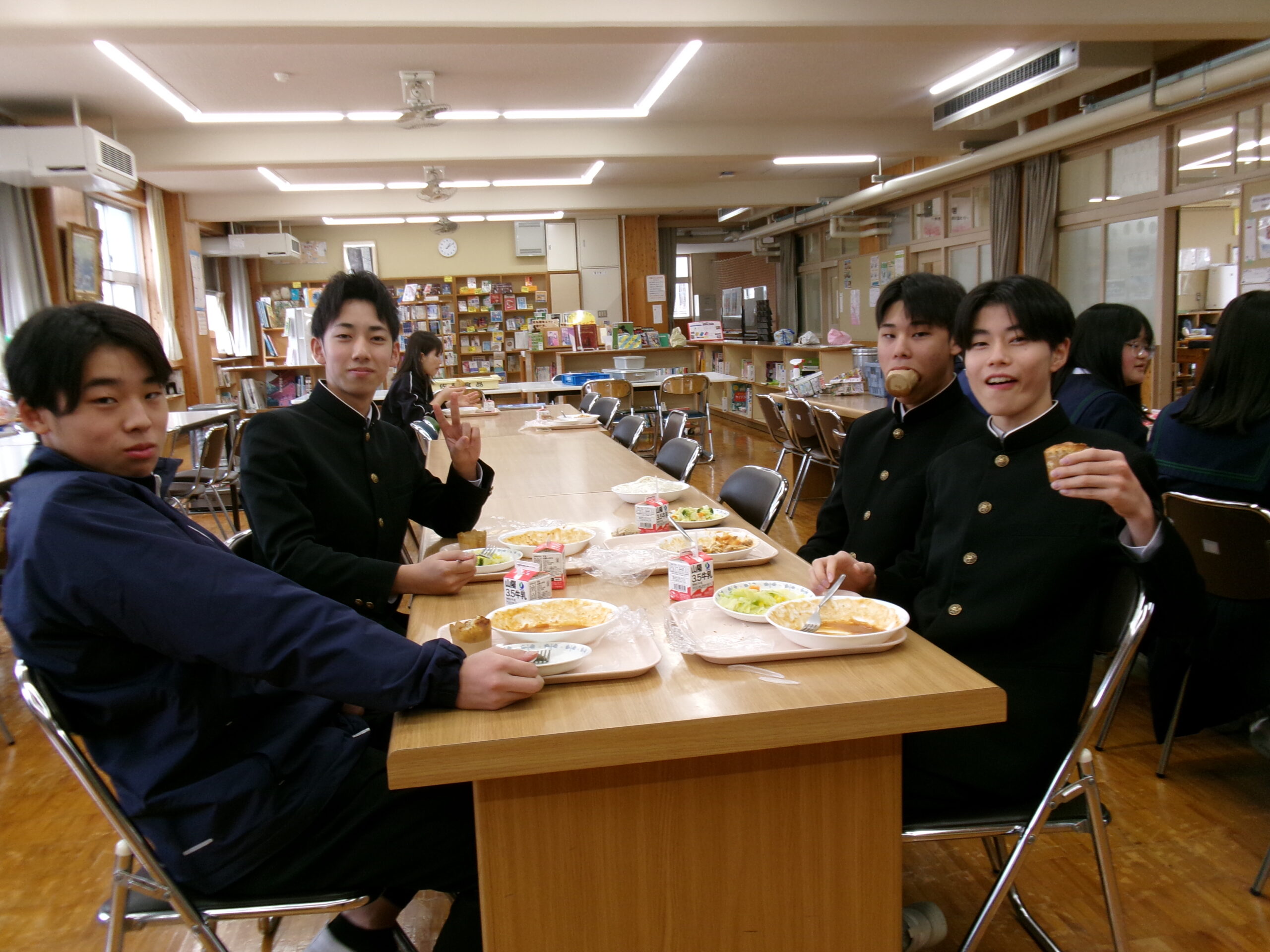 今日の給食メニューのブルーベリーマフィンは、給食コンテストで1年生の生徒が考案したメニューでした。このようなメニューを考えることができるってすごいですね。手作りのこのようなメニューが給食に出てくるのも西粟倉村の特徴の一つです。みんなでおいしくいただきました。