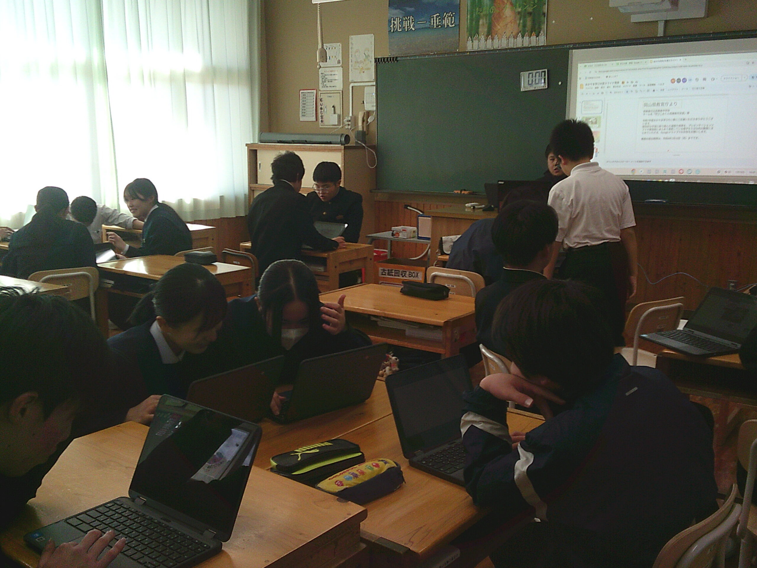 GIGAスクール構想の中、長年使用してきたクロムブックの入れ替えで、新しい機種に変更となりました。生徒は、「画面がきれいになった気がする」とか「タッチペンがついている」とか早速各個人のIDでログインしながら新しい機械を使いこなしていました。これからの大切に使ってください。