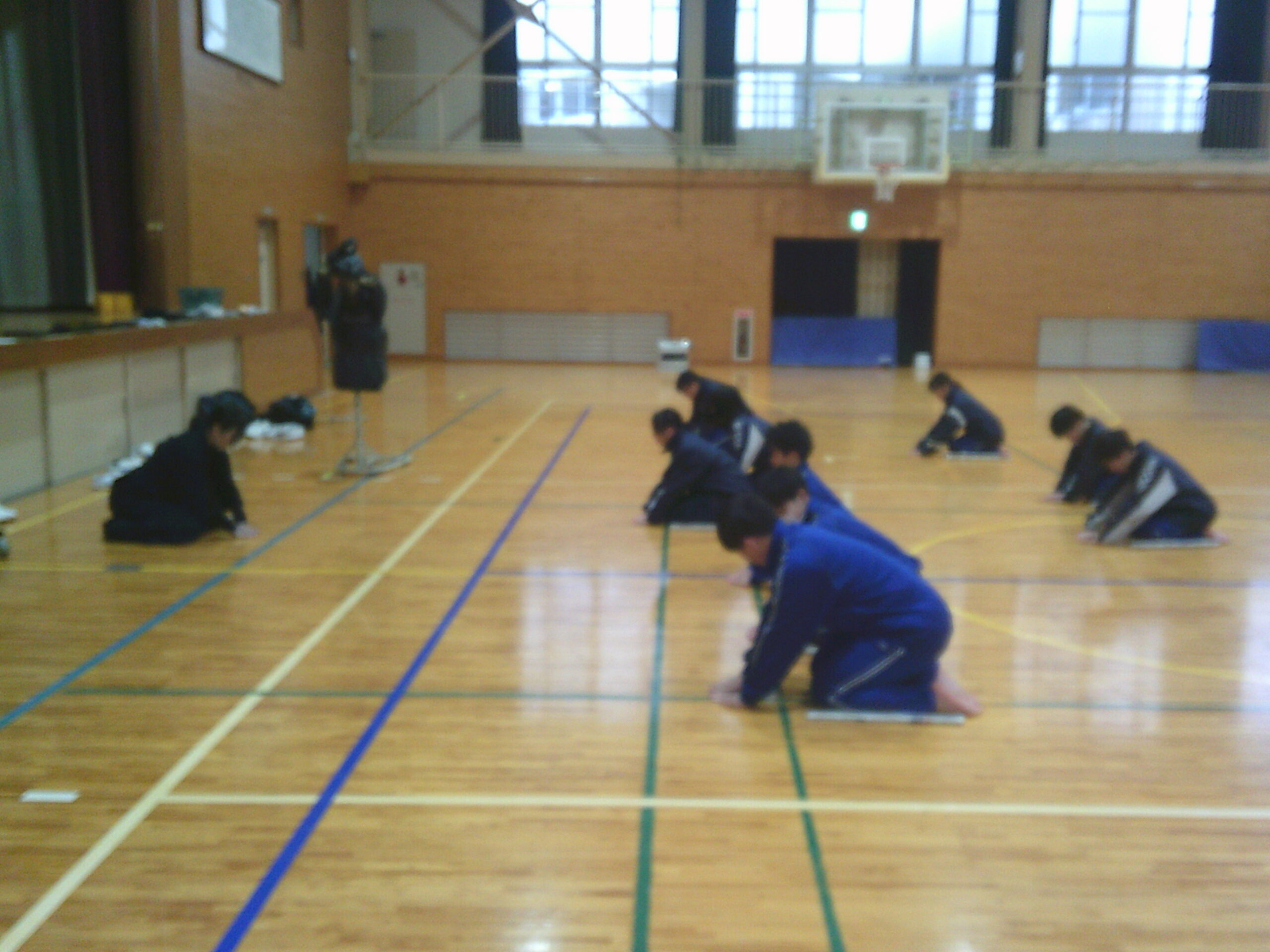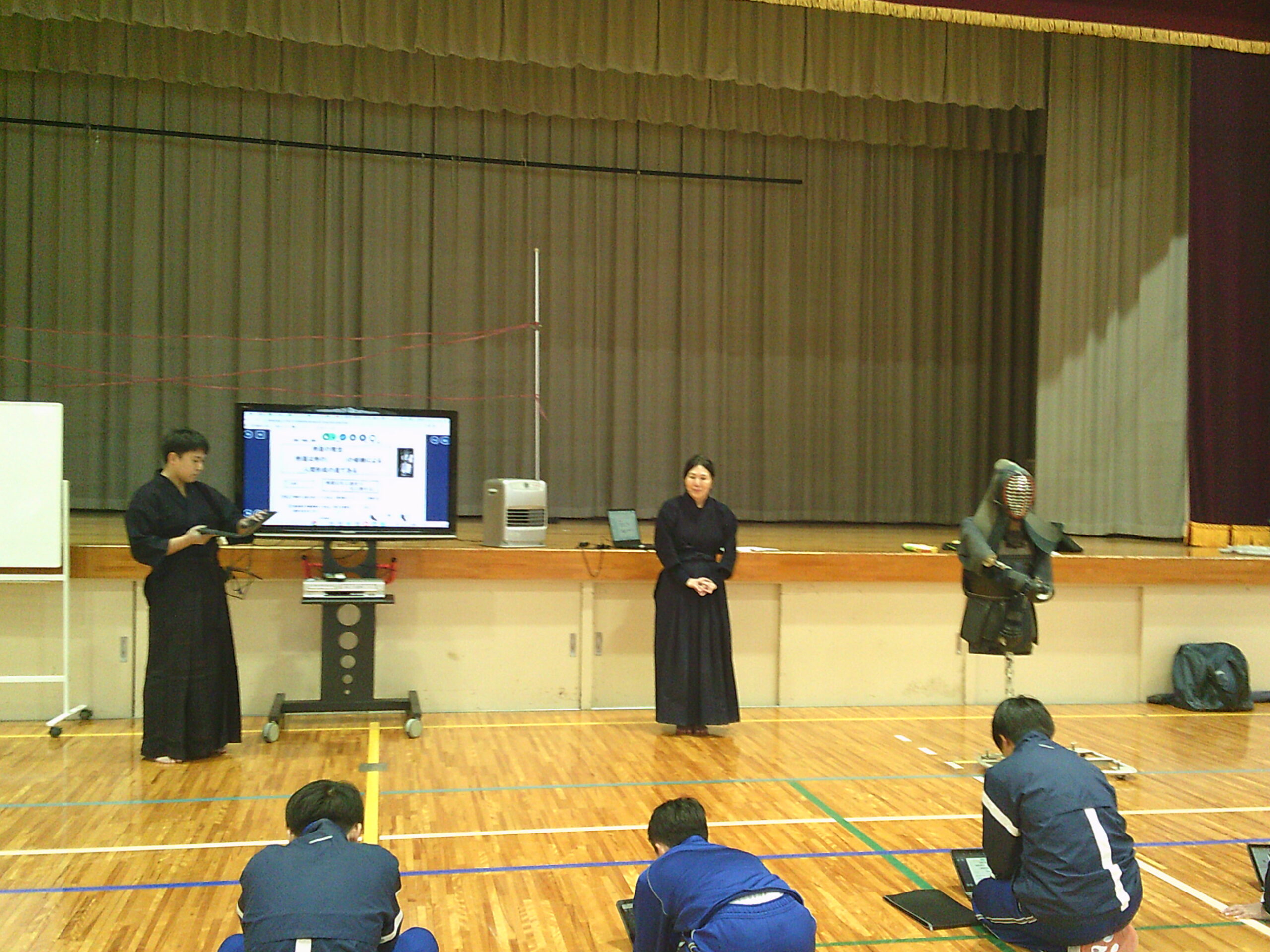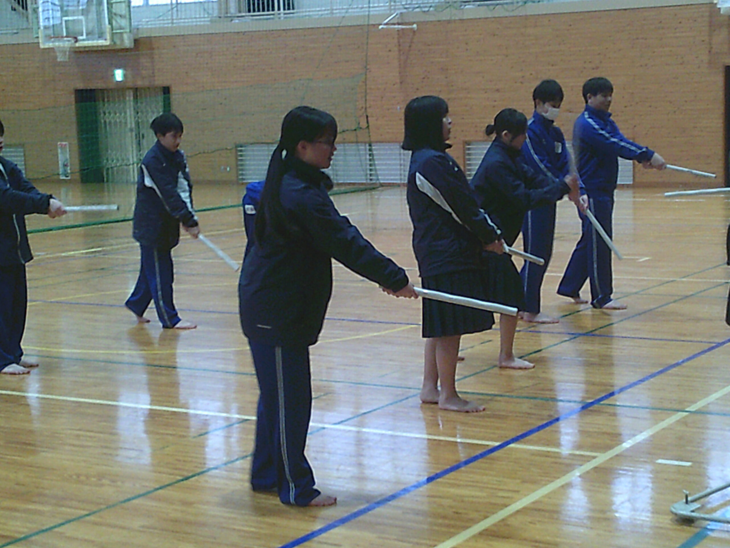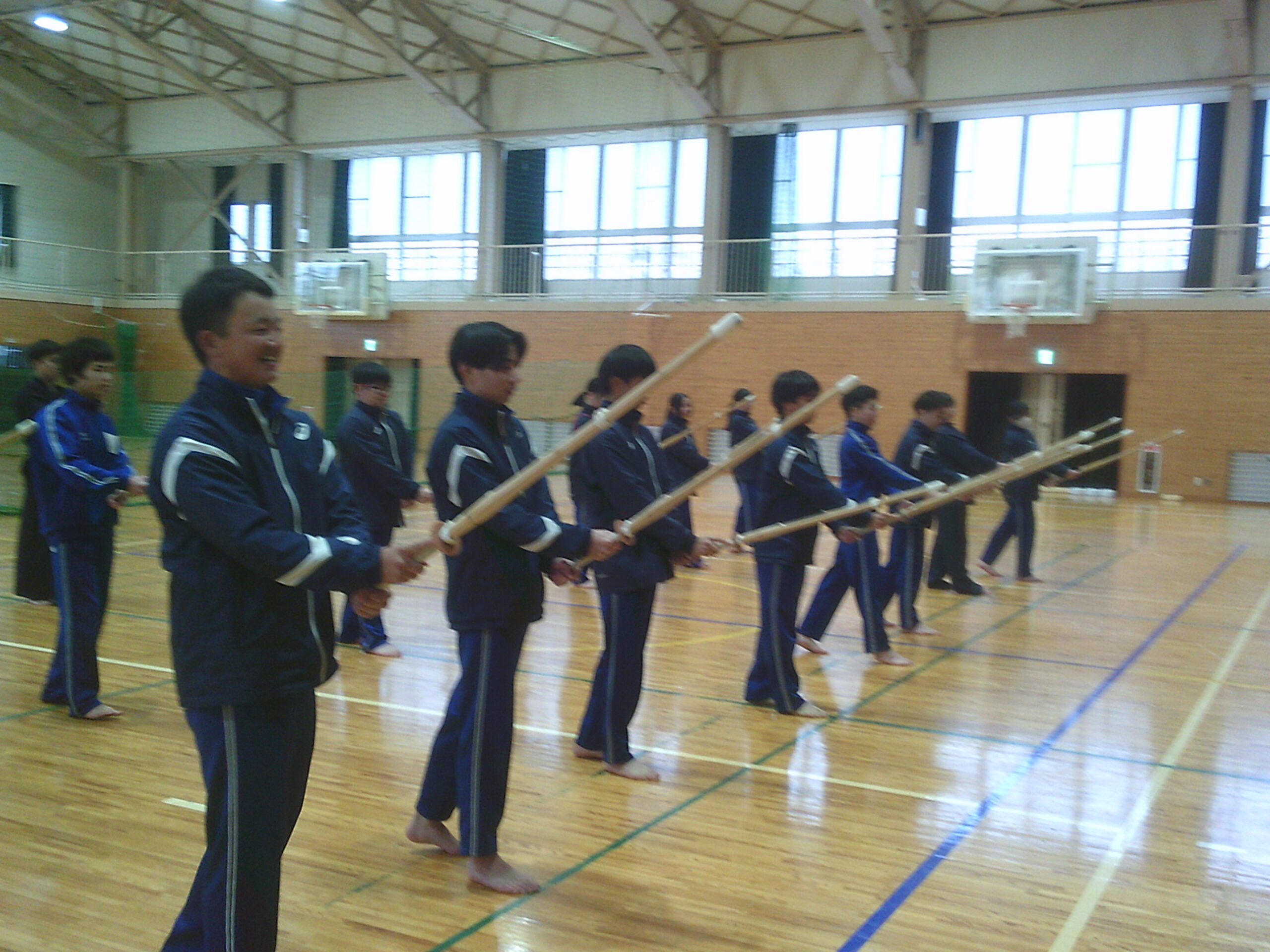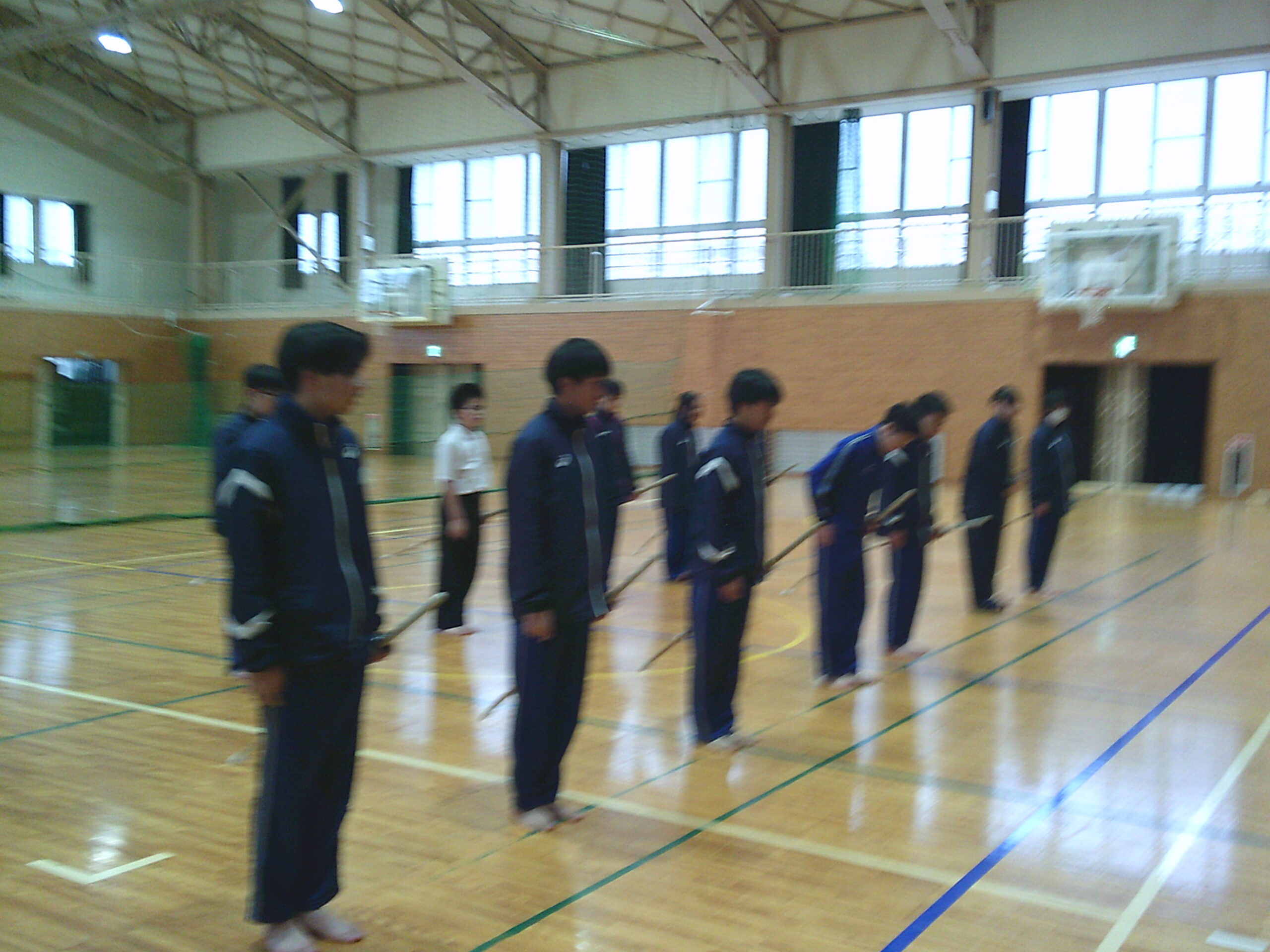 朝から雪が舞う中、本日から1、2年生の保健体育の授業では武道(剣道)がスタートしました。特別講師として家庭科の小林先生も指導に加わり、二人体制での授業です。(今日は社会の松井先生も来てくださいました。)2年生は昨年度も授業をしているので、冒頭の剣道についての基本や礼法の基本を復習した後、実際に竹刀での素振りや剣道具を身に着けることを行いました。初めての着装ということもあり、先生の説明の後、お互いに見合いながらなんとか身に着けることができました。1年生は基本の礼法の話の後、新聞紙を丸めた簡易竹刀での練習です。少しずつ基本を身に着け来年には剣道具を身に着けて試合ができればいいですね。