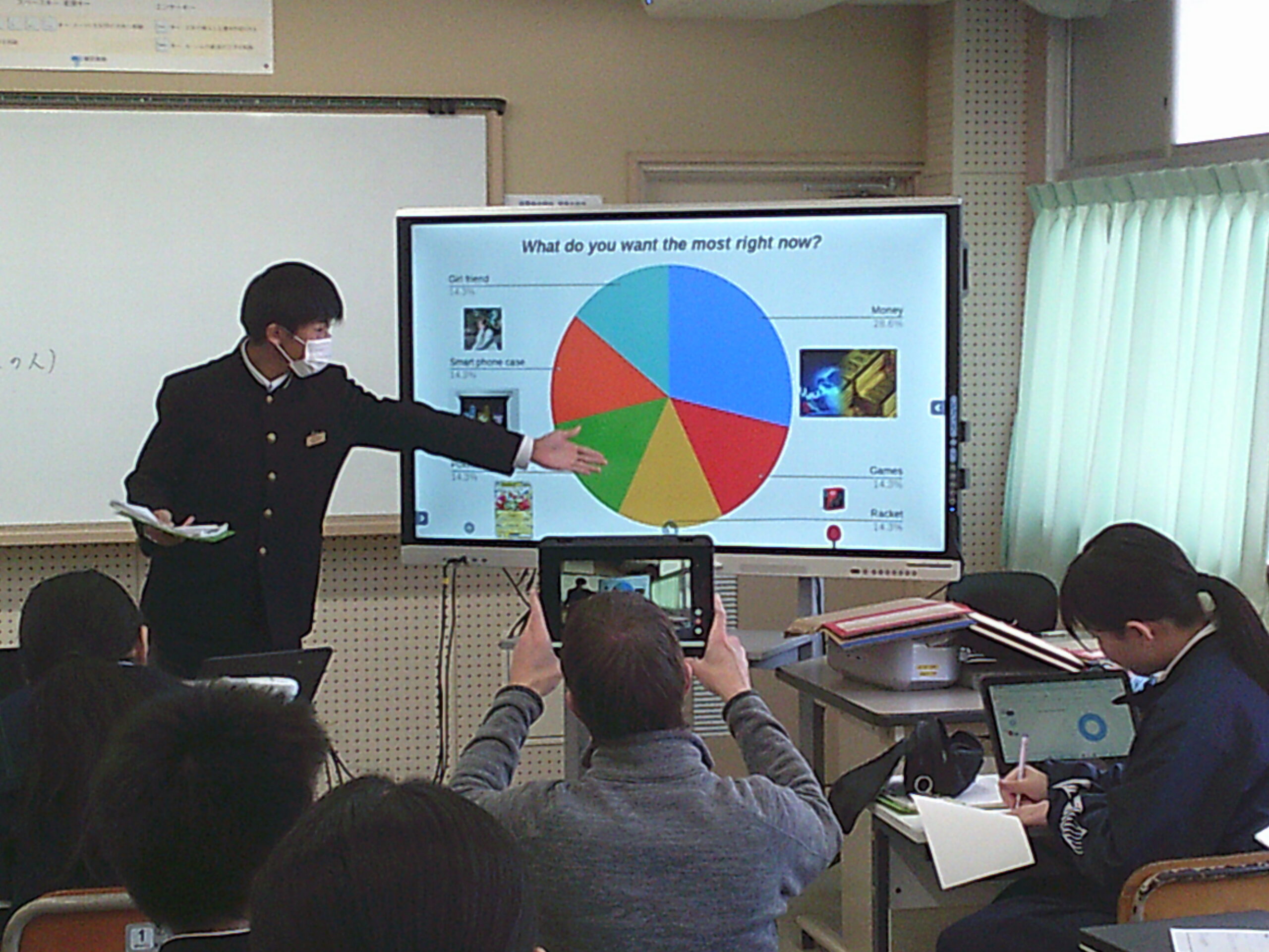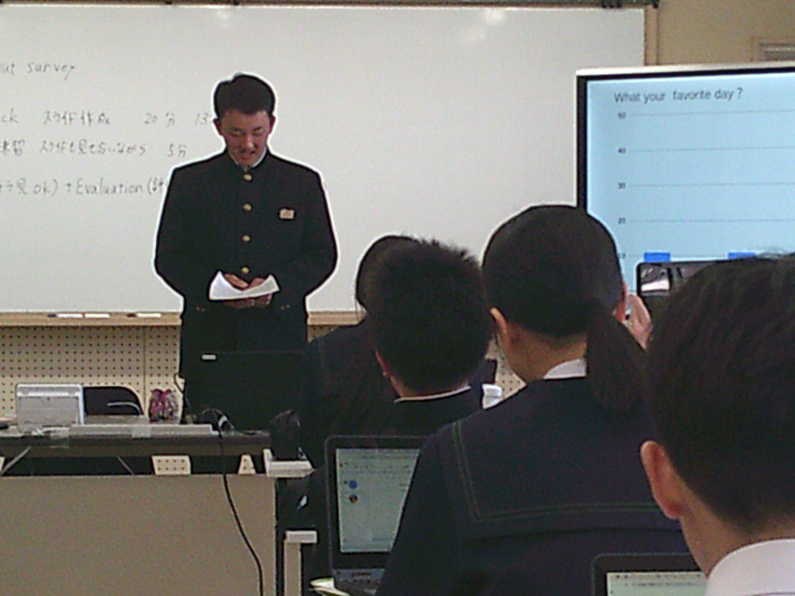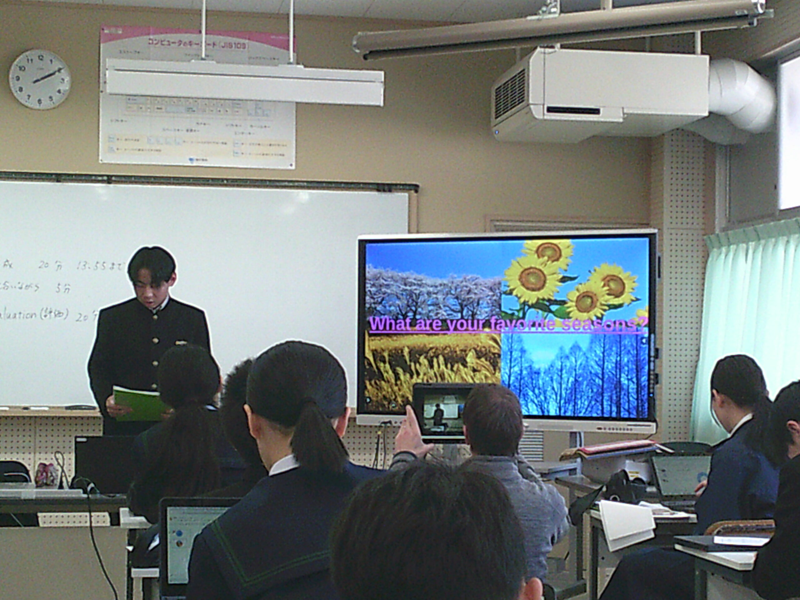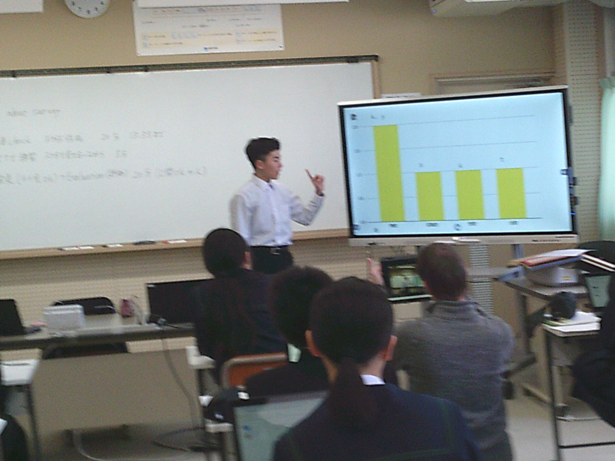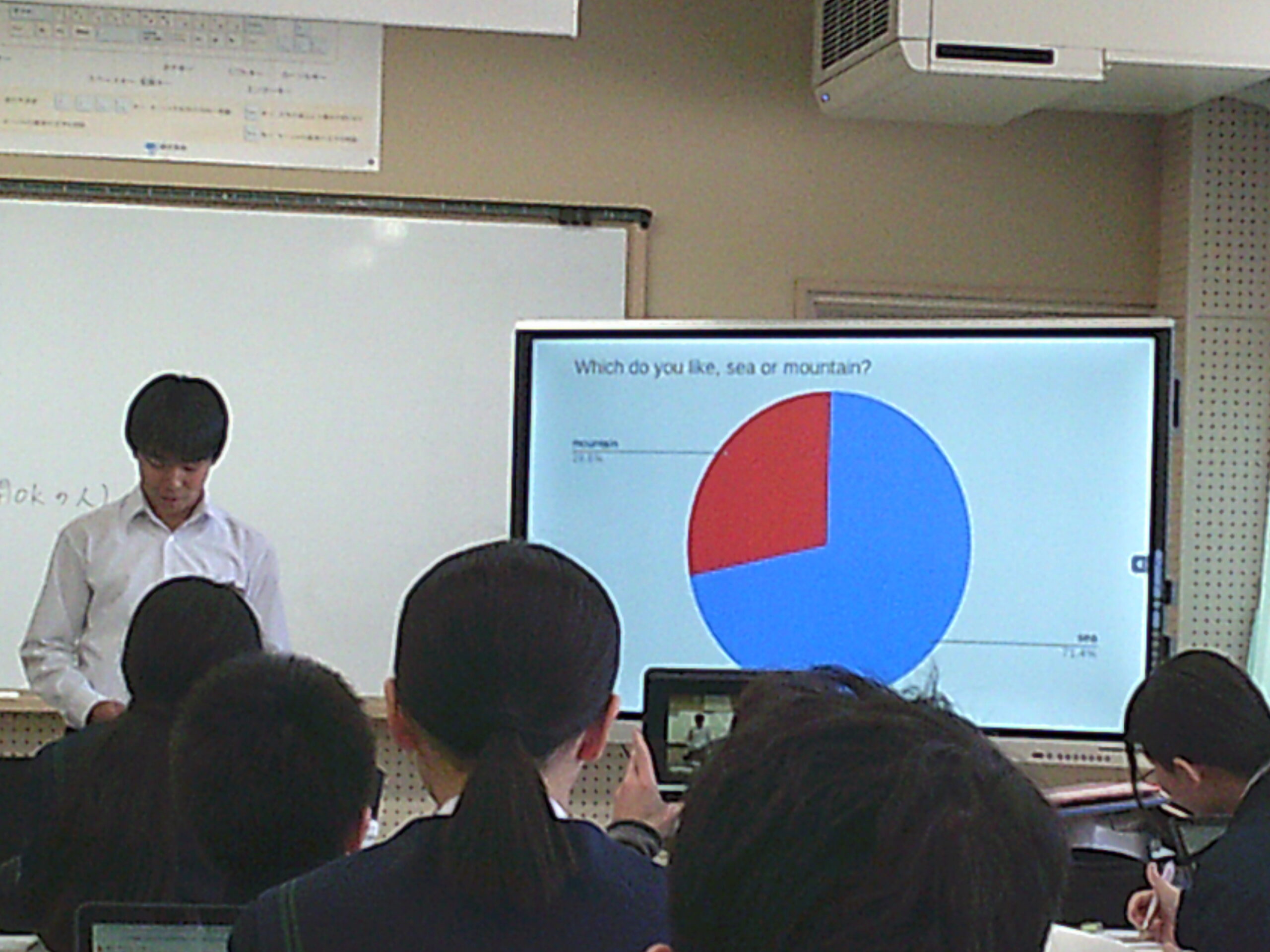 5時間目の英語の授業では「Presentation about survey.」(調査したことを発表しよう)ということで、クラス内で調査したデータを集計し分析した結果を英語で表現する時間です。どんな季節が好き?何曜日が好き?から始まった調査は、その理由はなぜ?自分はこう思ったけど結果が違ったなど様々な質問をした結果をもとにグラフ化したりしながら身振りも交え上手にプレゼンテーションしていました。