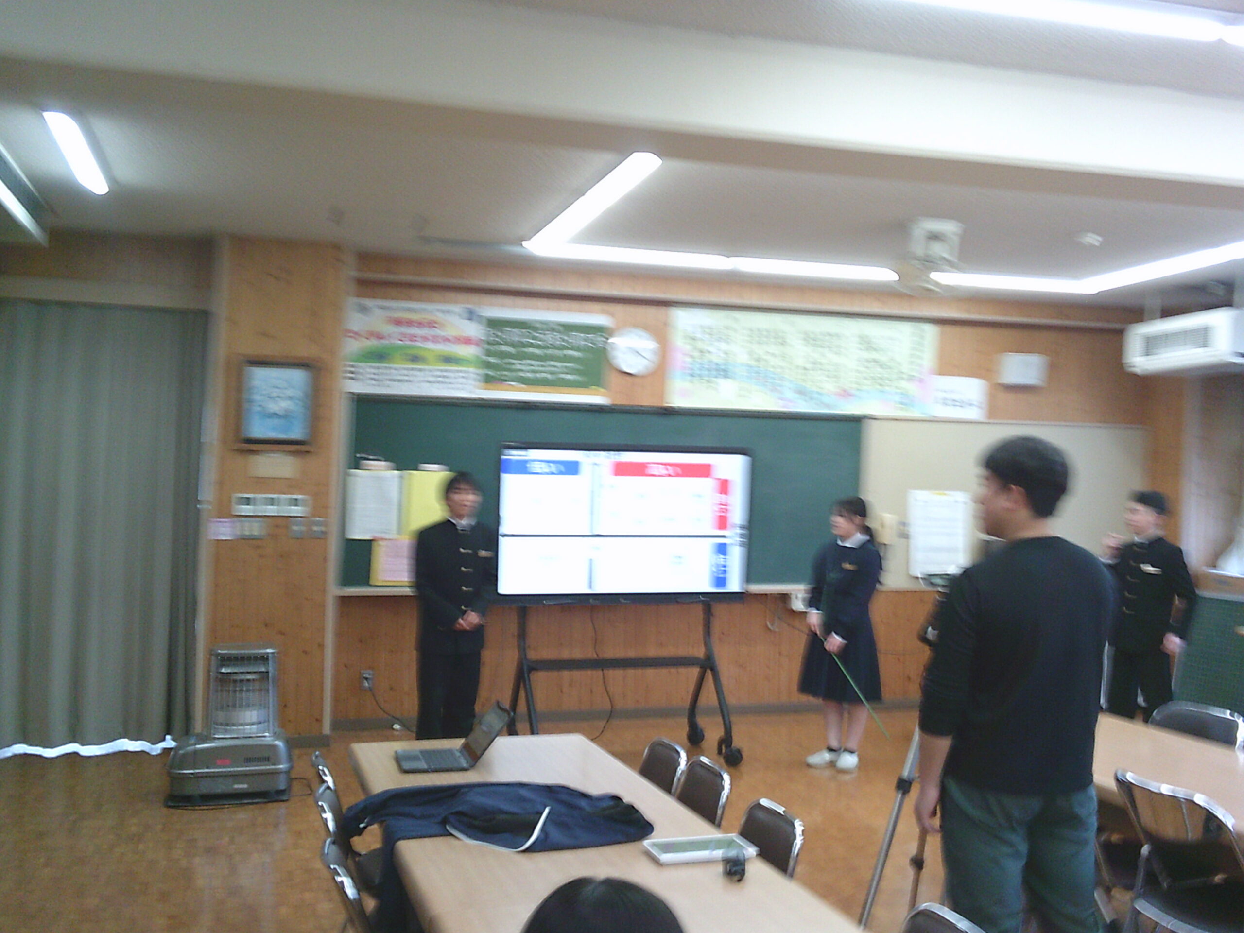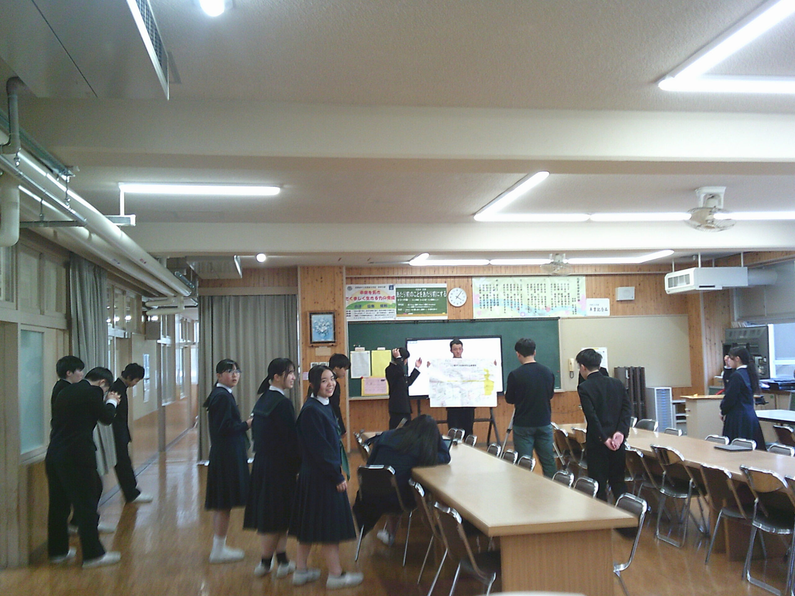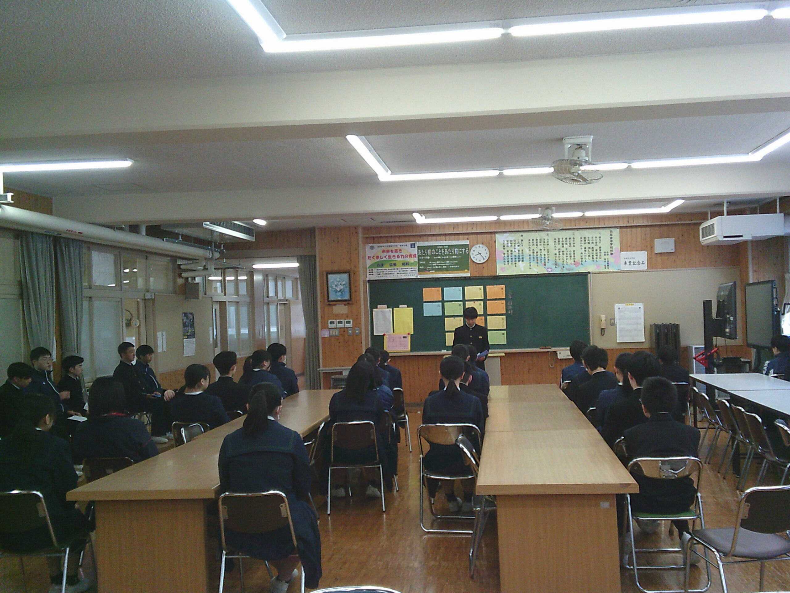 2年生は職場体験の報告会をひらき、1年生が参加しました。来年度の取り組みにむけて、とても参考になりました。