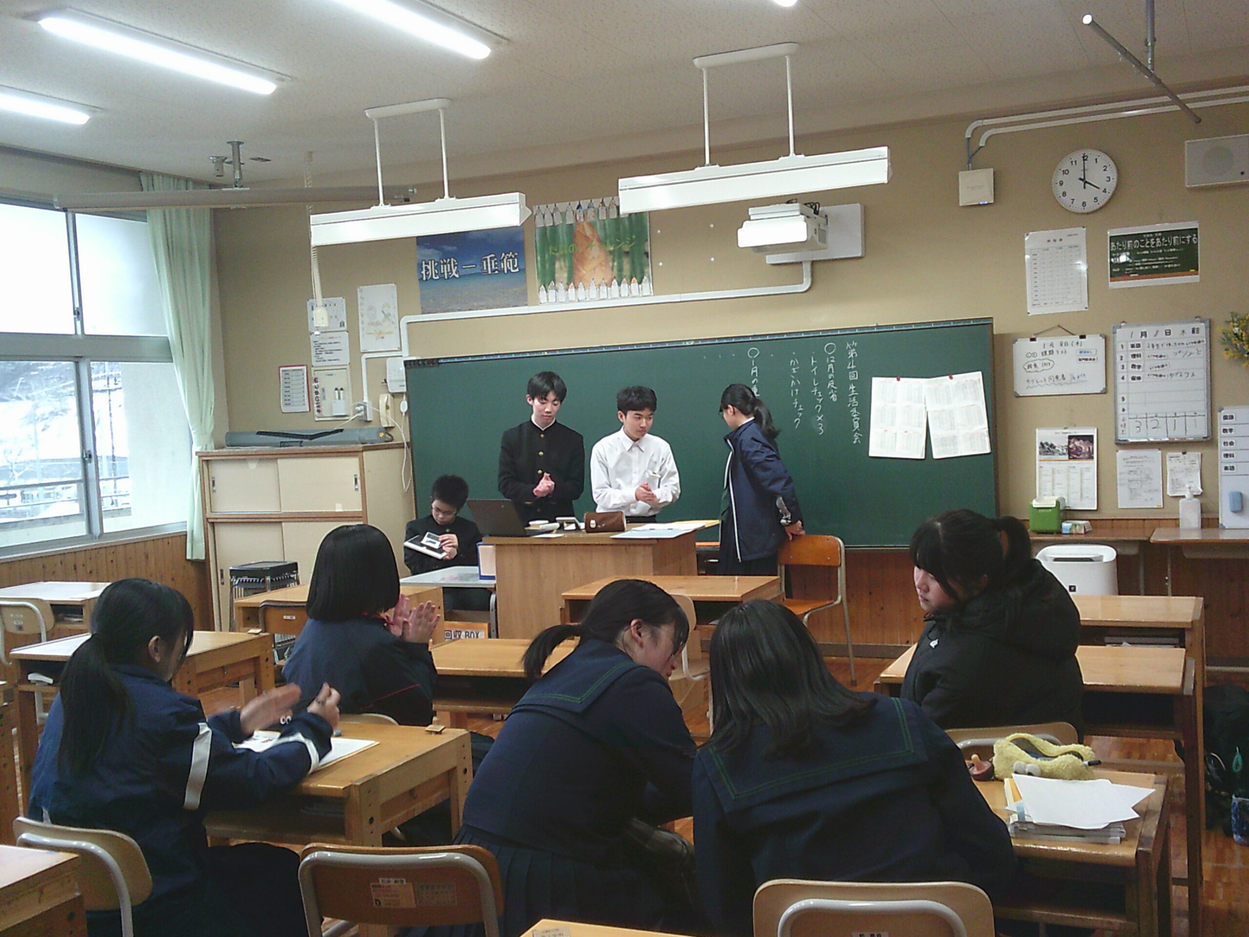 通学路には積雪の後もある中、久しぶりの登校で、普段より少し早めの登校だった人も多くいました。本日から3学期がスタートします。始業式では、校歌斉唱の後、各学級や生徒会本部の生徒による決意表明、校長による式辞があり、まとめの学期としての3学期をどのように過ごすのかについて話がありました。その後は3年生は実力テスト、1,2年生は課題テストを行っています。