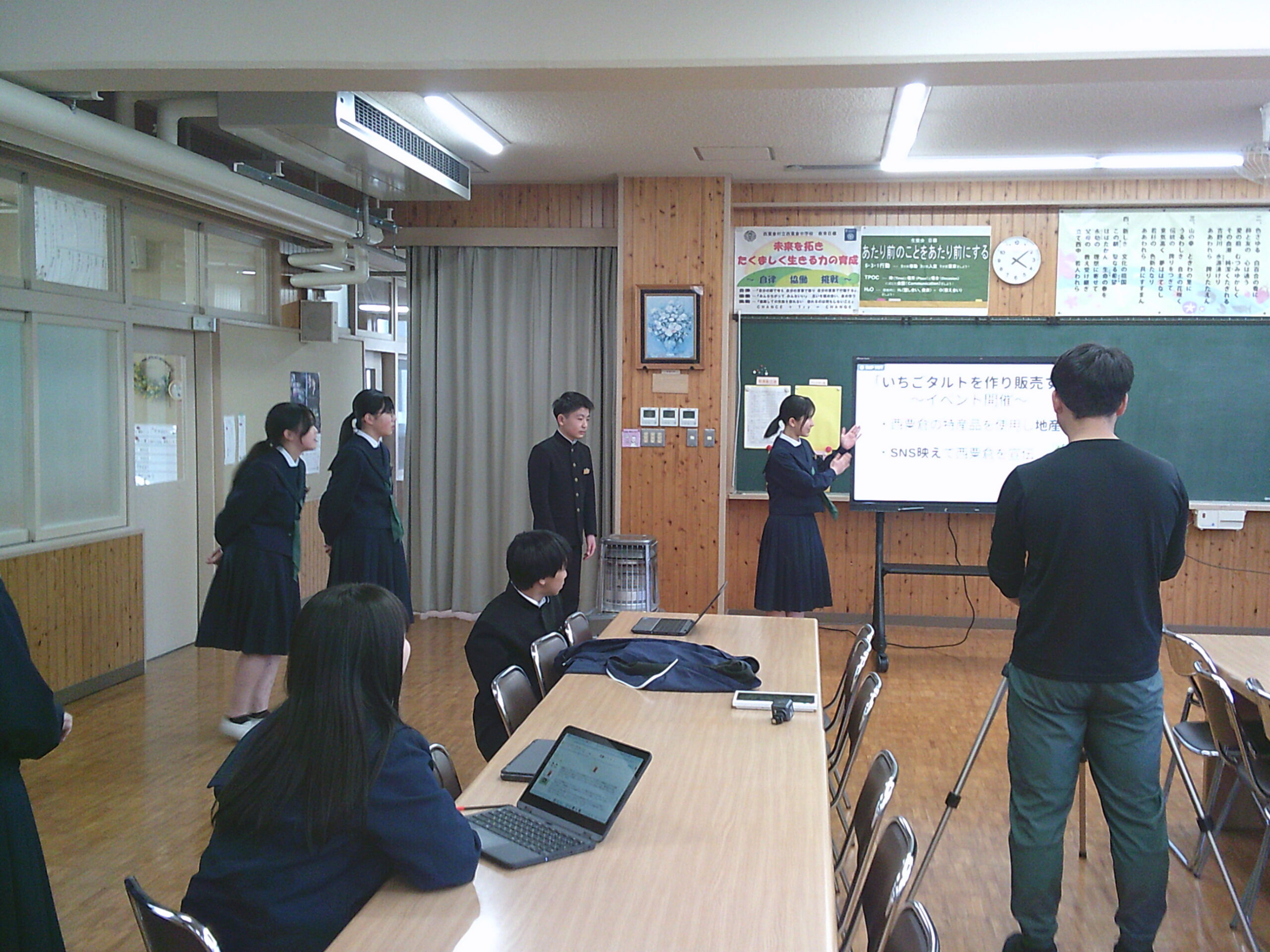 1,2年生はあわくらみらい学で行っている西粟倉村についての様々な探究活動のまとめの一つとして、おかやま学び大賞へのエントリーをしています。今日と来週の月曜の総合の時間はビデオ撮影です。放課後2年生がオープンスペースで撮影に向けて最後の練習をしている姿の横を通る1年生から「先輩はすごいなぁ」との声もでていましたが、緊張する中自分たちの取組と今後に向けての考えをしっかり話していました。2年生の次の目標は具体的な行動です。いちごタルトの製作、宣伝、販売などが順調に進めばいいですね。1年生は3グループがそれぞれエントリーしています。月曜の動画撮影に向け週末にはプレゼン原稿のチェック等頑張ってください。