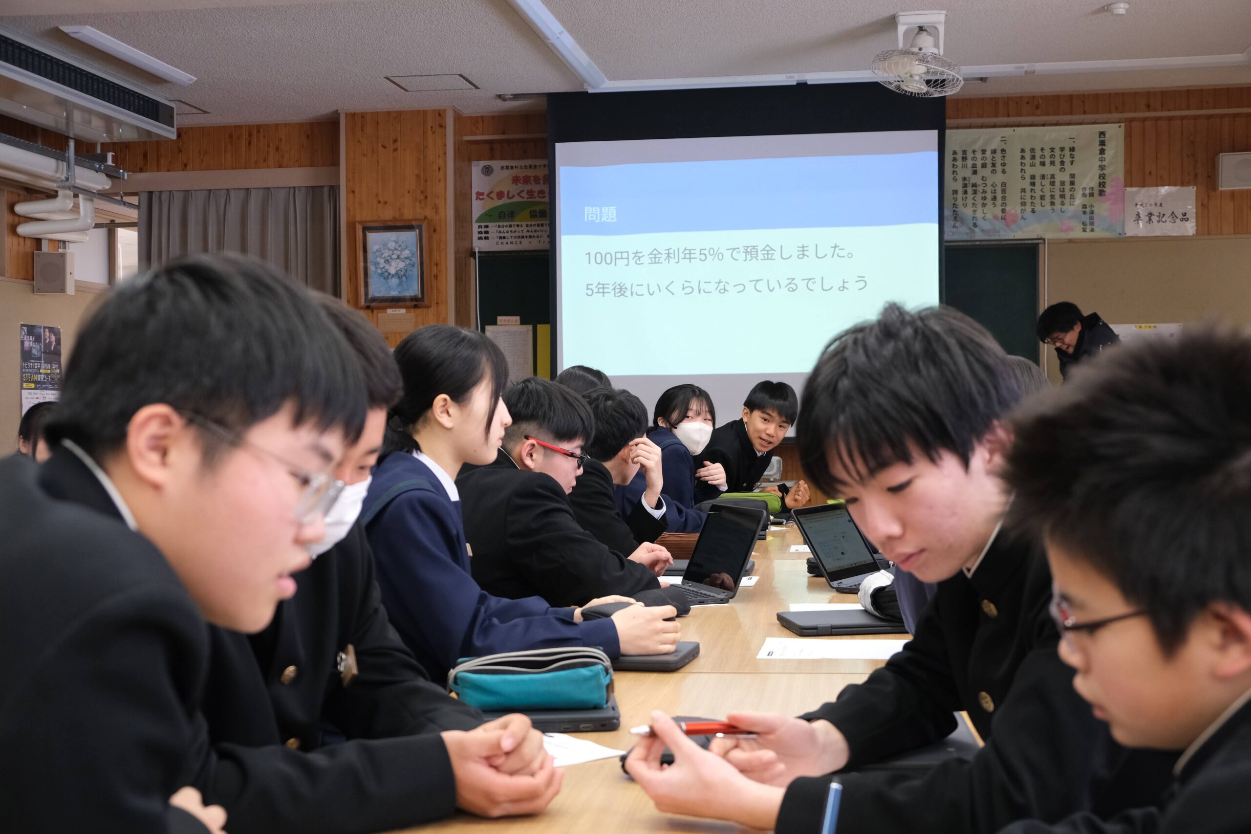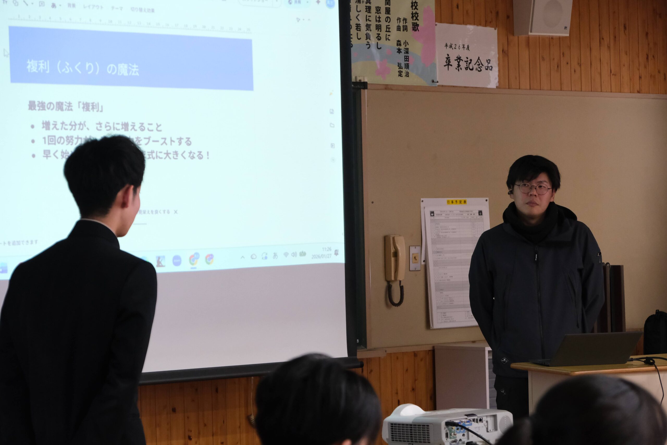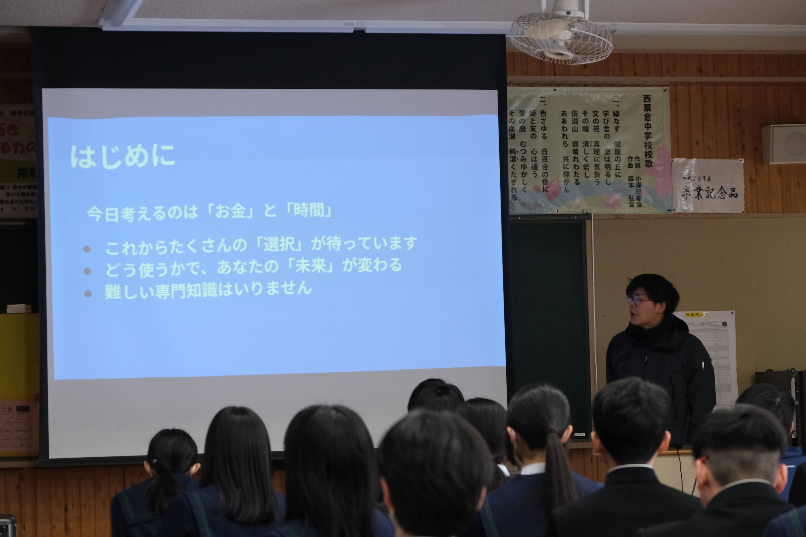 本日の3限は西粟倉事業組合事務局長であり、小松組に勤務されている森本真志さんに来校いただき、「将来に向けてのお金の使い方入門講座」を企画しました。参加者は2,3年生です。森本さんからは、冒頭「今日の話は「お金」と「時間」これから行うたくさんの「選択」で「未来」が変わる」といった話をいただき、どんどん引き込まれていきました。途中生徒達で考える時間もある中、感想を見ていると「①未来の自分を強くする『投資』を選ぶ②小さな約束を守り『信頼』を貯める③努力を続けて『複利』の魔法を使うなど」話をトータルしてまとめている生徒もいました。「今後の自分の生き方」を考える時間にもなった人が多くいましたね。