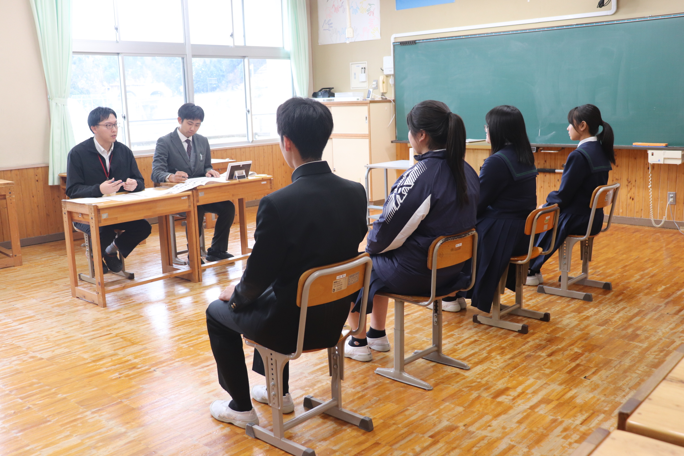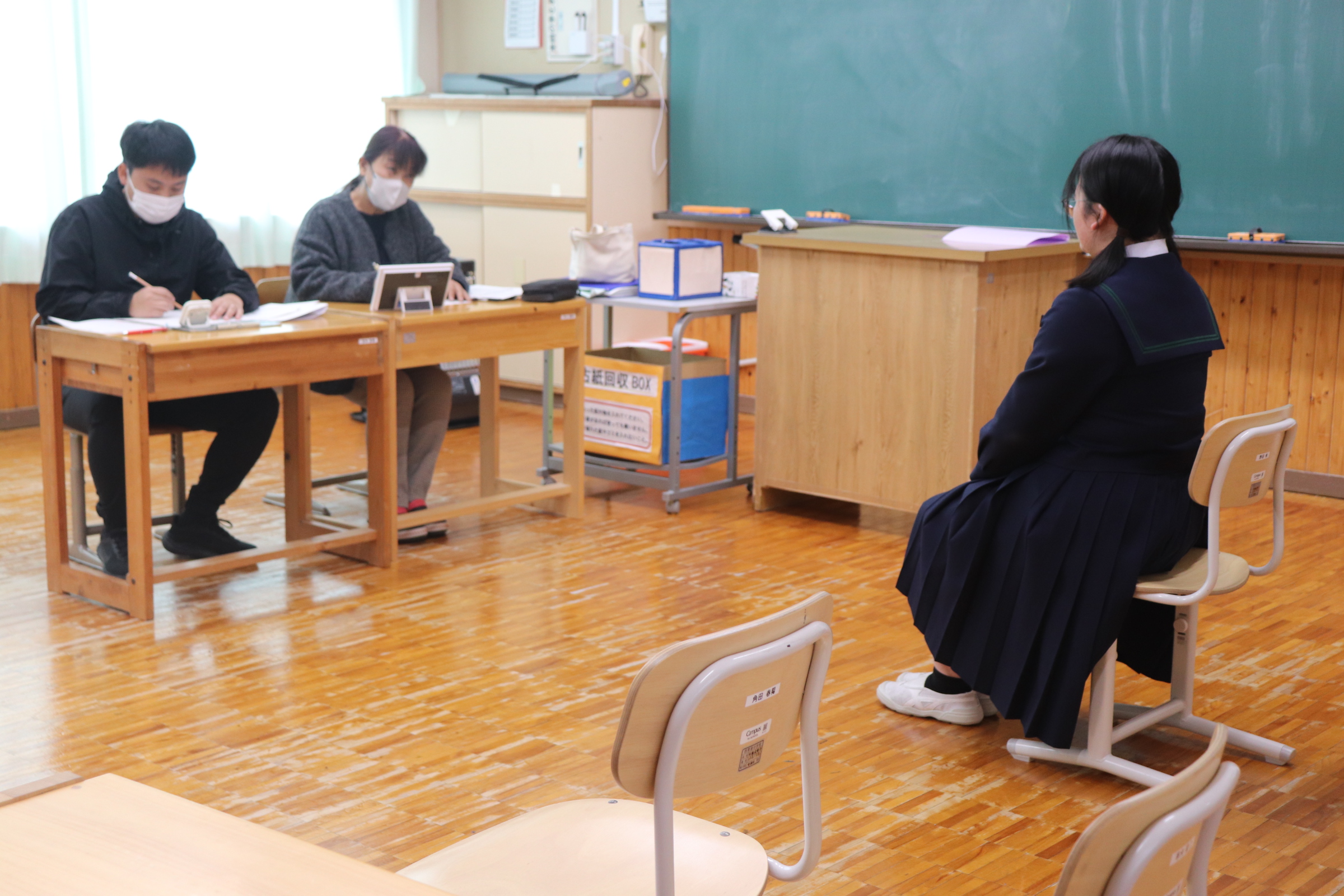 今日の午後は、1,2年生は給食後下校し、全校の先生が面接官となり3年生の面接練習です。今までクラスの中で相互に練習したり、学年の先生と練習してきた基本的な面接での動きや応答について、個人面接、集団面接を実際に実施しました。面接官をした先生からは、自分の進路実現に向け、しっかり考えてきている人が多いとか、動きもしっかりしていたという声を次々聞きました。ただ、再度面接練習した方がいいところも若干見えてきています。まだ時間はあります。個人的に不安な人は何回でもトライして、本番を迎えてください。