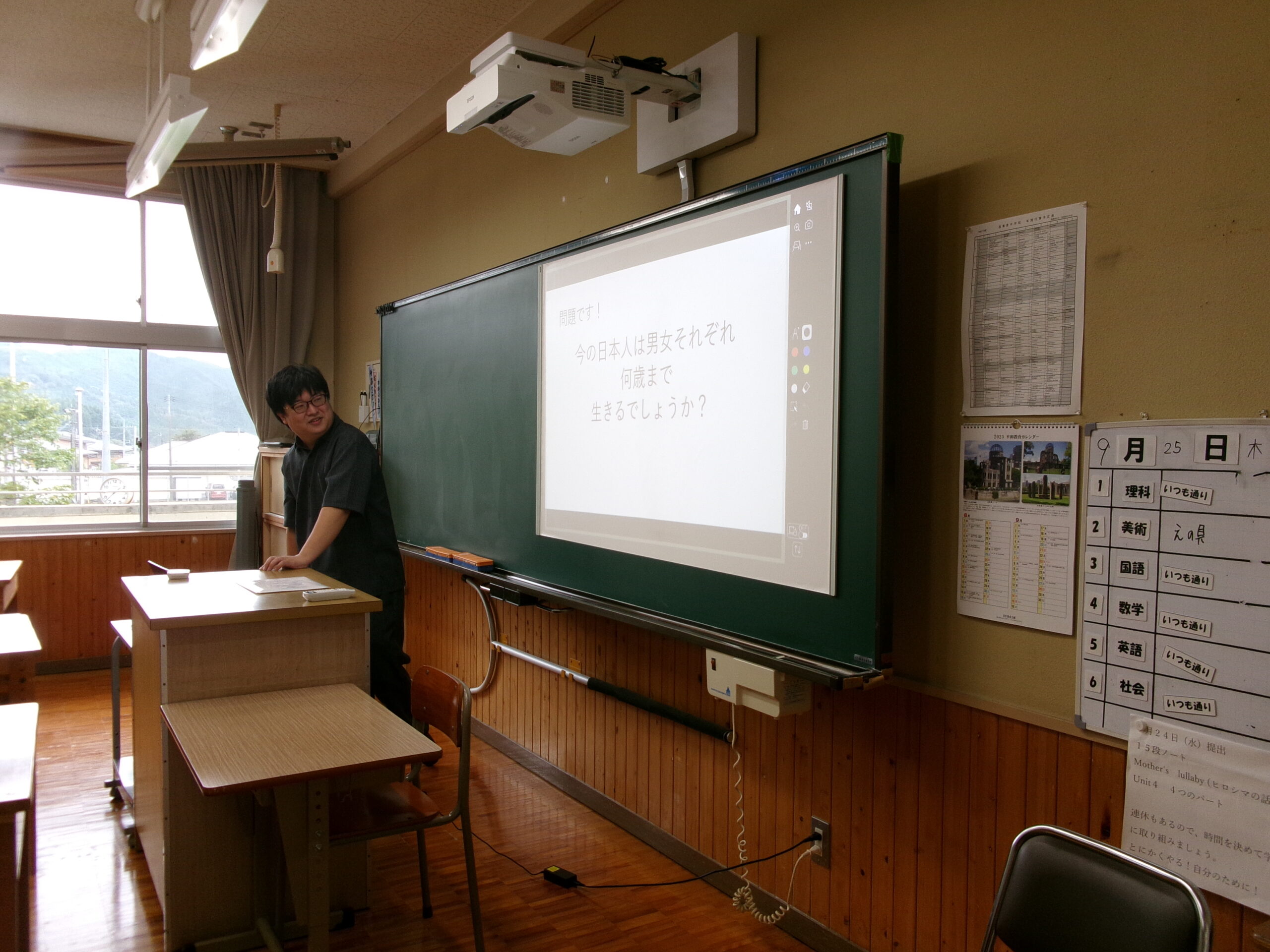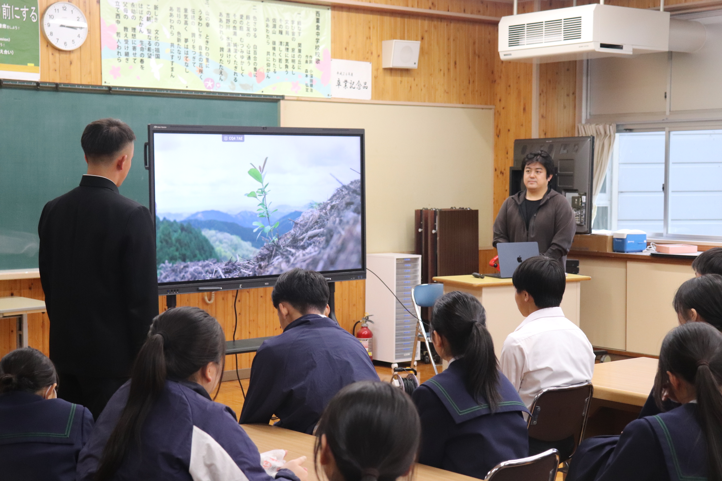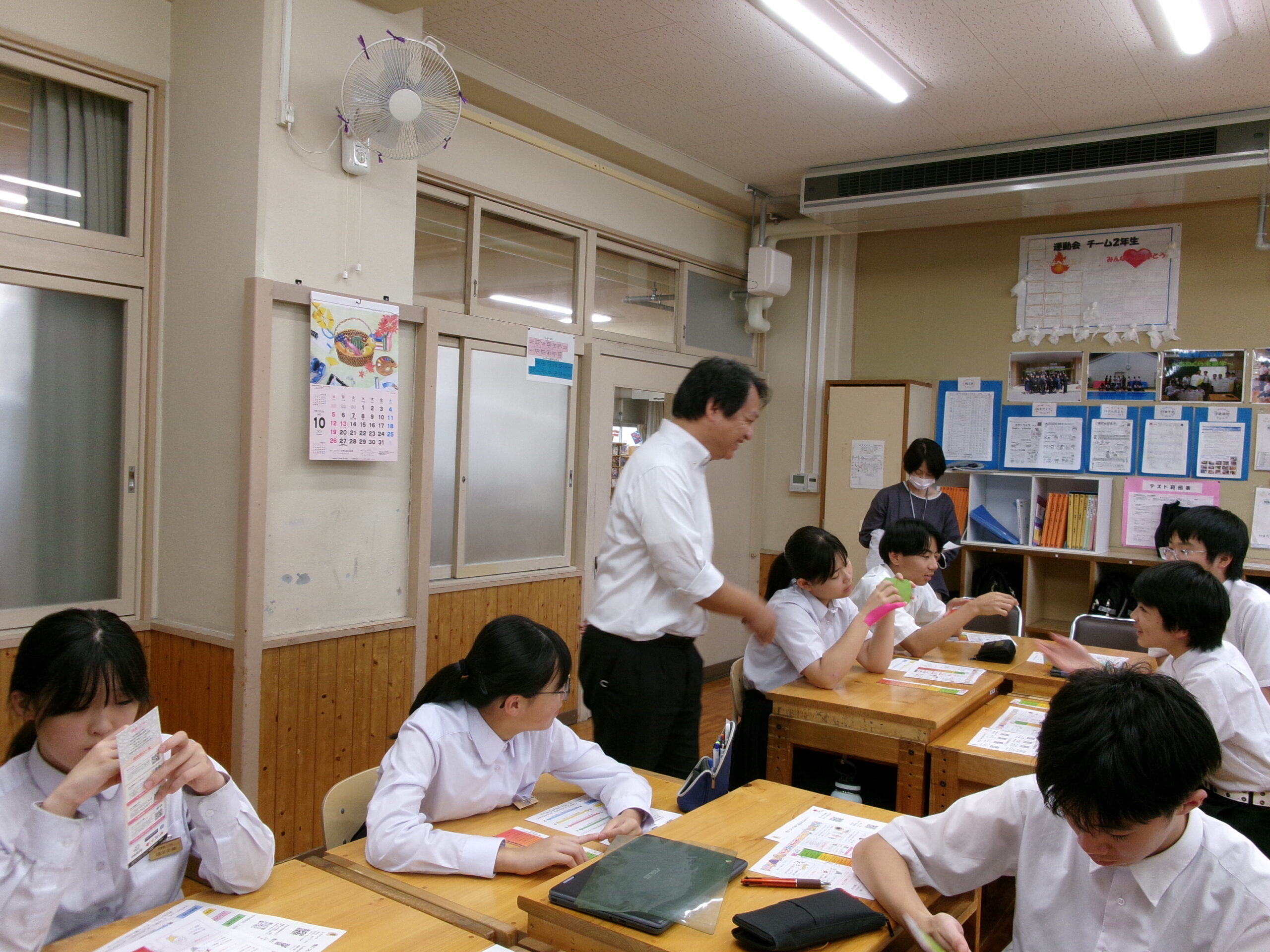 学校医でもある、西粟倉診療所所長の河本先生から、3年生を対象に授業をしてもらいました。授業は、ピロリ菌についての学びを通して、自身の健康意識の向上や、がん予防、がん検診に対する意識向上を目的としています。途中、胃カメラで撮影した胃の映像から、健康な胃はどれなのかをクイズ形式考えたり、ピロリ菌に感染した場合の除染方法を聞く場面もありました。西粟倉村では、村が希望する中学生にピロリ菌の抗体検査を実施しています。一人一人が、自分の健康について関心をもって生活できるきっかけになったのではないでしょうか。