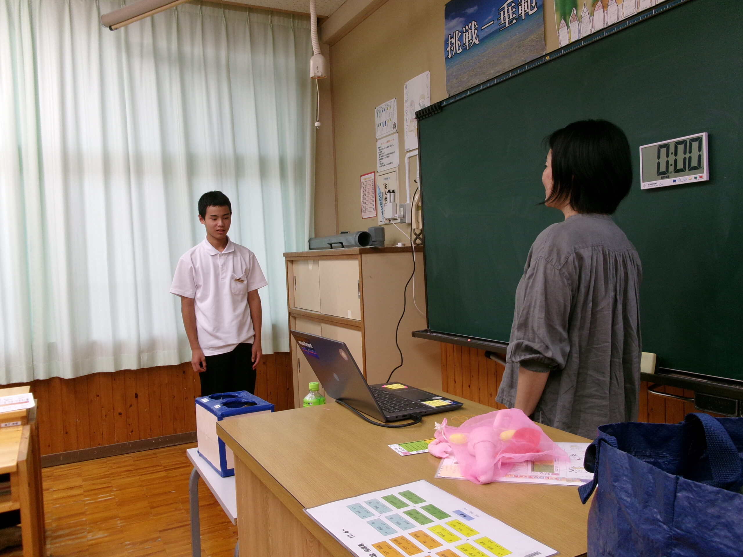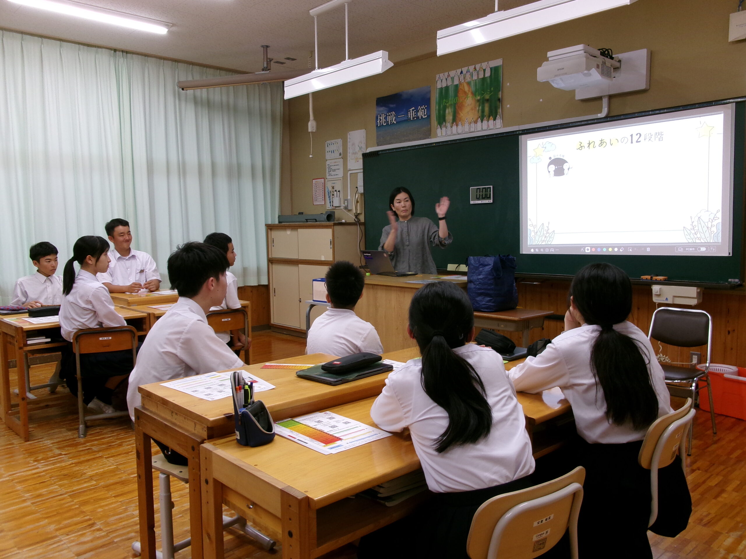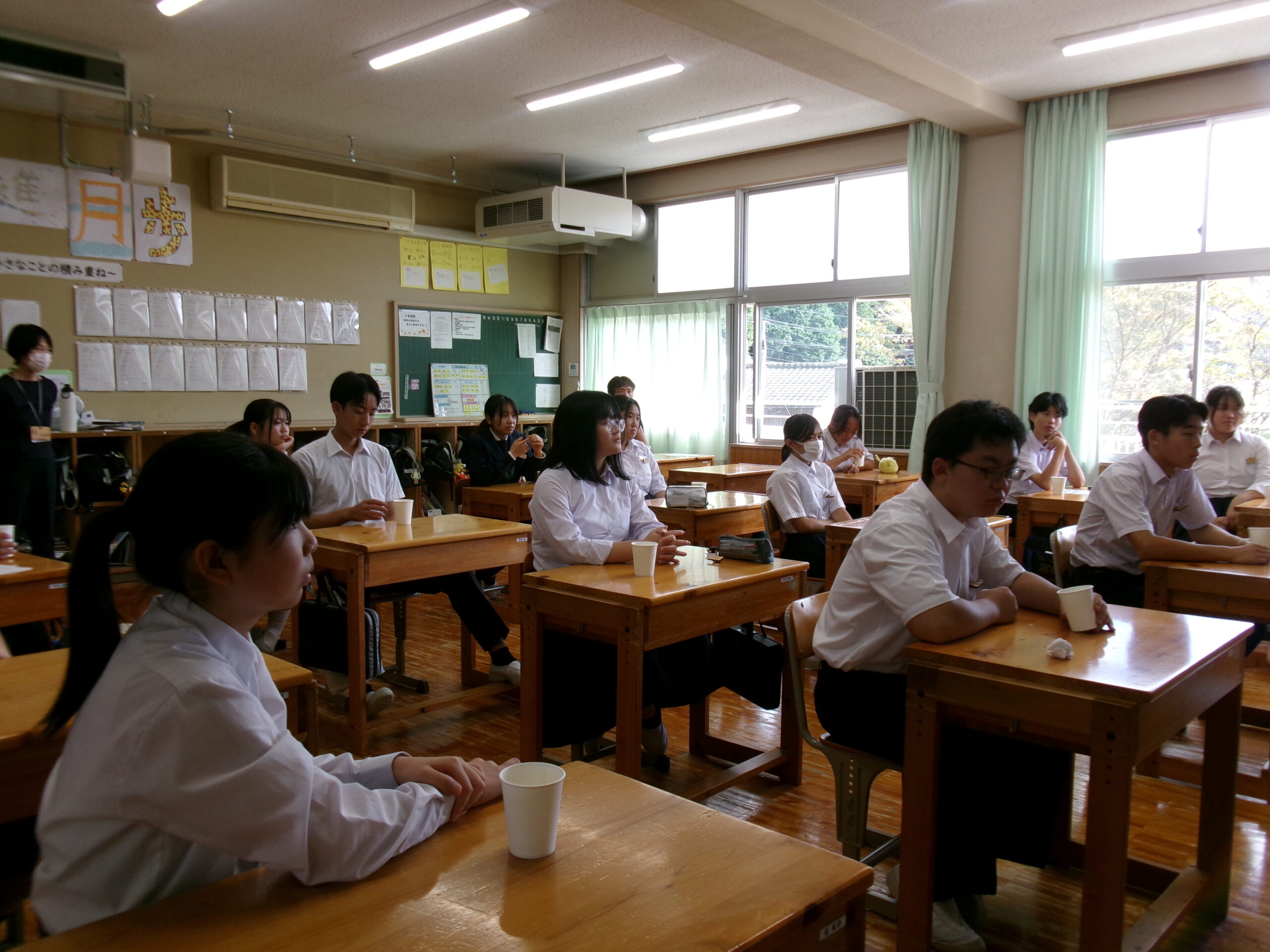 学校医でもある、西粟倉診療所所長の河本先生から、3年生を対象に授業をしてもらいました。授業は、ピロリ菌についての学びを通して、自身の健康意識の向上や、がん予防、がん検診に対する意識向上を目的としています。途中、胃カメラで撮影した胃の映像から、健康な胃はどれなのかをクイズ形式考えたり、ピロリ菌に感染した場合の除染方法を聞く場面もありました。西粟倉村では、村が希望する中学生にピロリ菌の抗体検査を実施しています。一人一人が、自分の健康について関心をもって生活できるきっかけになったのではないでしょうか。