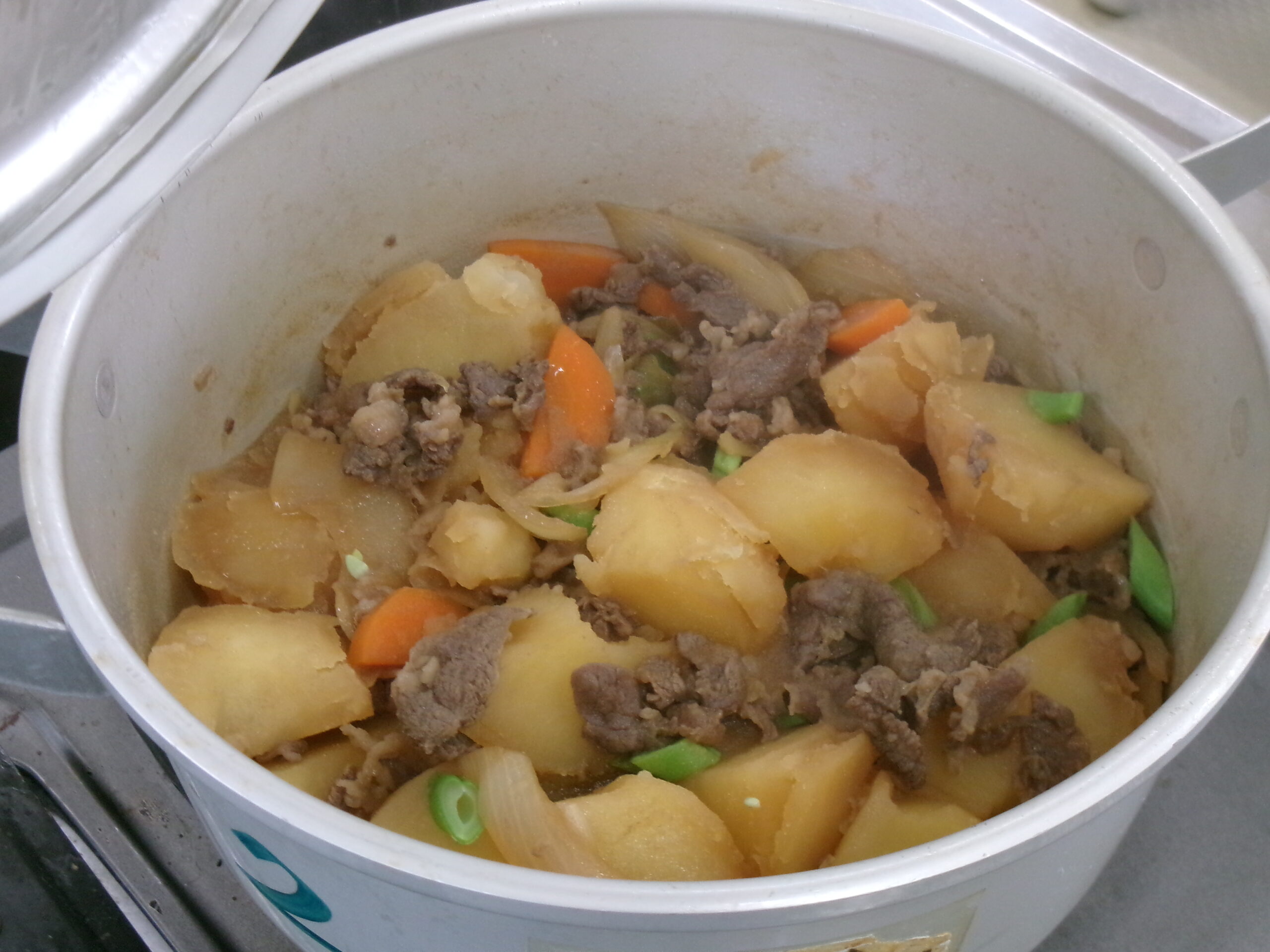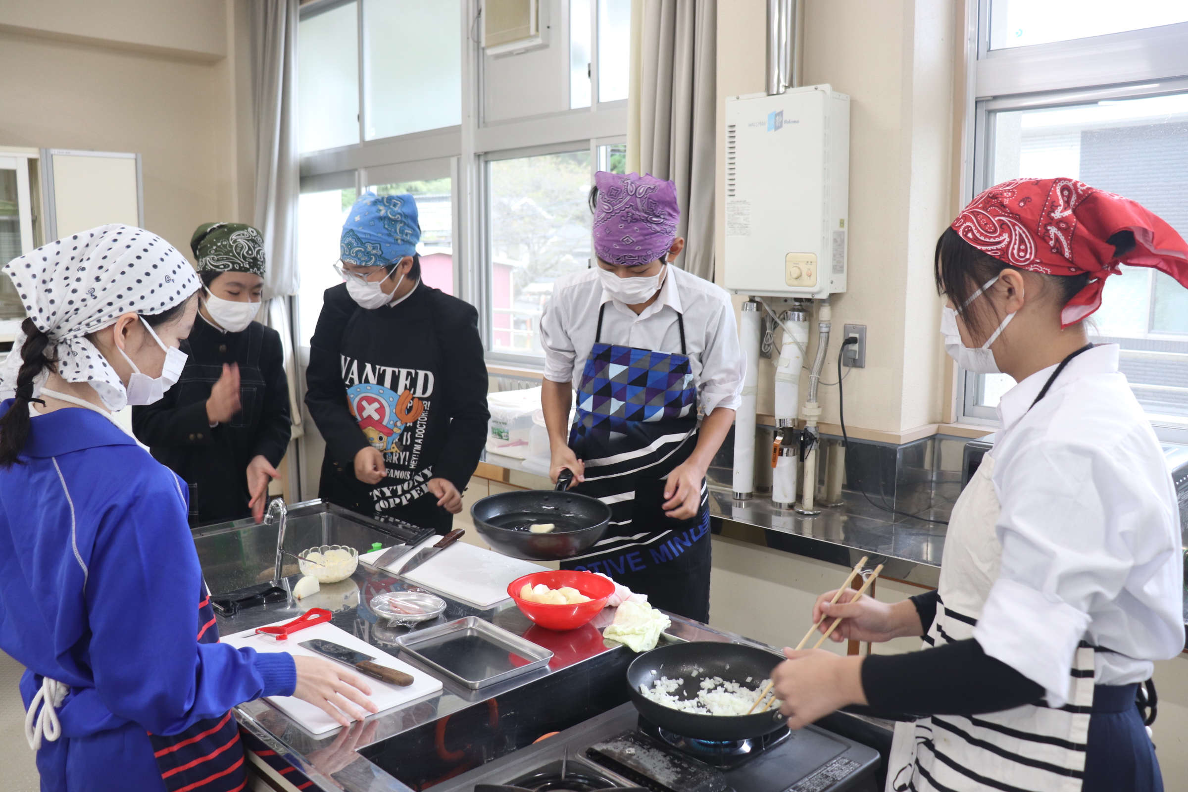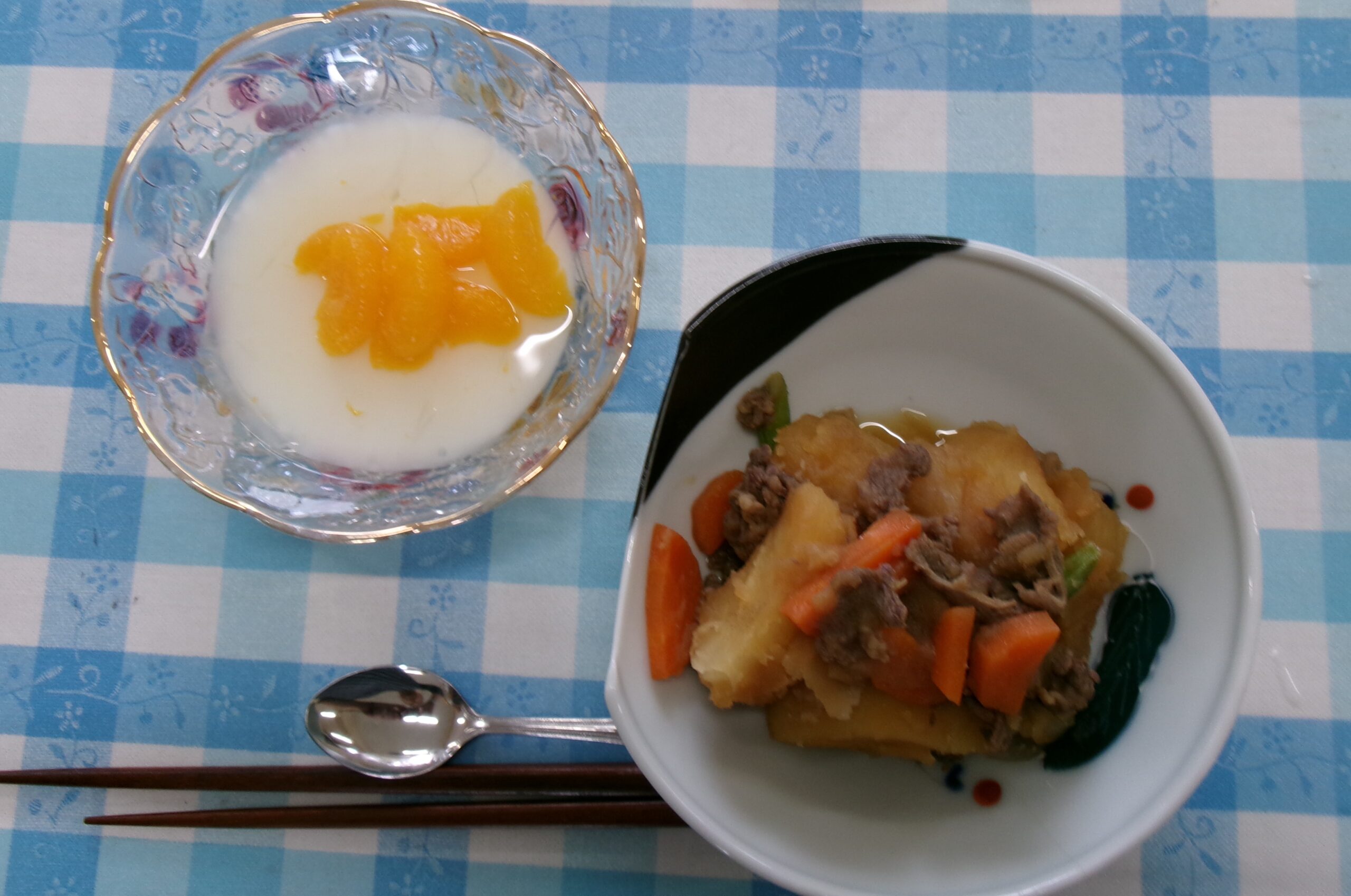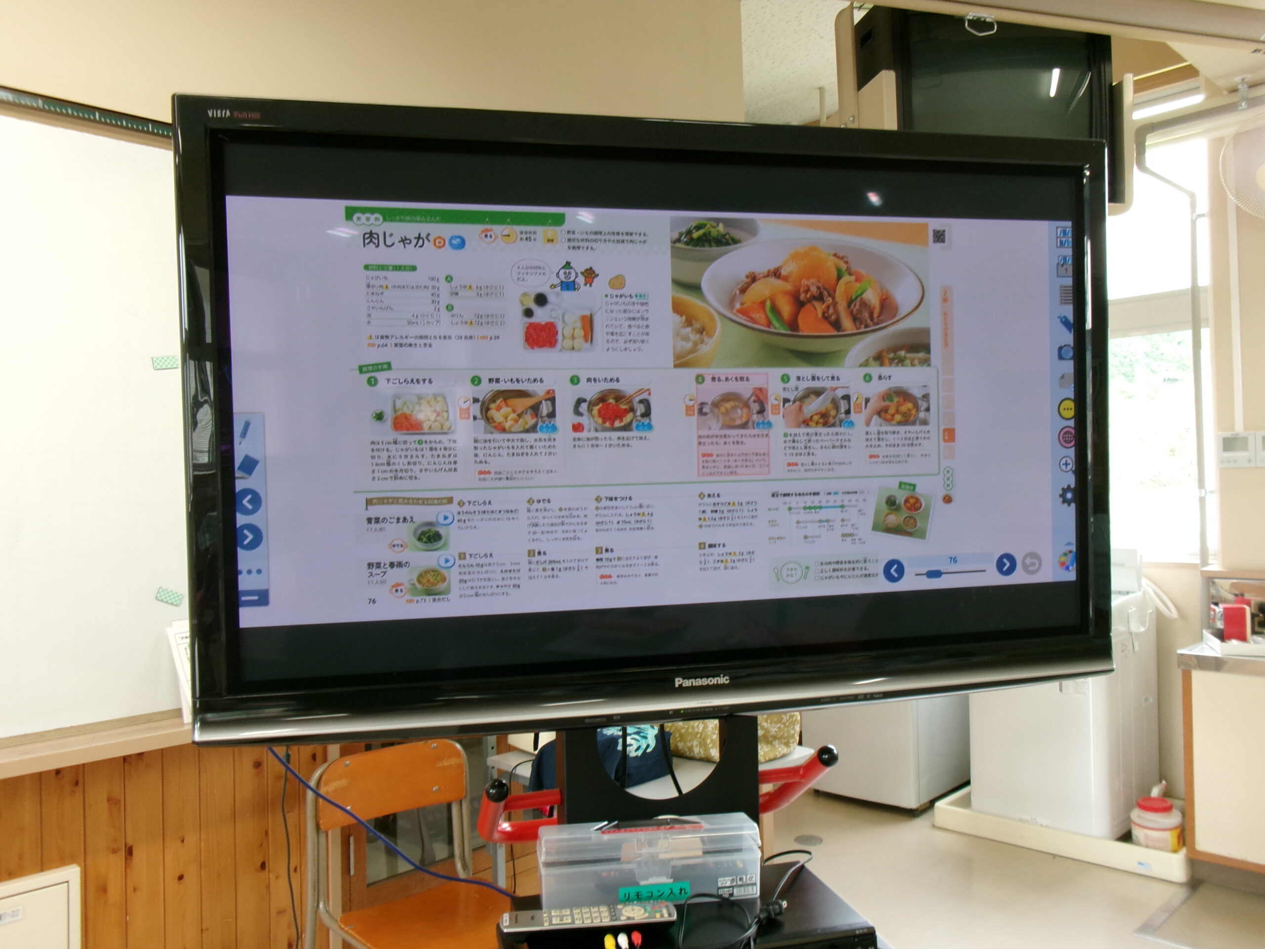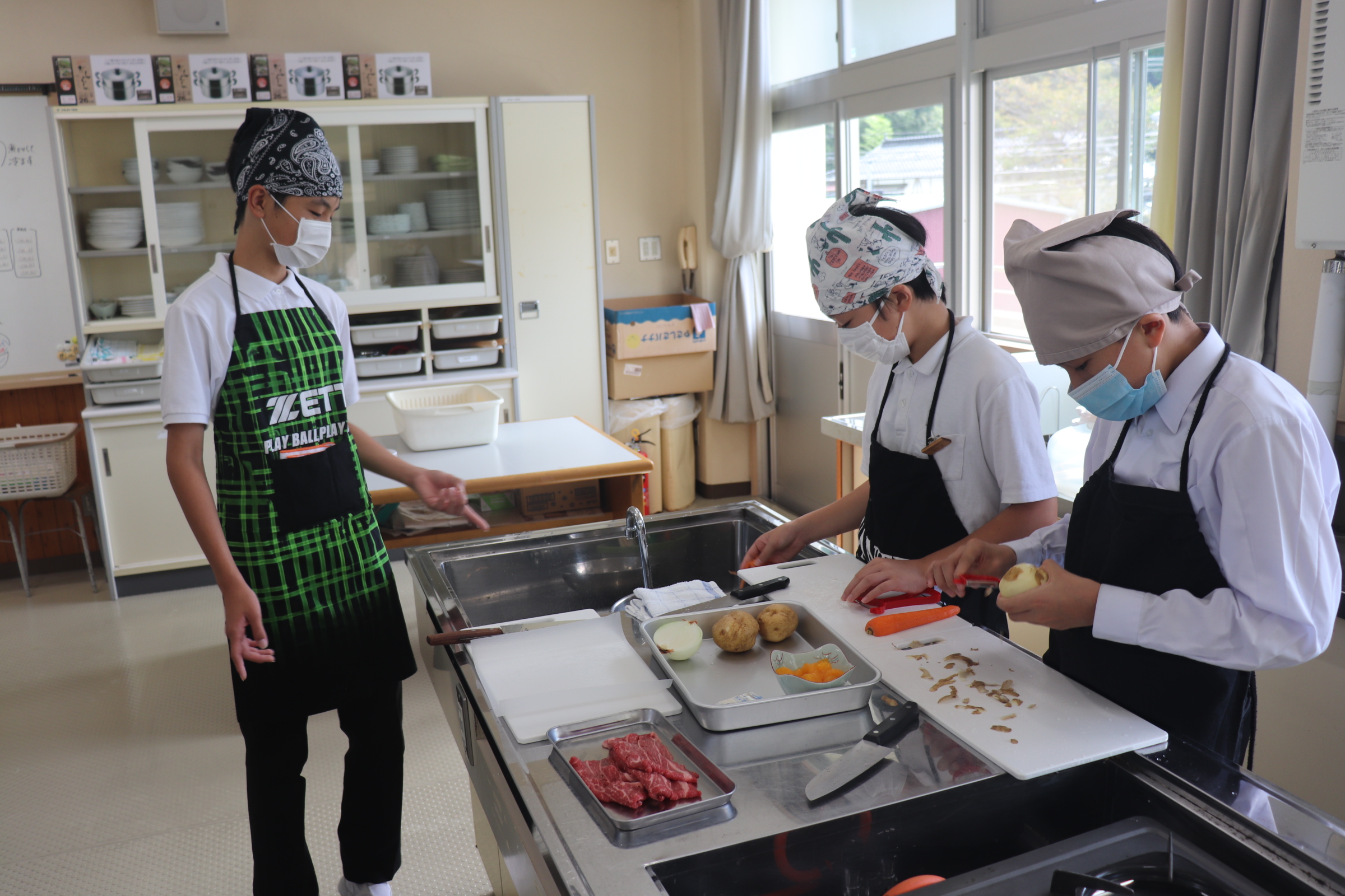 | 1年生の2,3時間目は調理実習です。デジタル教科書で実習の手順を確認しながら「肉じゃが」と「牛乳寒天」を作りました。素敵な包丁さばきの生徒やぎこちない手さばきの生徒など、みんなで協力しておいしいご飯ができました。これで家でも立派なおかずの一品ができますね。