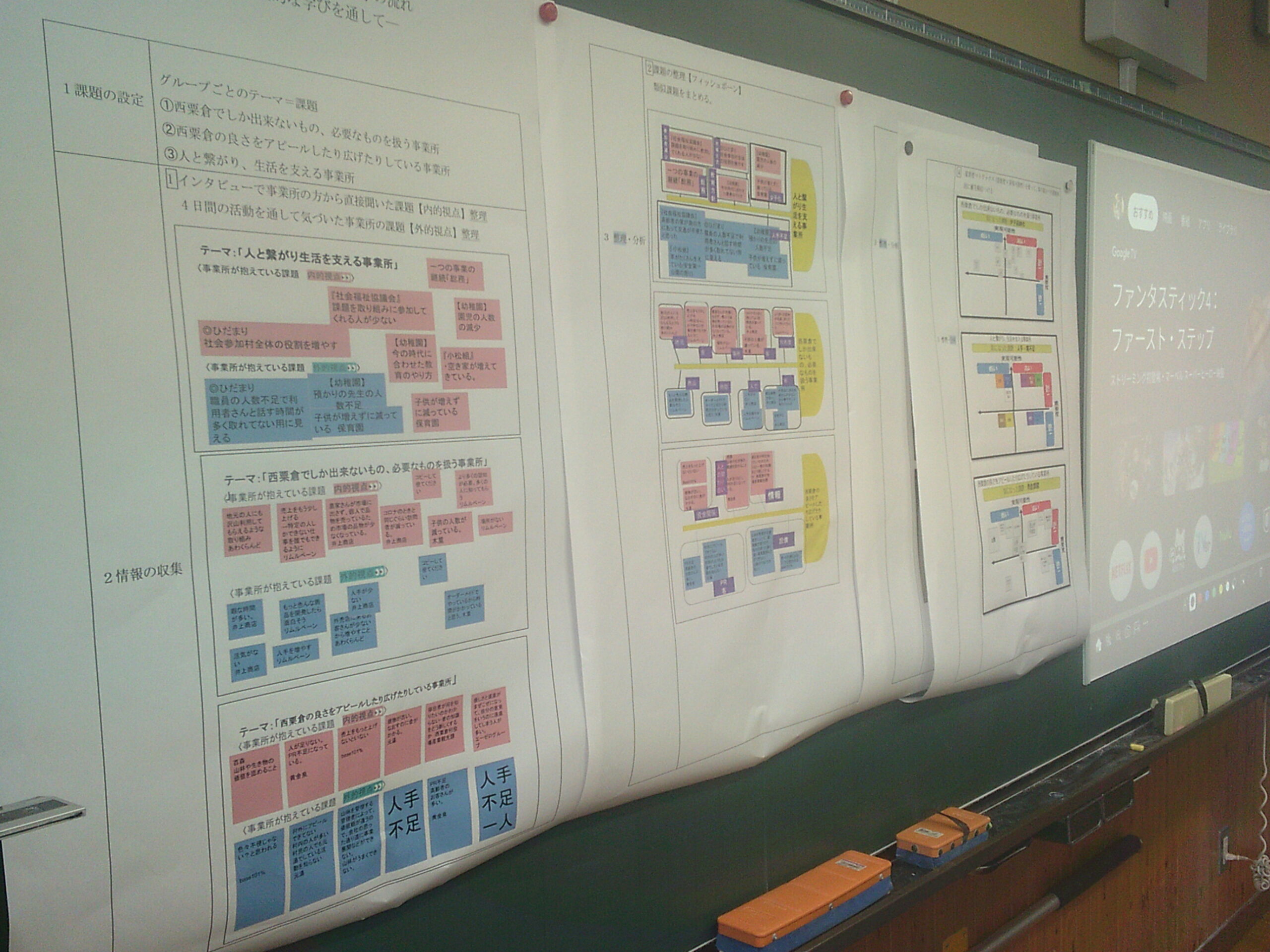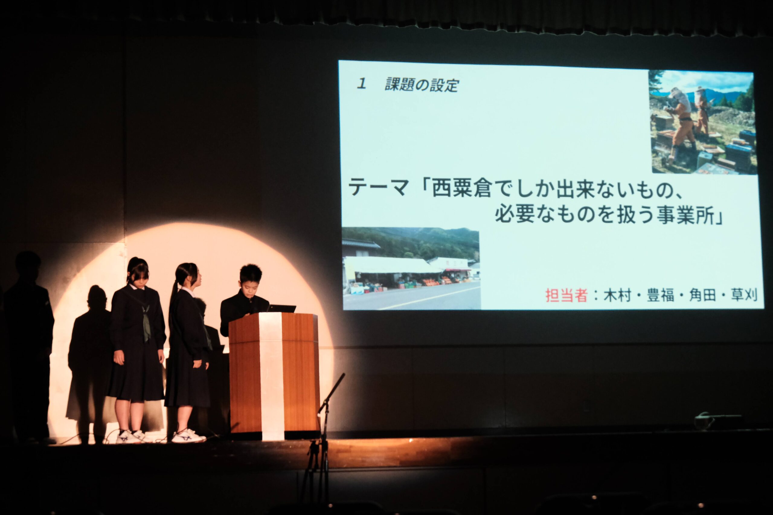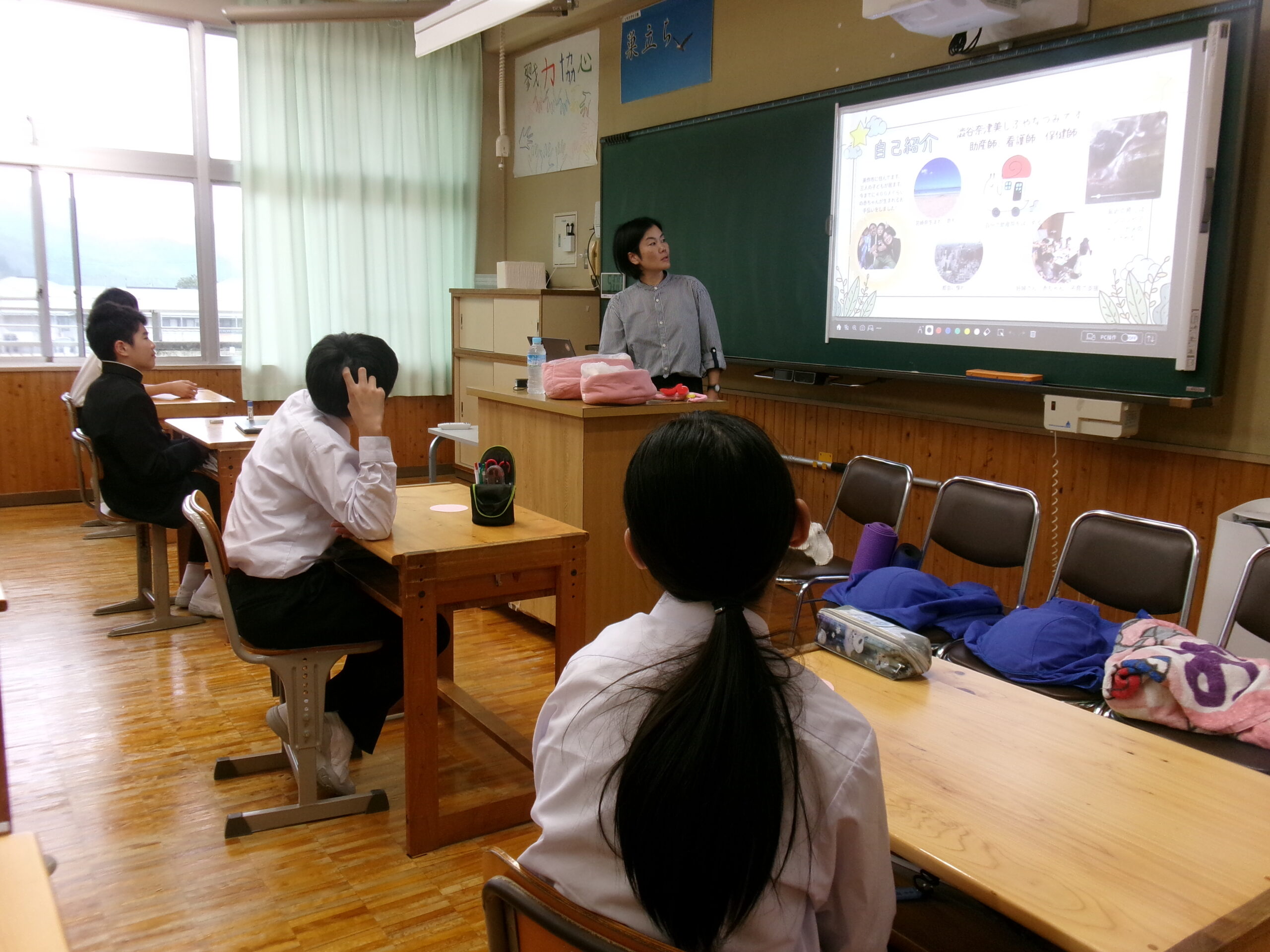 中国5県の学生が「国際協力と地方創生」をテーマに西粟倉村でフィールドワークを行い、「海外にも通じる西粟倉村の魅力」について授業をしていただきました。授業後、生徒のグループに学生も加わり、発表内容の理解を深めるとともに、西粟倉村のすばらしさを再確認していました。