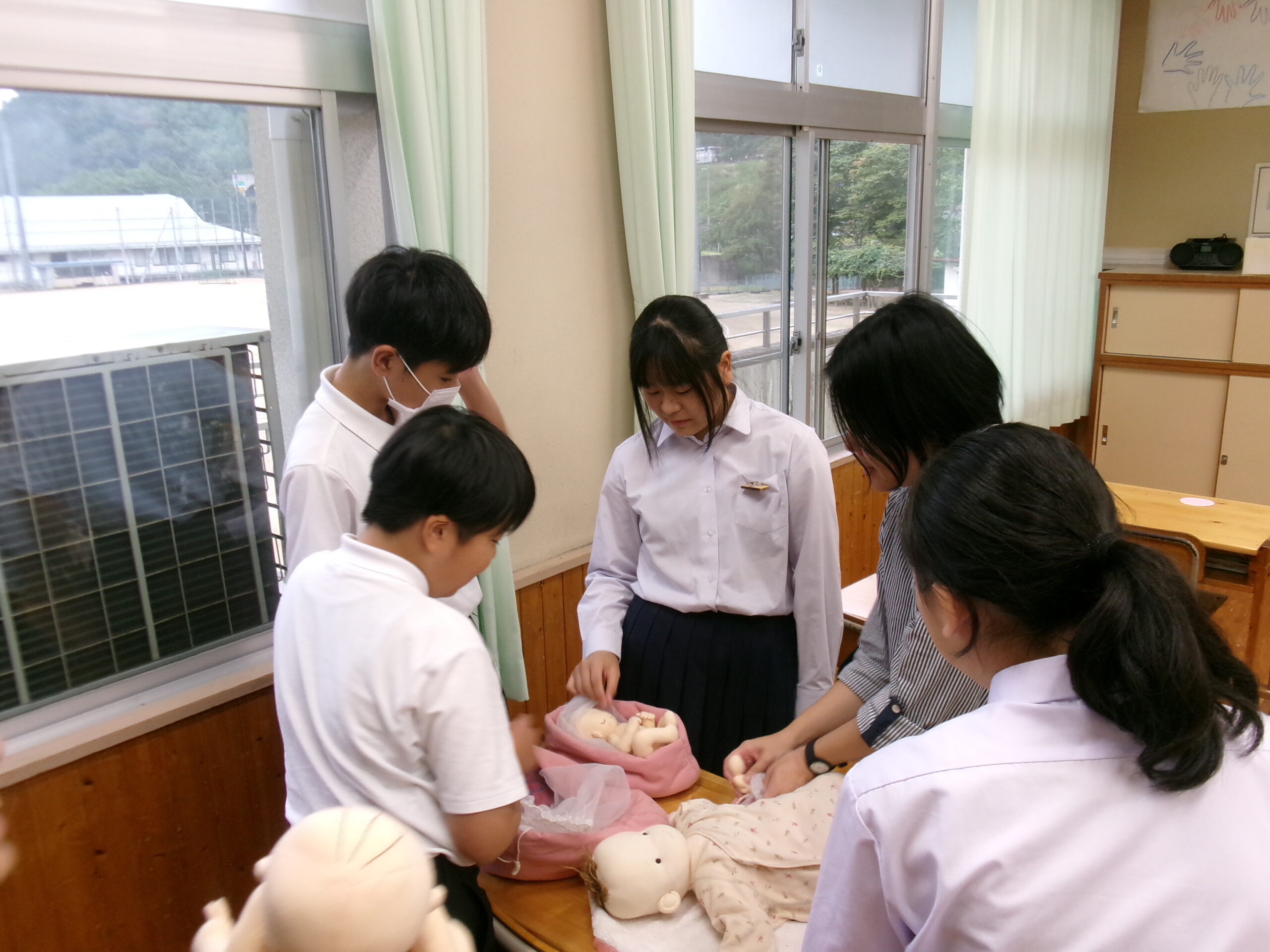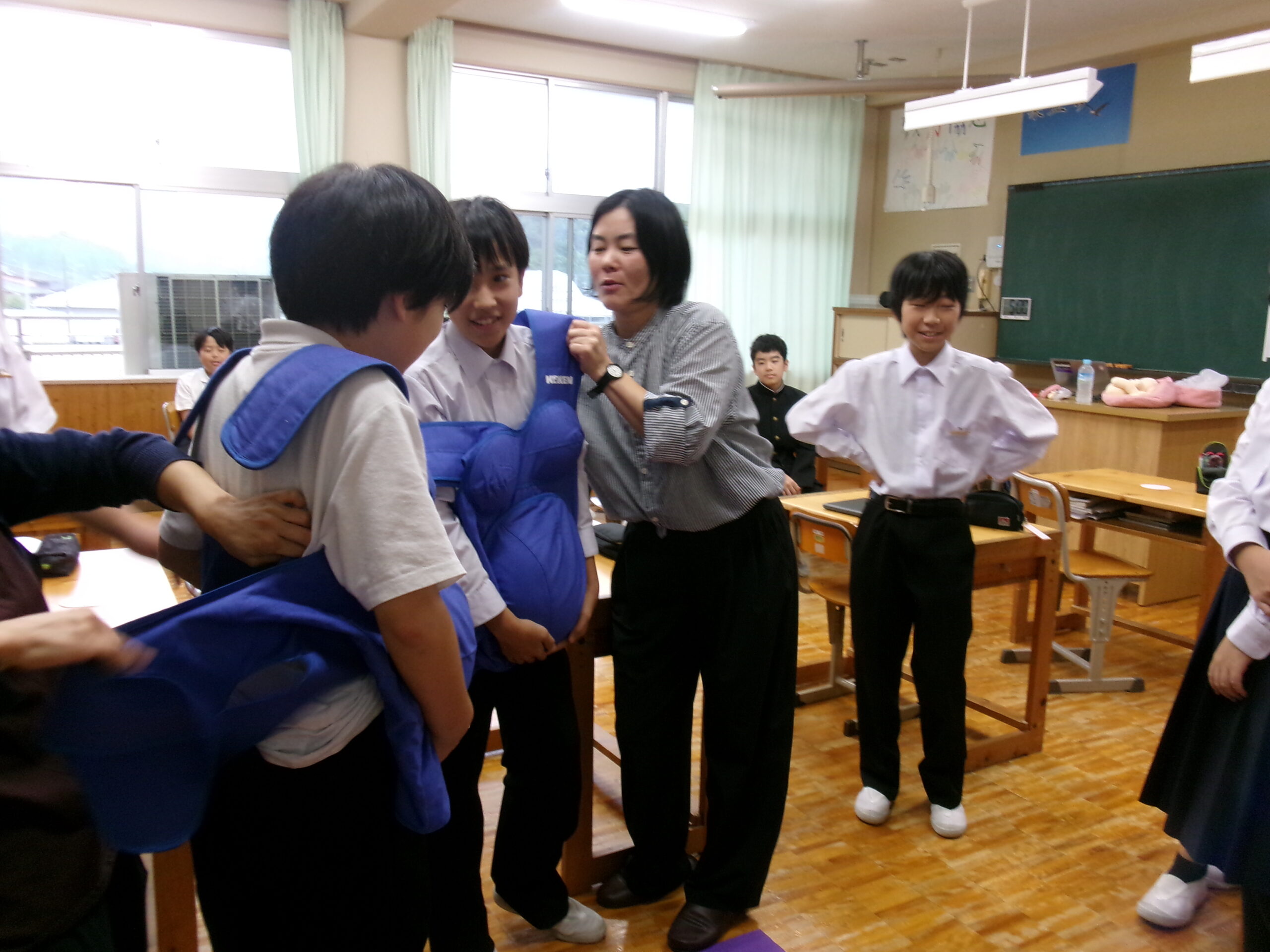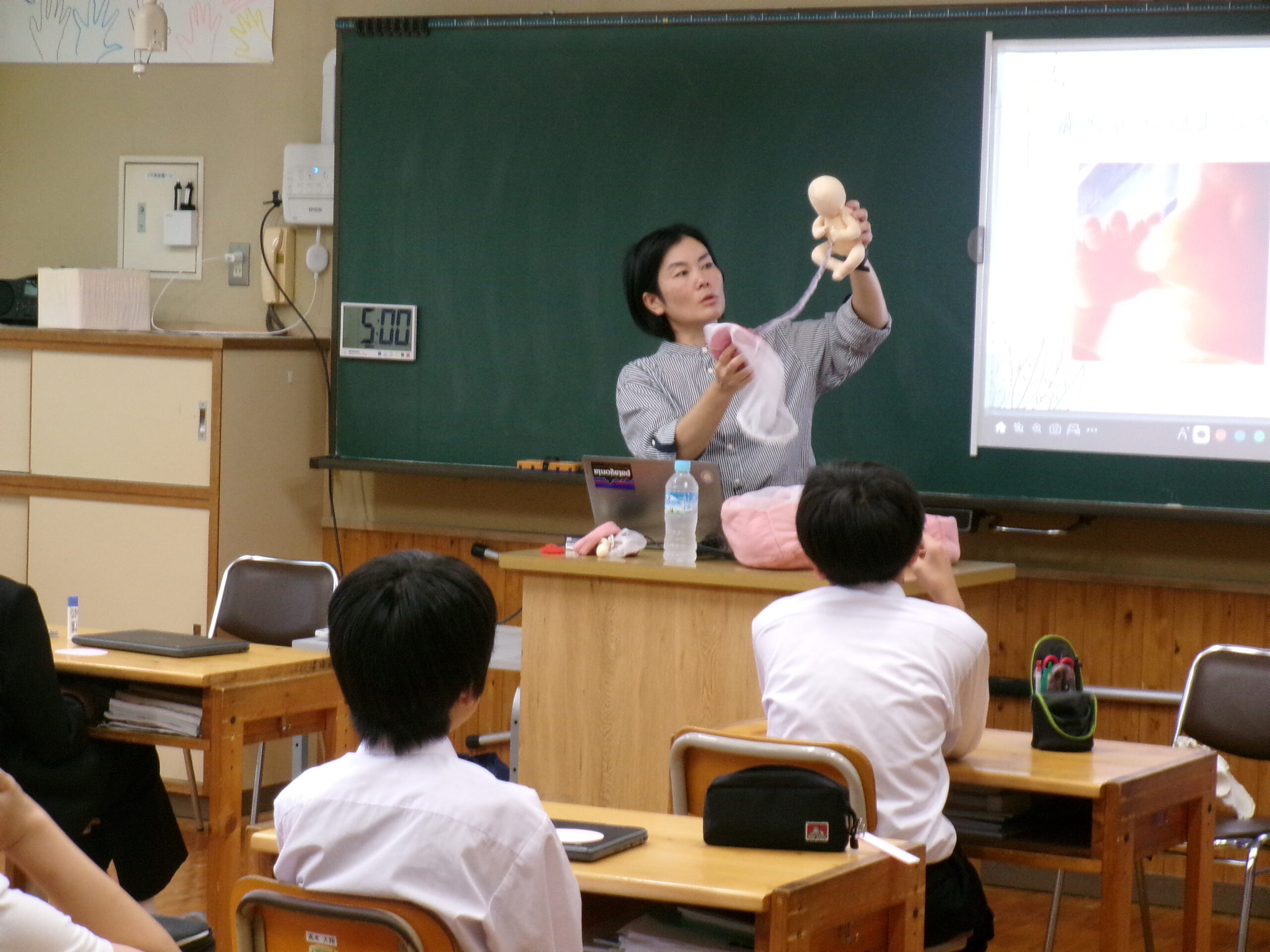 1年生の6時間目は性教育の時間です。1年生は「命の大切さ」を大きなテーマとして思春期の心や体の変化、妊娠、出産について学習します。この授業は出張専門かたつむり助産院から澁谷奈津美先生を講師に迎えての授業です。授業後の生徒は、「(妊婦体験をして)「重っ!」って思いました。妊婦さんが大変なことが分かった。」「これで寝ている妊婦さんはすごいと思った」「赤ちゃんが結構重たくてびっくりした」などの感想を記していました。
