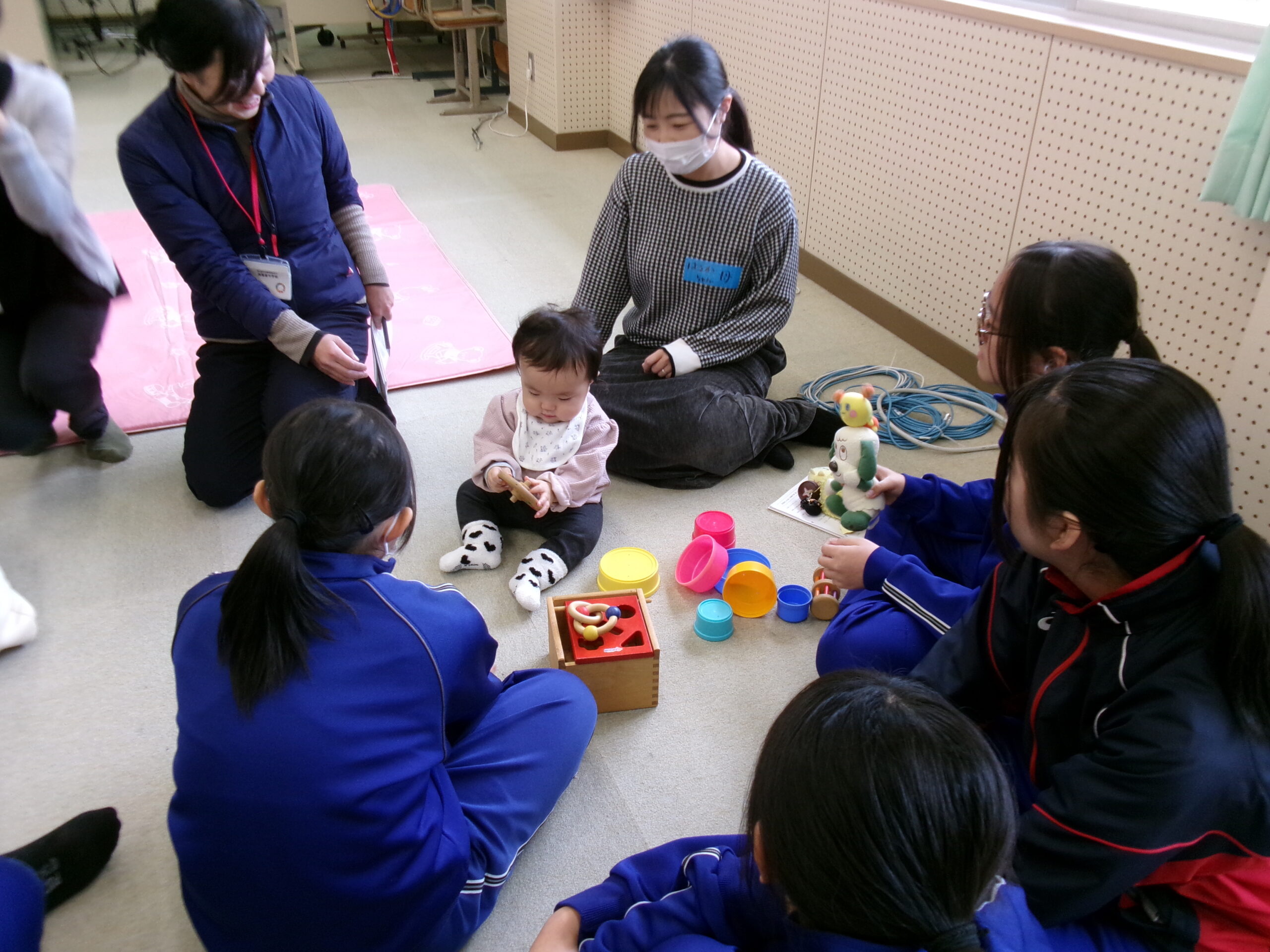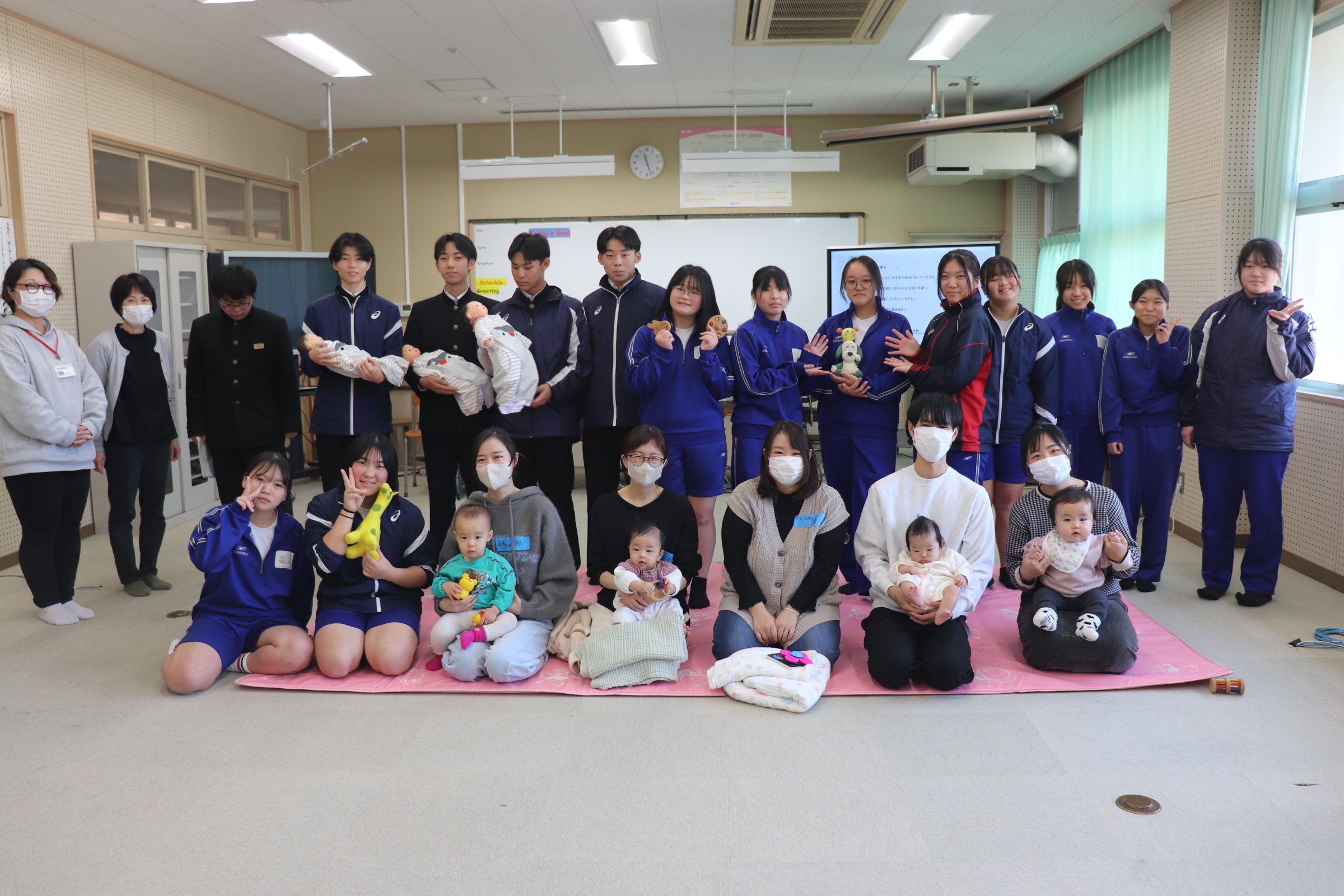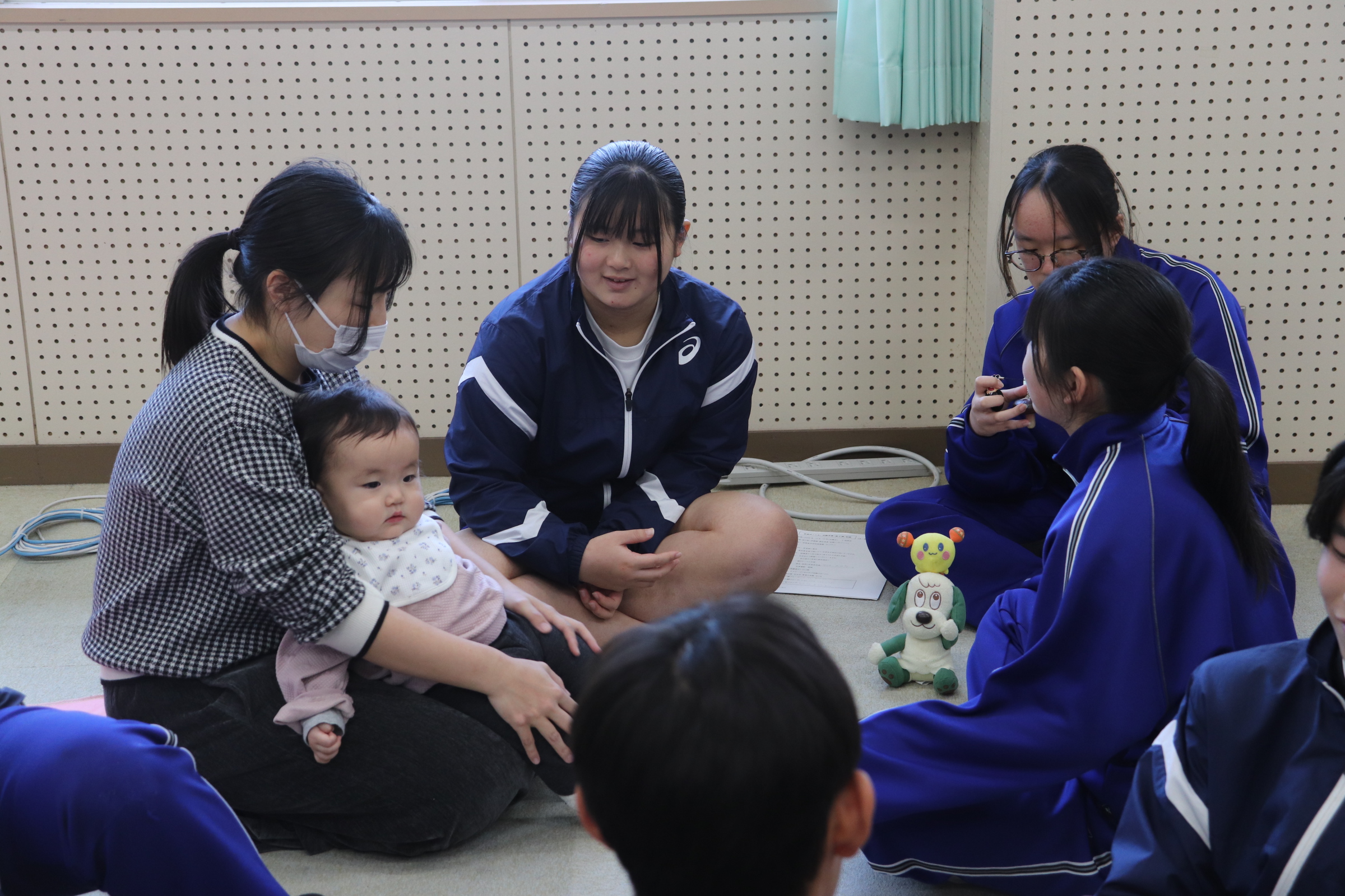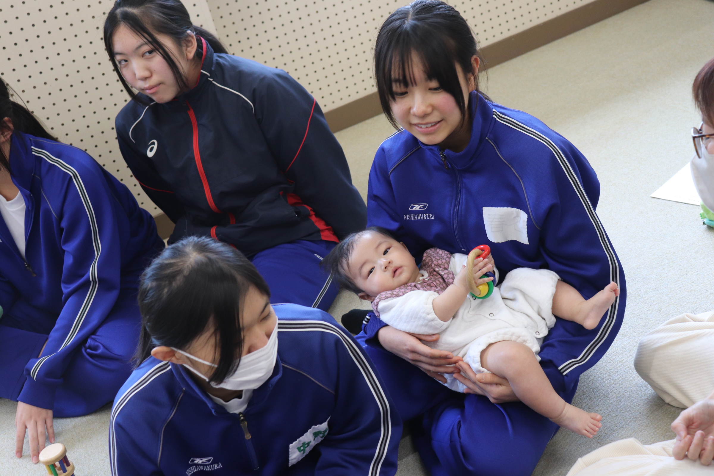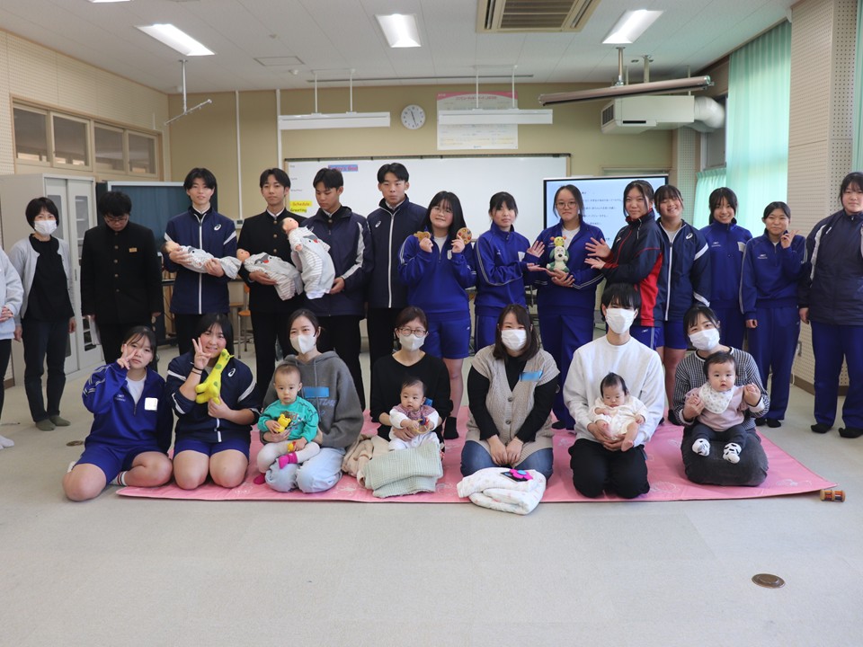 西粟倉保育園の横にある、つどいのひろばBambi(バンビ)さんの協力のもと、地域から4家庭の乳幼児と保護者に来校していただき、3年生がふれあい保育体験を行いました。小さな兄弟がいない家庭で育った多くの子どもたちは、初めはかなり緊張し、ぎこちないふれあいからスタートしましたが、最後には、乳児も中学生も保護者の方も笑顔で終わることができました。今回の経験を通して、自分たちも大切に育ててもらってきたんだということを実感したり、将来、自身が子育てをする際に意識することへの理解に繋がればと思います。