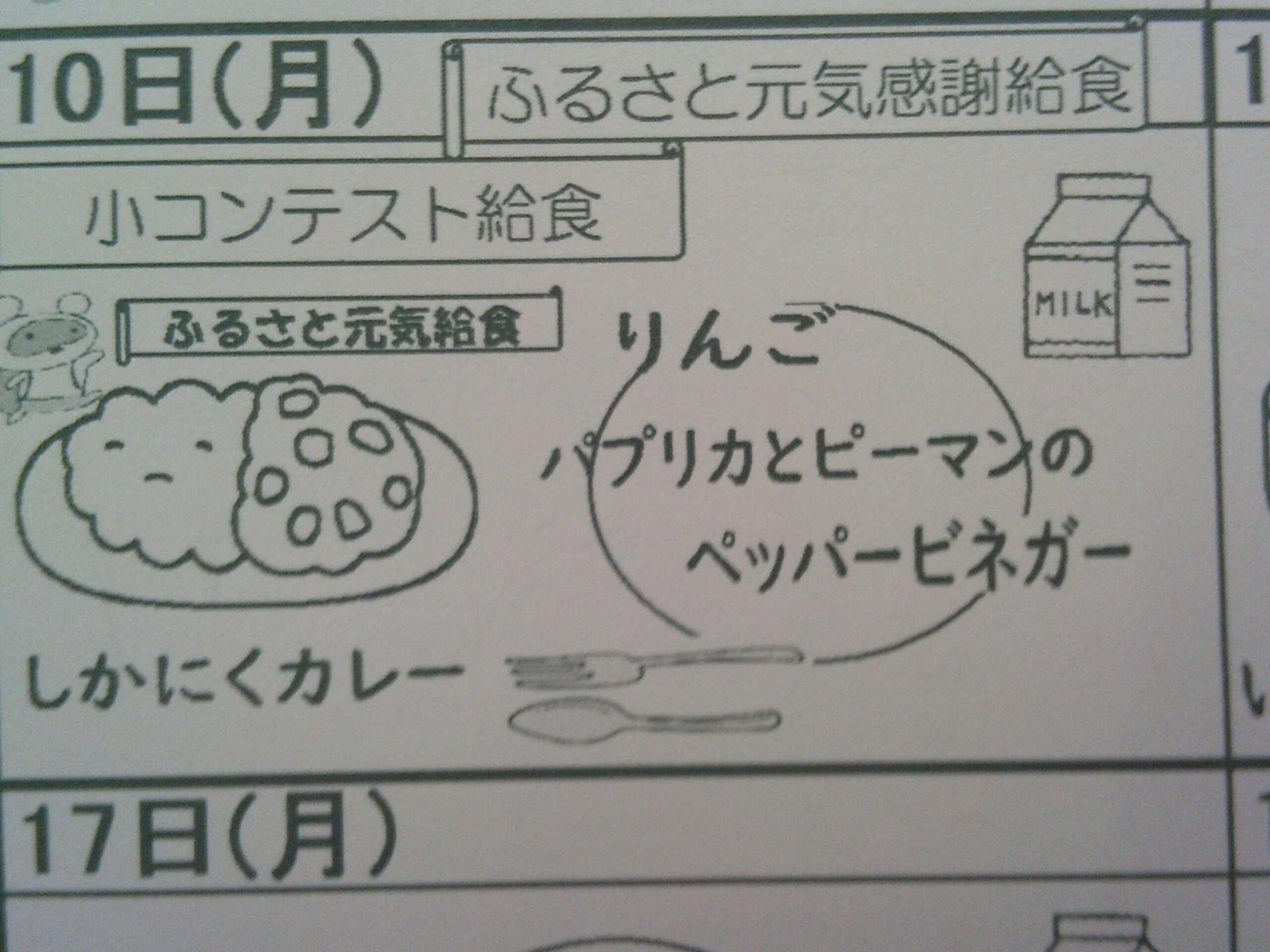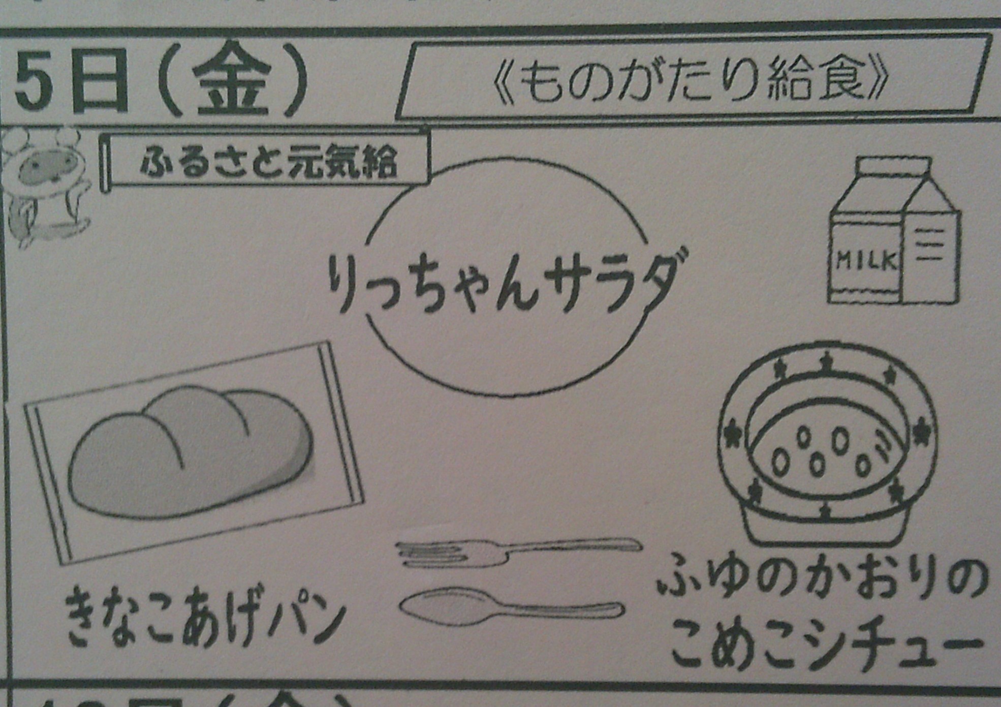 今日の給食は、西粟倉小学校1年生の朗読「サラダでげんき」から 「りっちゃんサラダ」の登場です。1年生が頭に登場人物のお面をかぶりながら、必死で朗読している映像を見ながら、おいしくいただきました。朗読終了時には、「拍手」も沸き起こり、温かいシチューがより温かく感じたひと時でした。