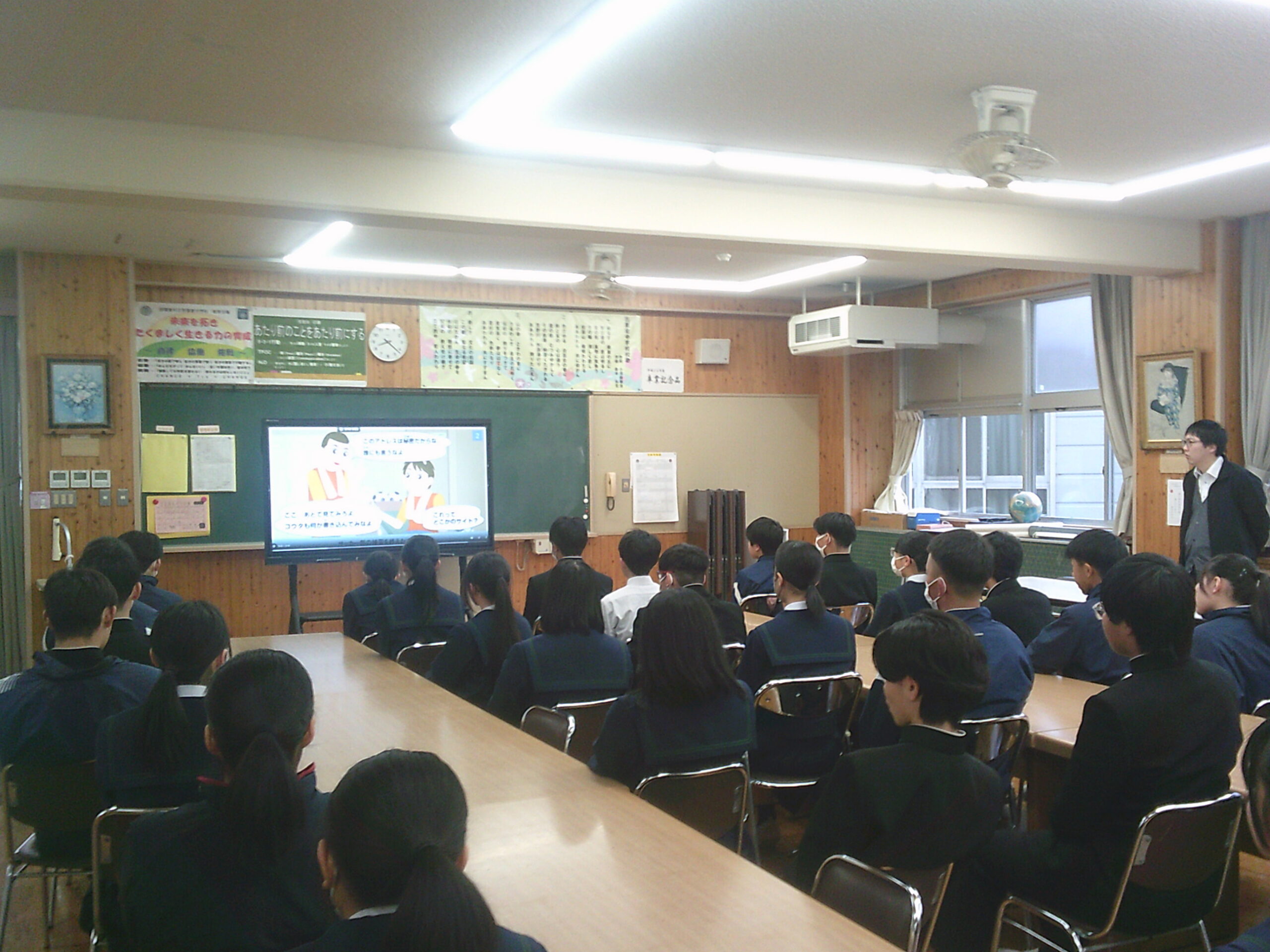 ネットトラブルを未然に防ぐためや正しいネットモラルの知識を学ぶために、毎学期末には全校で情報モラル教育を行っています。17日にはSNSでの書き込みについて、18日にはフェイクニュースについて学びました。事後の感想からは、「掲示板やSNSに人の悪口を書いても、結局誰にもメリットはないので、その様な行為はしない。」とか「顔が見えないから何でも言っていいとかの考えを持ってしまわないようにしたいと思った。」「最近フェイクニュースとかよく聞くので、1つの情報だけではなく、たくさんの情報を見るようにしたい。」「自分も騙されて拡散して被害を広げないようにしたい」などの声があがっていました。