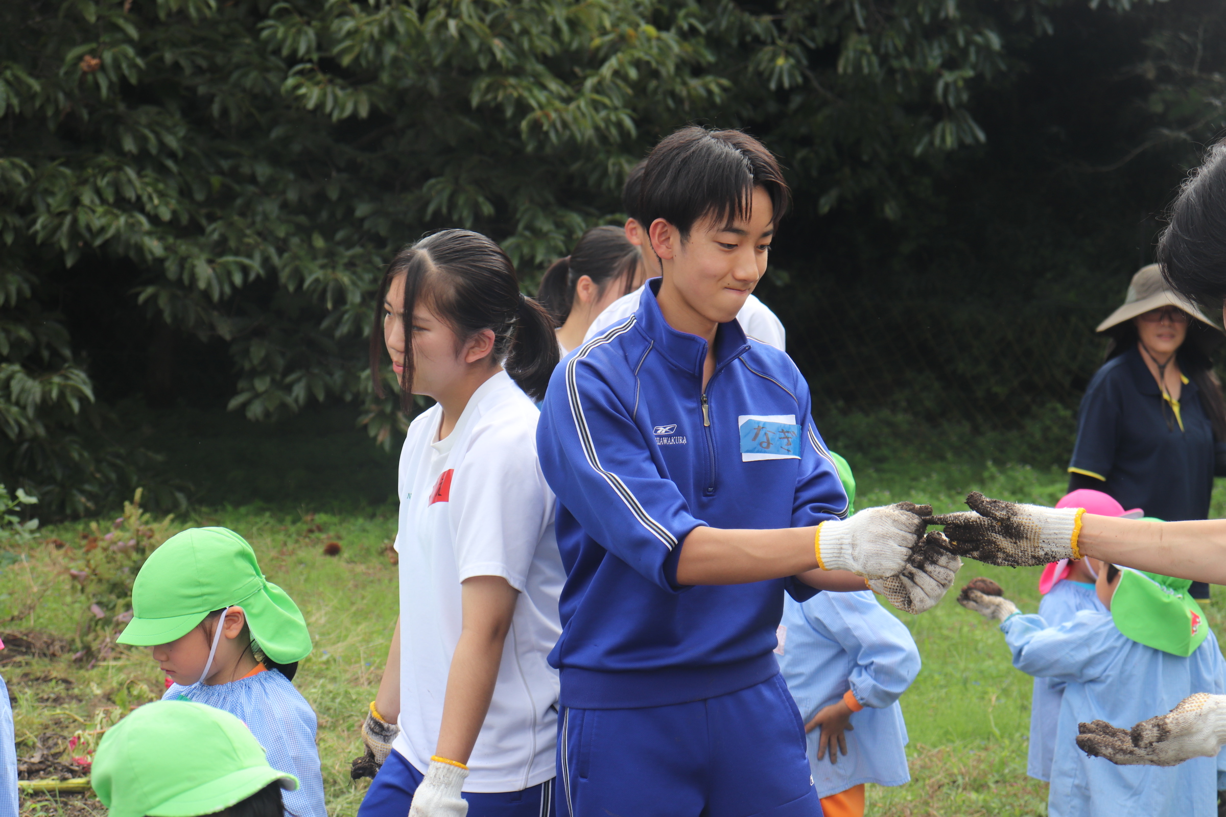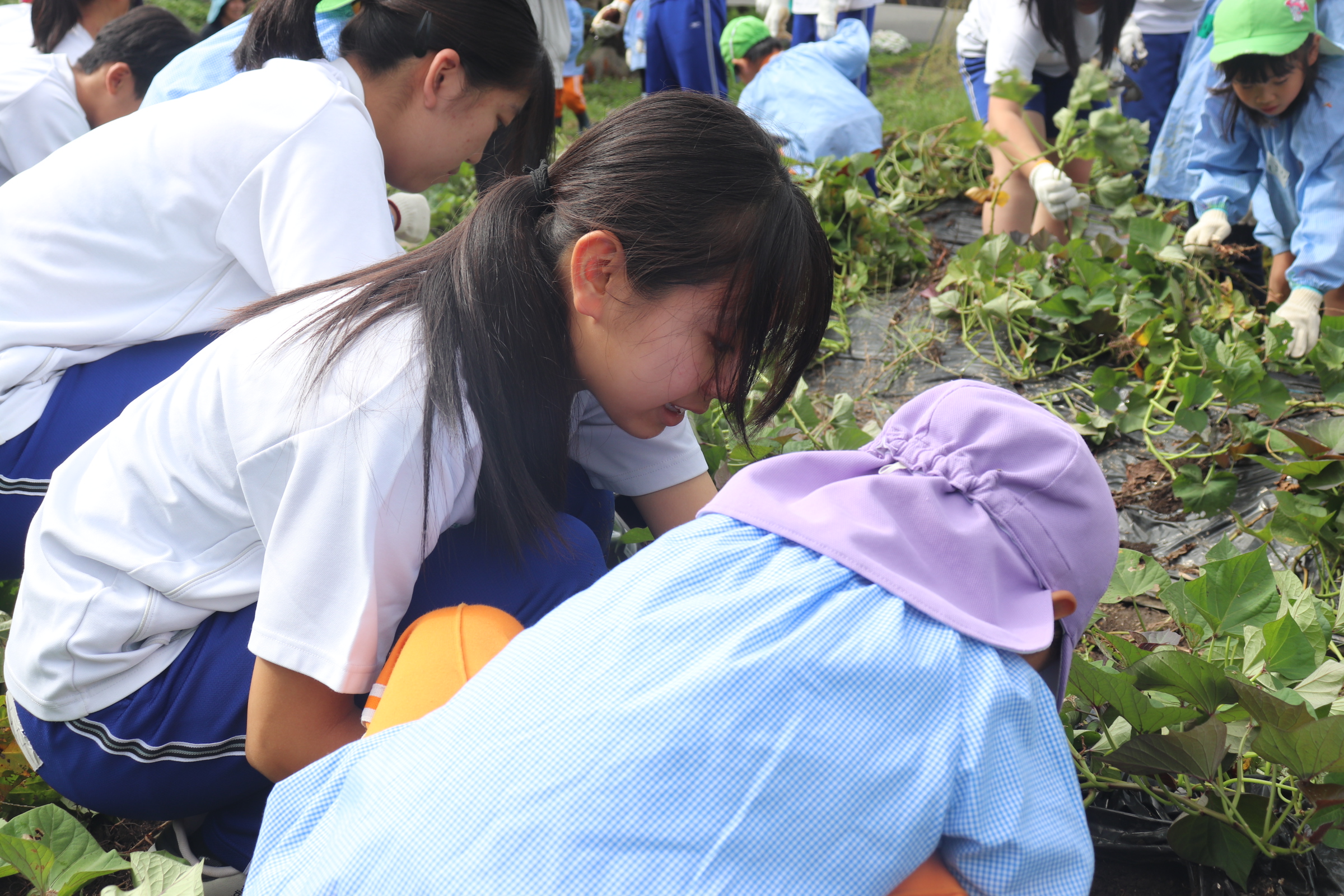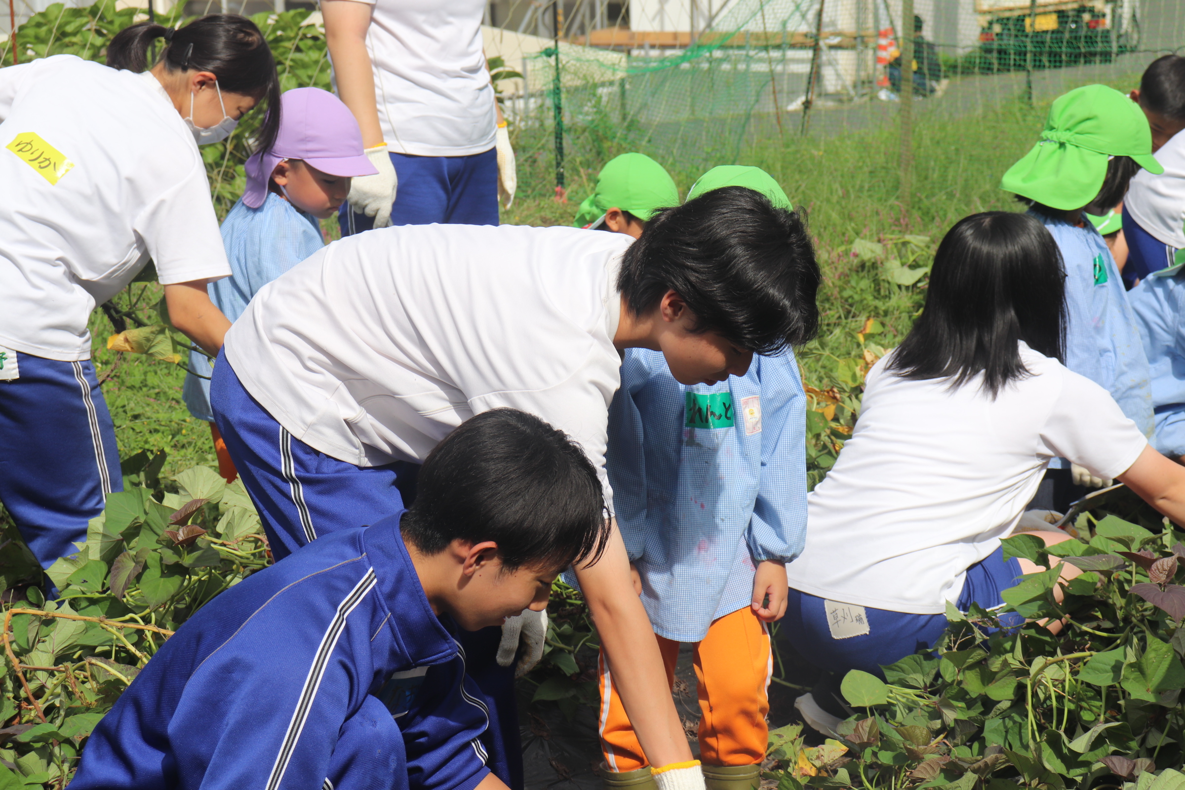 3年生の2時間目の家庭科では、西粟倉幼稚園の園児とのふれあい体験です。今日のふれあい行事は「サツマイモほり」です。天候にも恵まれ、短時間に多くのイモの収穫ができました。今日収穫したイモは少しねかせて、今月末に改めて園児とともに「焼き芋パーティー」ができたらと計画しています。合同運動会の時にも顔を合わせ、アピールのダンスを練習した園児とともにふれあいながら芋ほりをする中で、自身の成長や、これまで家族をはじめとする身近な大人に見守られながら育ったことを実感したのではないでしょうか。