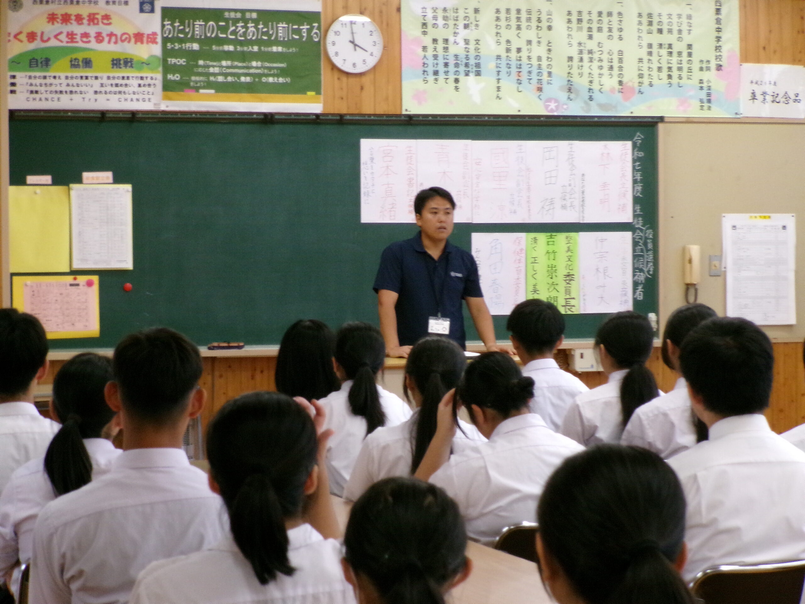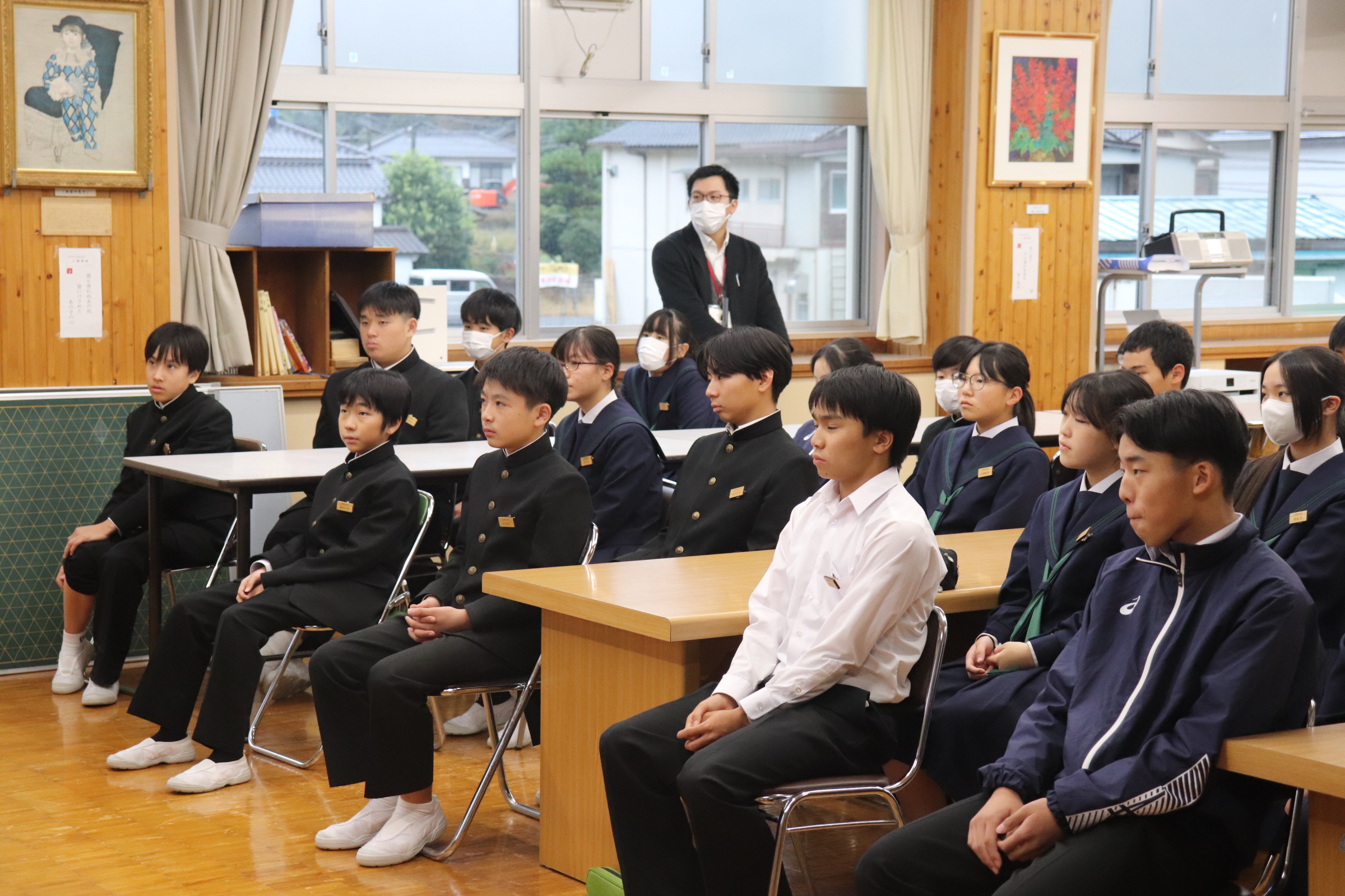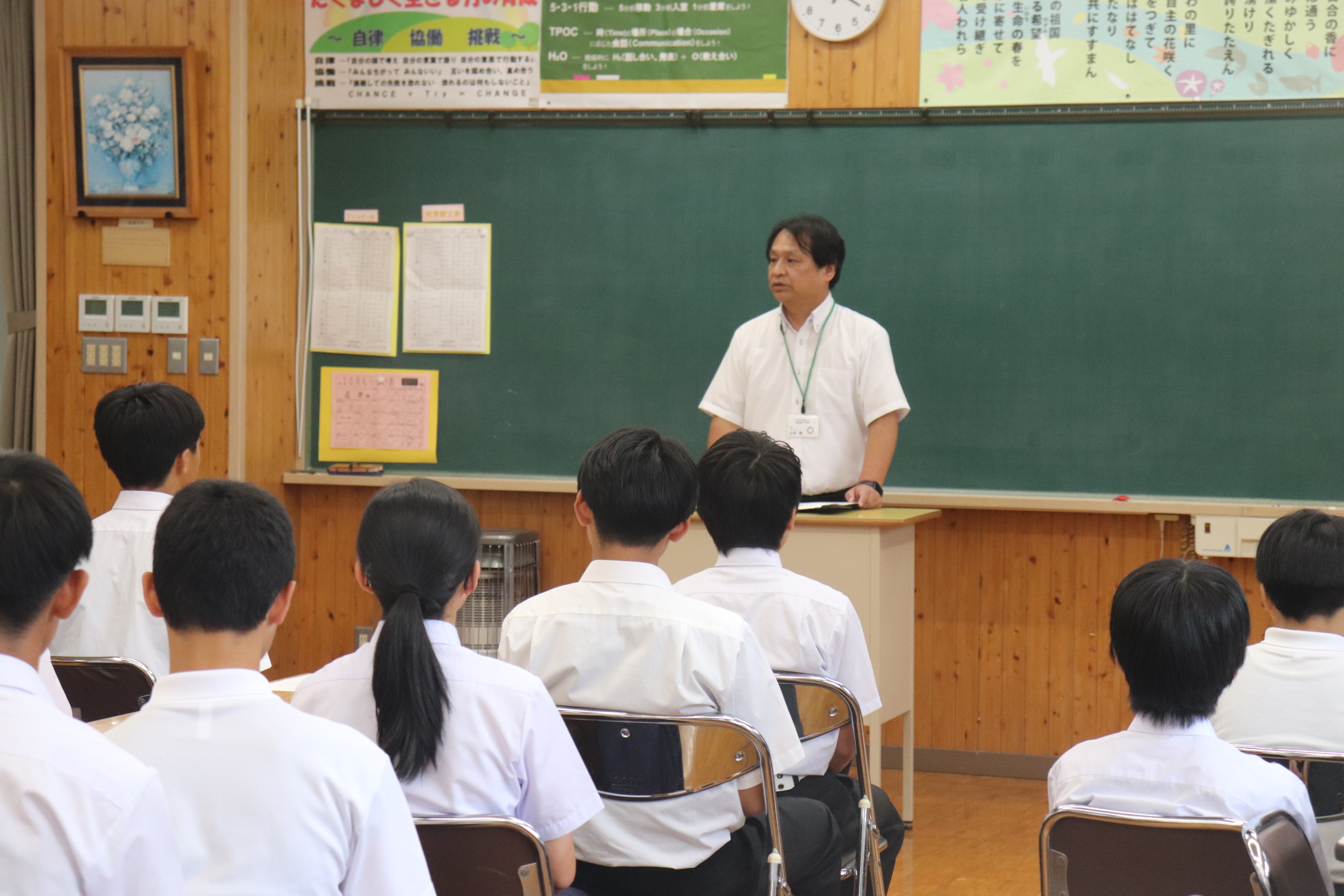 一般社団法人むらまるごと研究所より一級建築士の秋山淳さんをお招きし、「中学生の2倍の時間を生きてみてわかったこと」と題して講演をしていただきました。将来、何(職業名)になるかより、どんな人でいたいか(どんな人になりたいか)を思い描くことや、様々なひとの話を聞いたうえで、自分で考えることに価値があると、話していただきました。