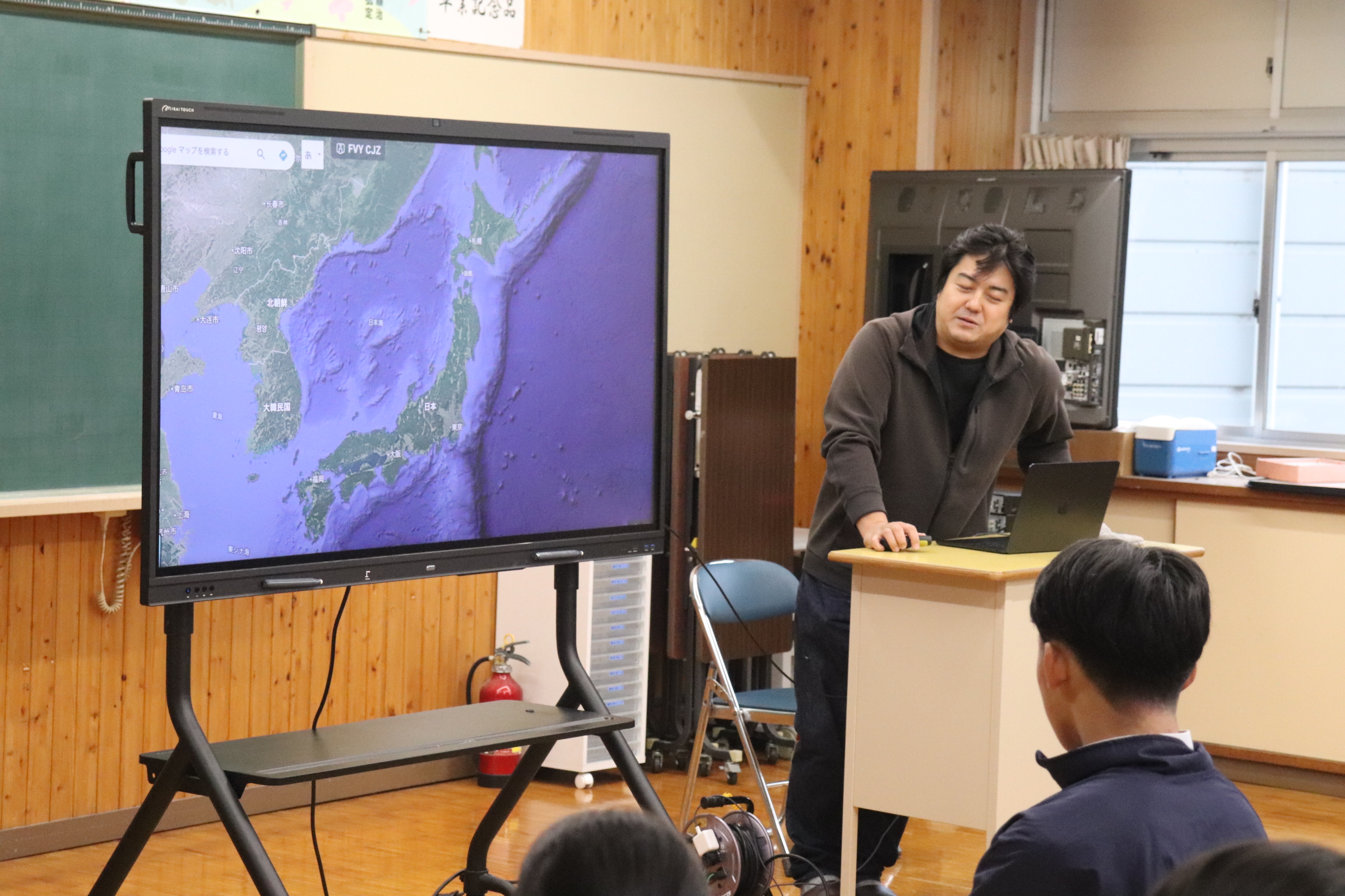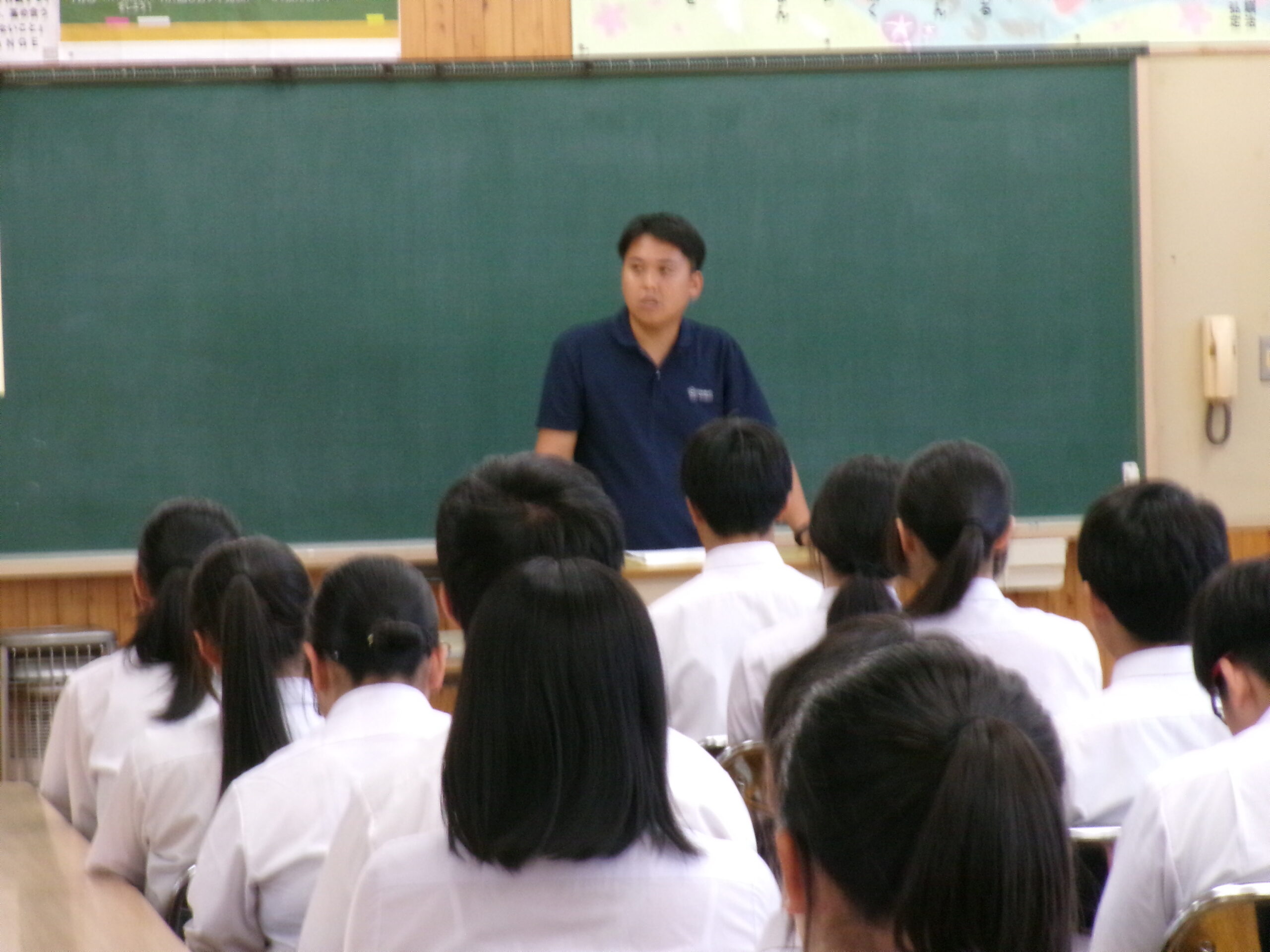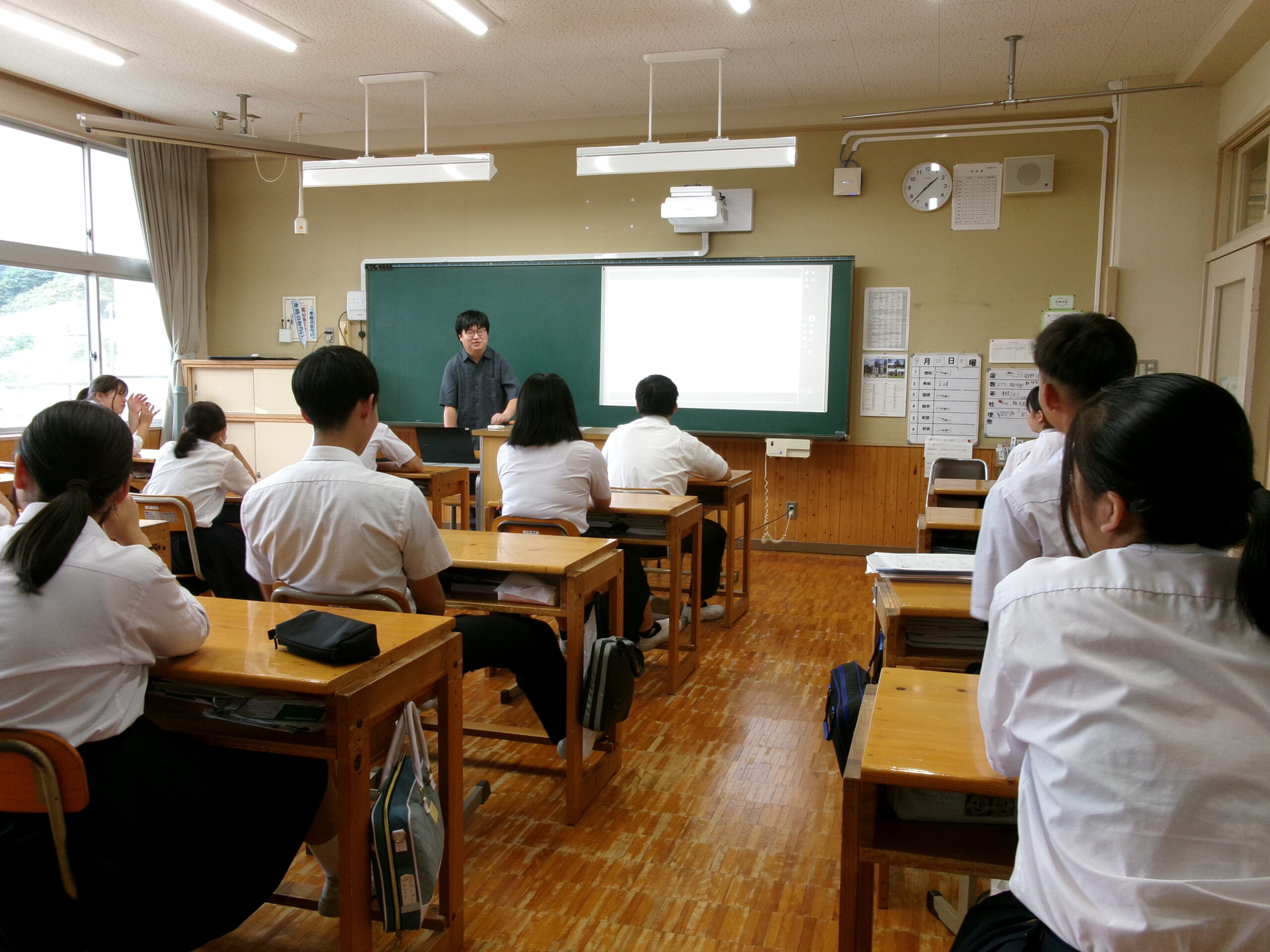 一般社団法人むらまるごと研究所より一級建築士の秋山淳さんをお招きし、「中学生の2倍の時間を生きてみてわかったこと」と題して講演をしていただきました。将来、何(職業名)になるかより、どんな人でいたいか(どんな人になりたいか)を思い描くことや、様々なひとの話を聞いたうえで、自分で考えることに価値があると、話していただきました。