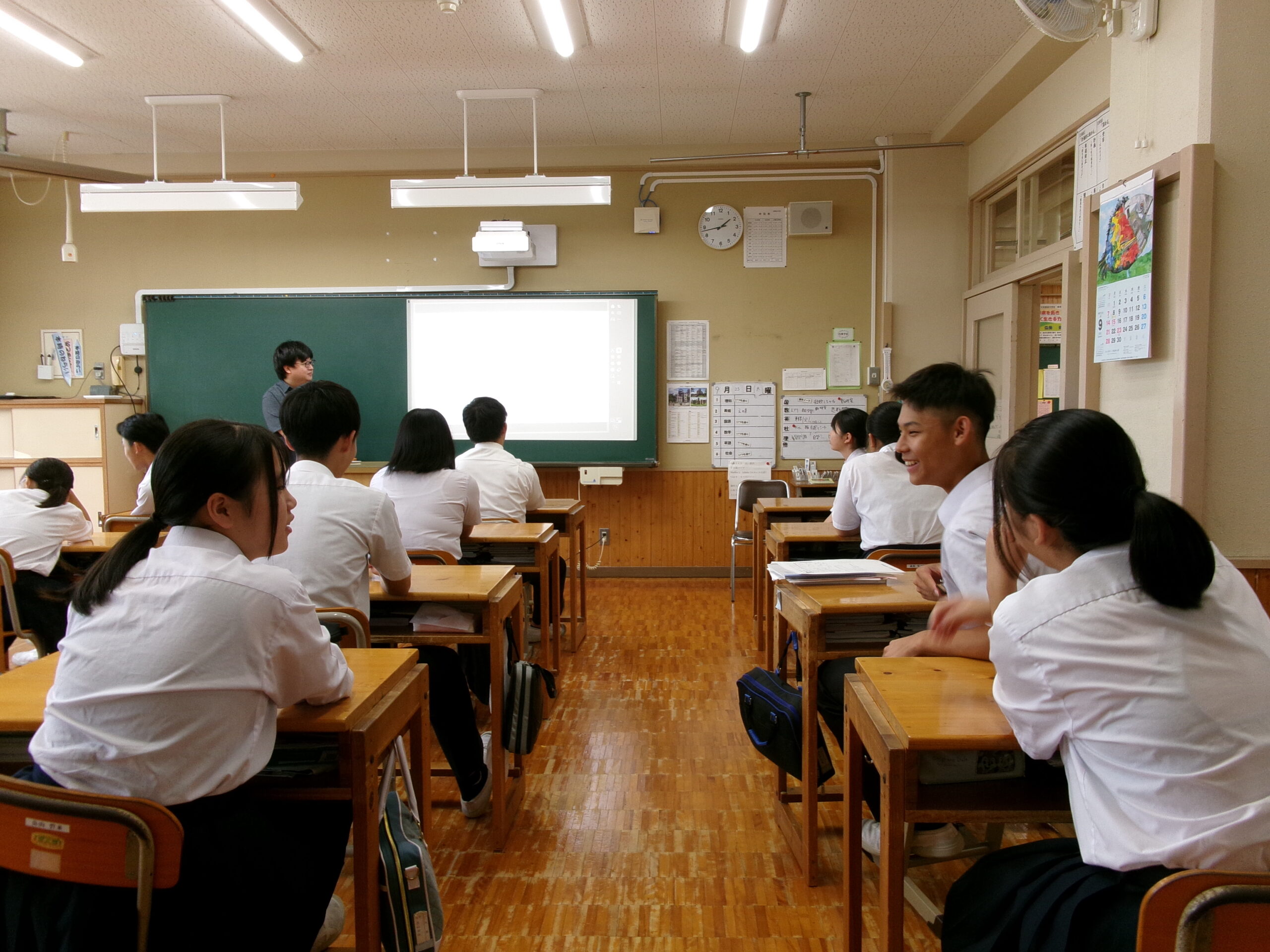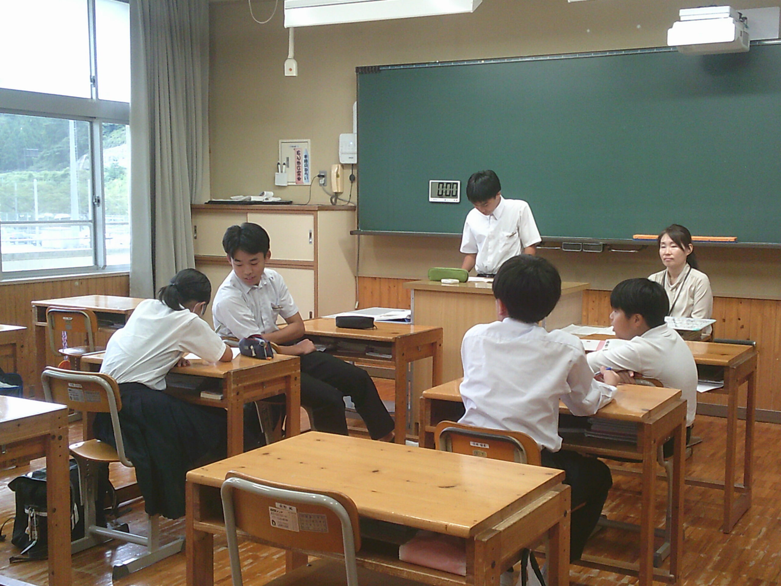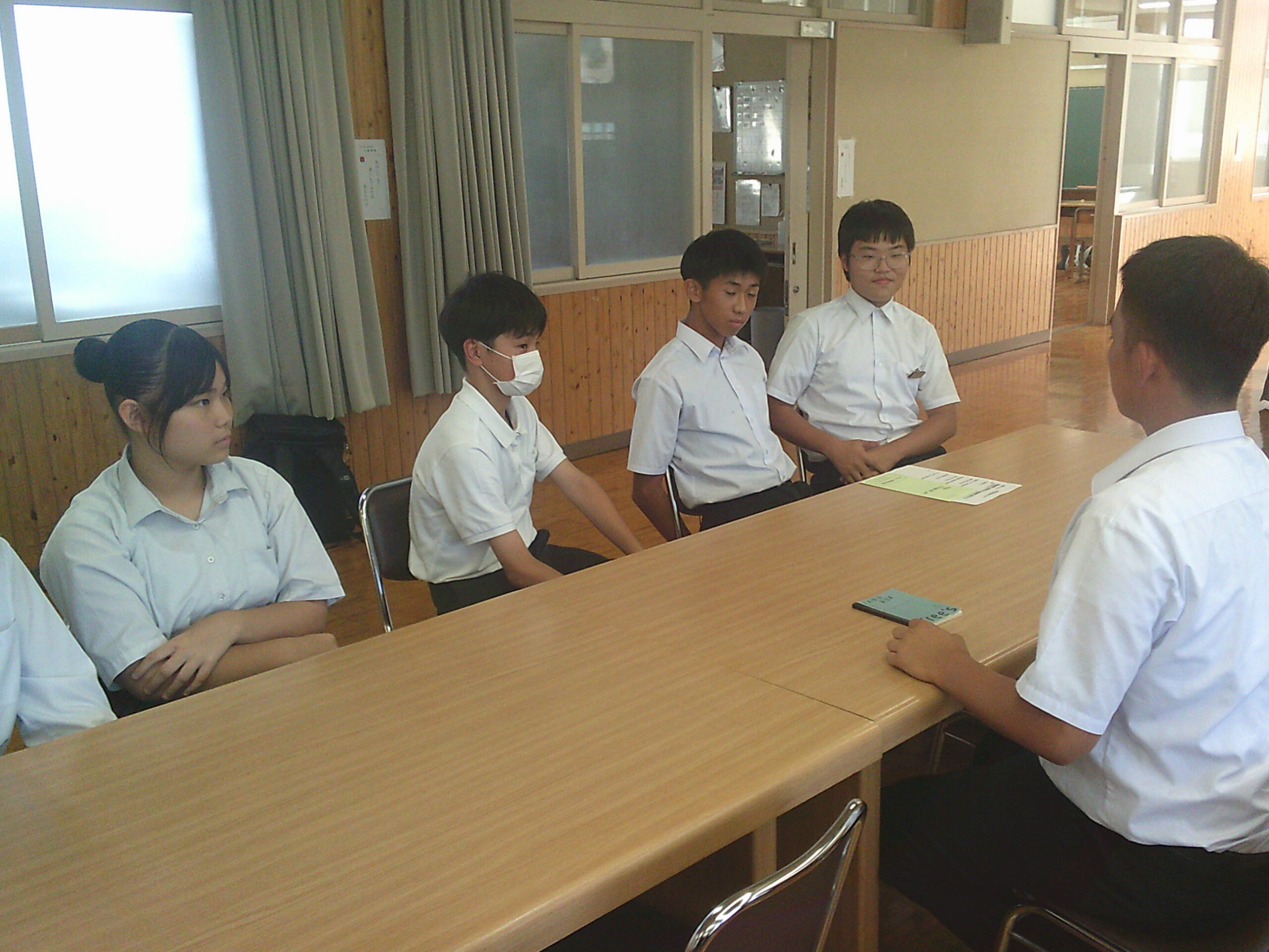 岡山大学の教育学部1回生の現地実習の一環として、本校に7名の学生が来校してくださいました。はじめに校長室で、西粟倉中学校や西粟倉村の特徴や頑張っていることなどを説明した後に、実際に授業を見学し、授業を受けている生徒達の様子や授業をする先生について勉強をしました。最後、質疑応答の時間は、参加された7名の学生が次々と質問をされ、意欲の高さに説明していた私たちも刺激を受けました。数年後、大学を卒業し、学校現場で先生として戻ってくることを楽しみにしています。
