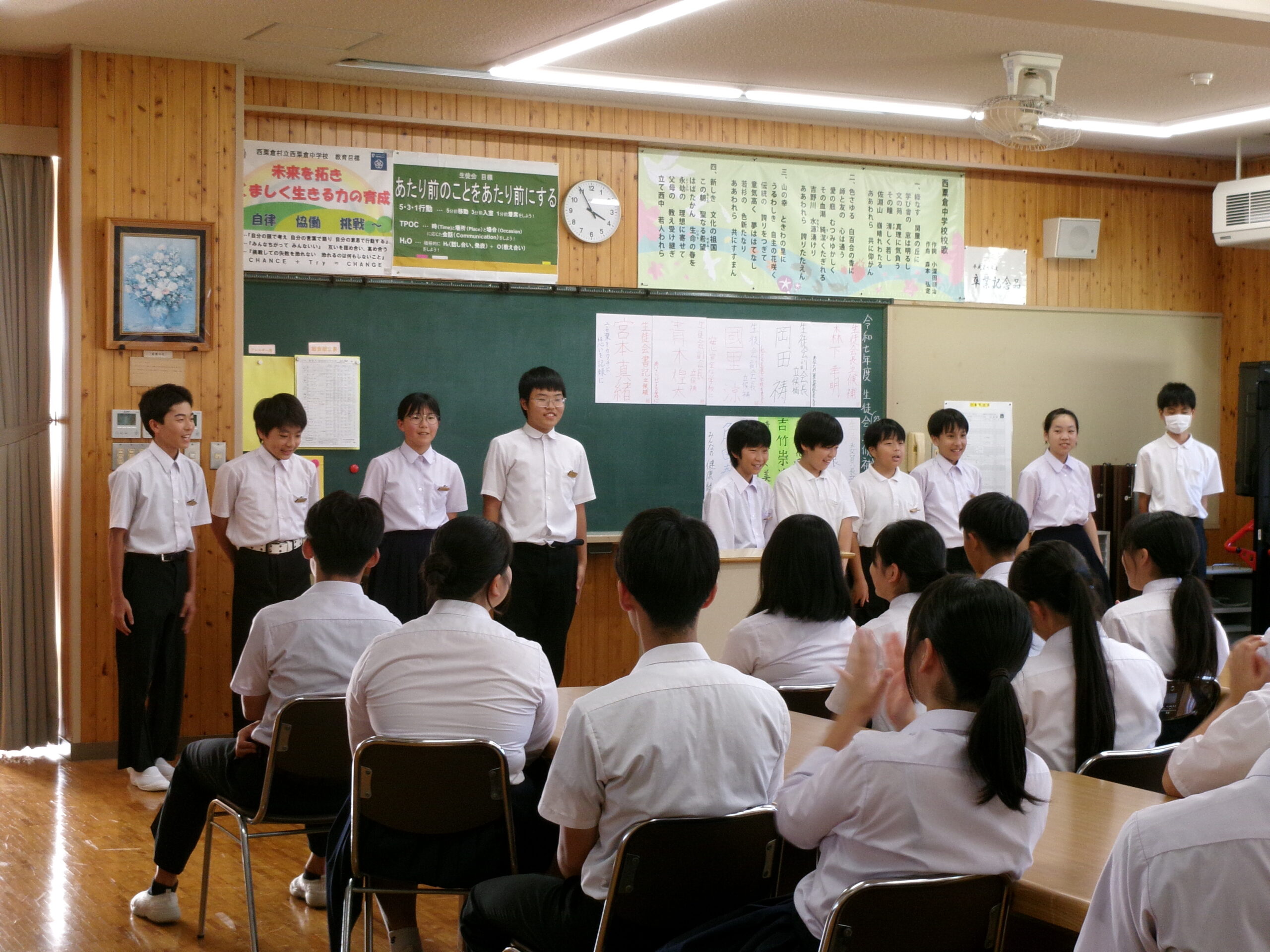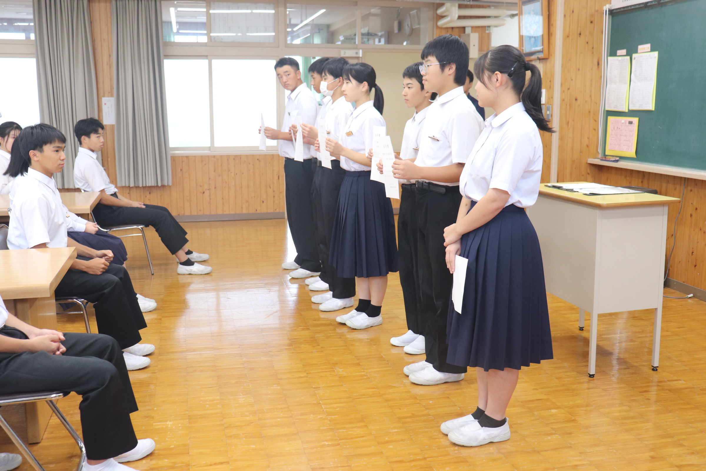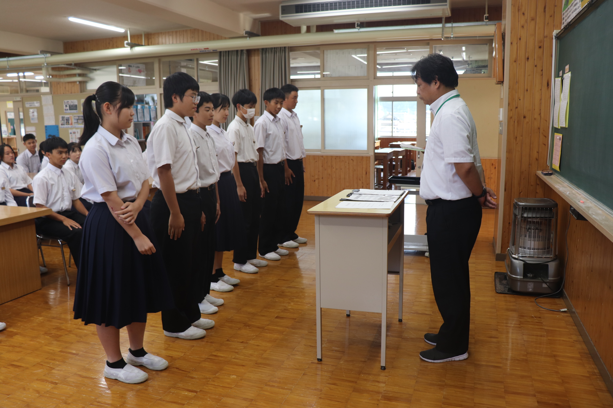 生徒会選挙の結果、本部役員並びに専門部部長が決定し、認証式が行われました。生徒会を中心として、生徒全員の協力と取り組みで、よりよい西粟倉中学校をつくっていきましょう。
