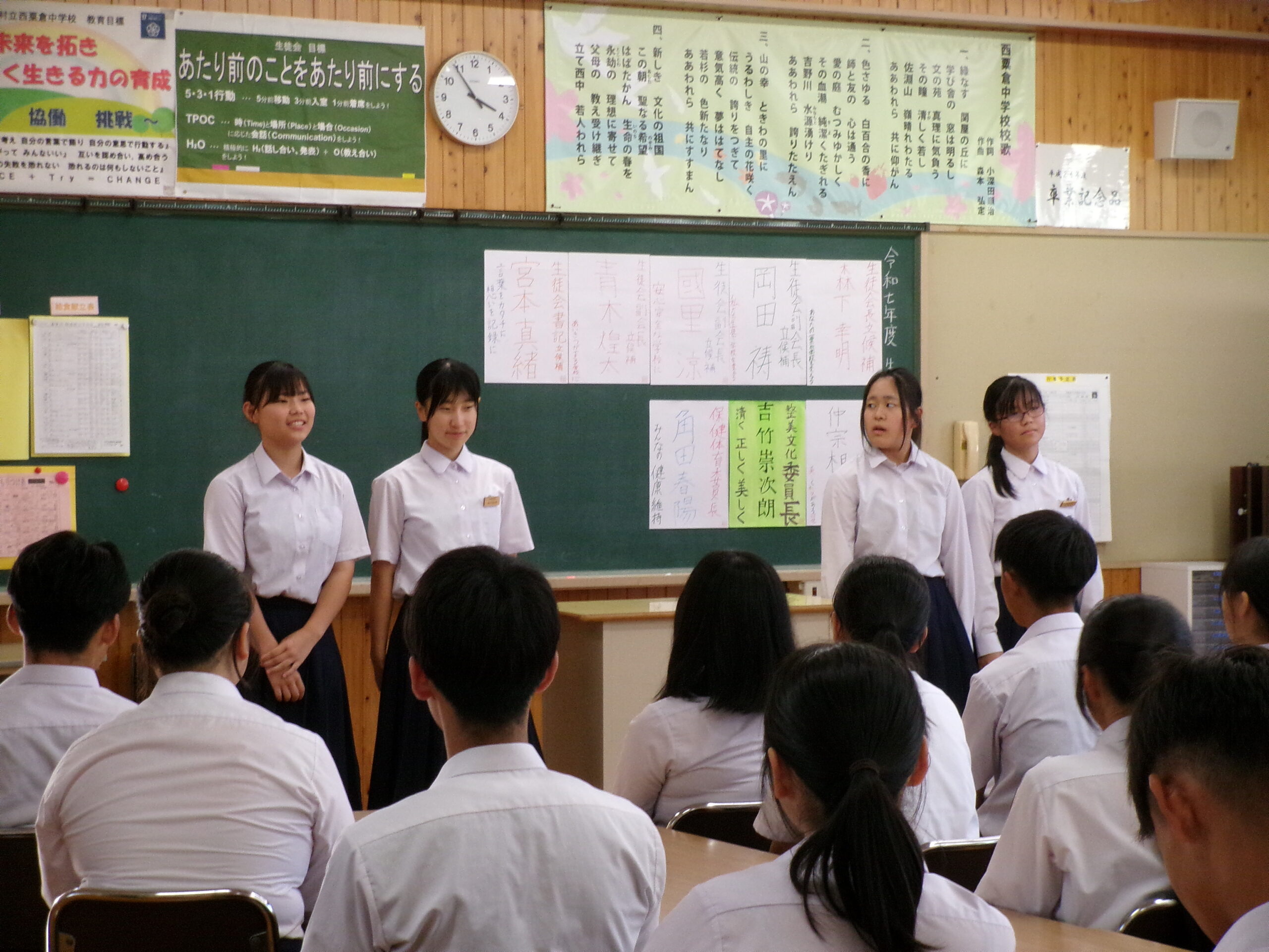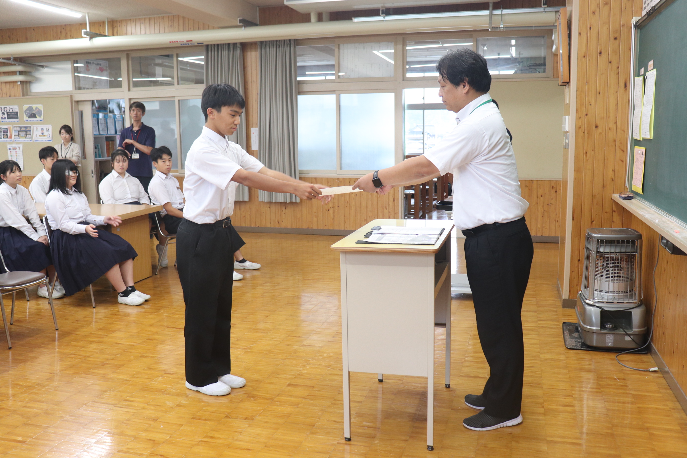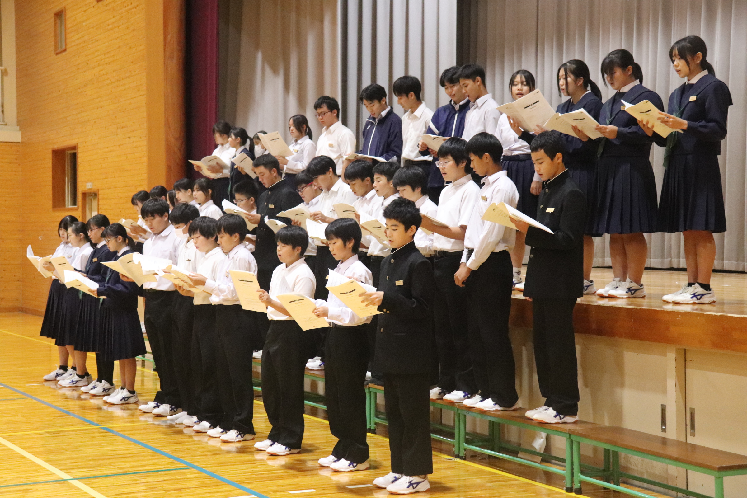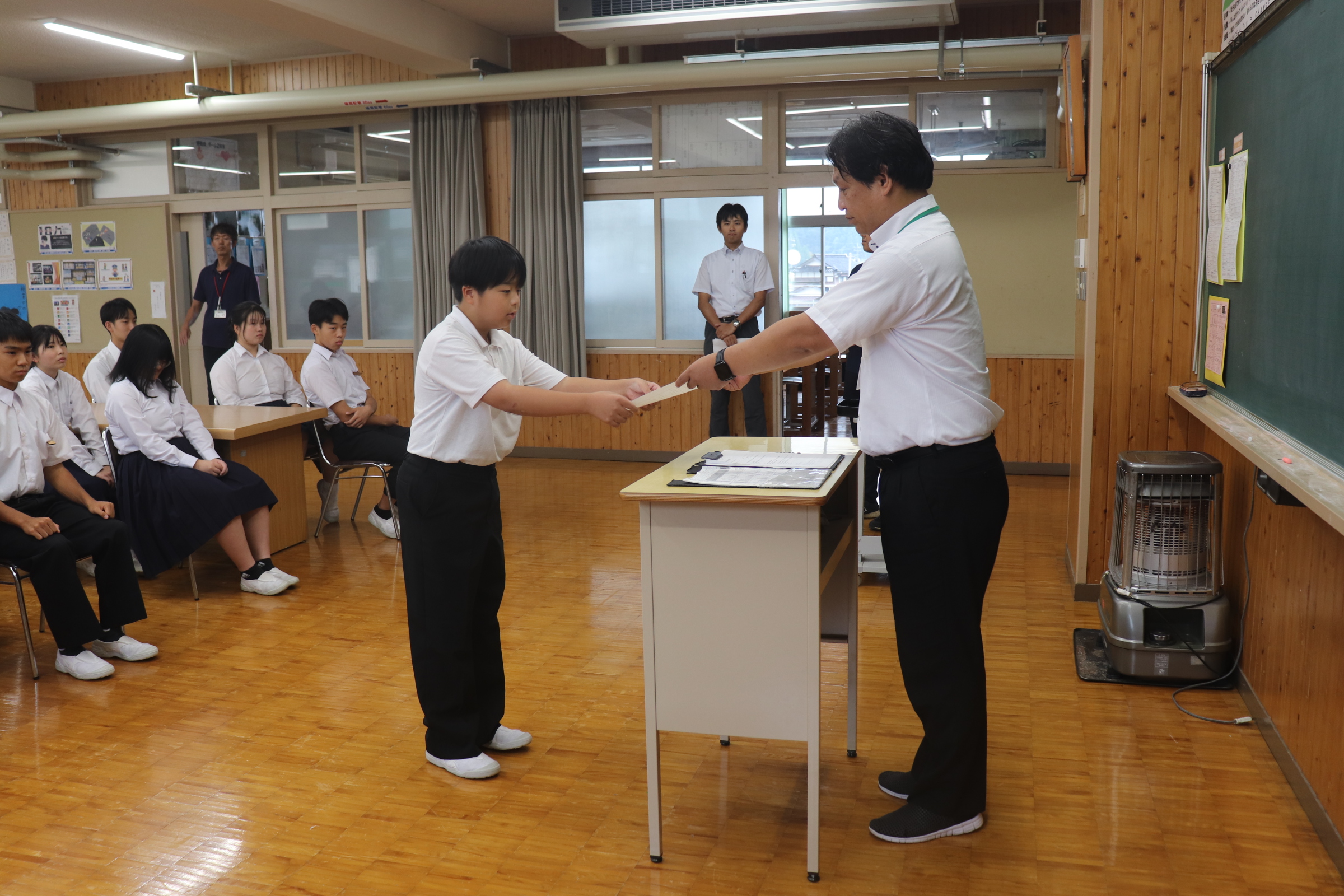 生徒会選挙の結果、本部役員並びに専門部部長が決定し、認証式が行われました。生徒会を中心として、生徒全員の協力と取り組みで、よりよい西粟倉中学校をつくっていきましょう。