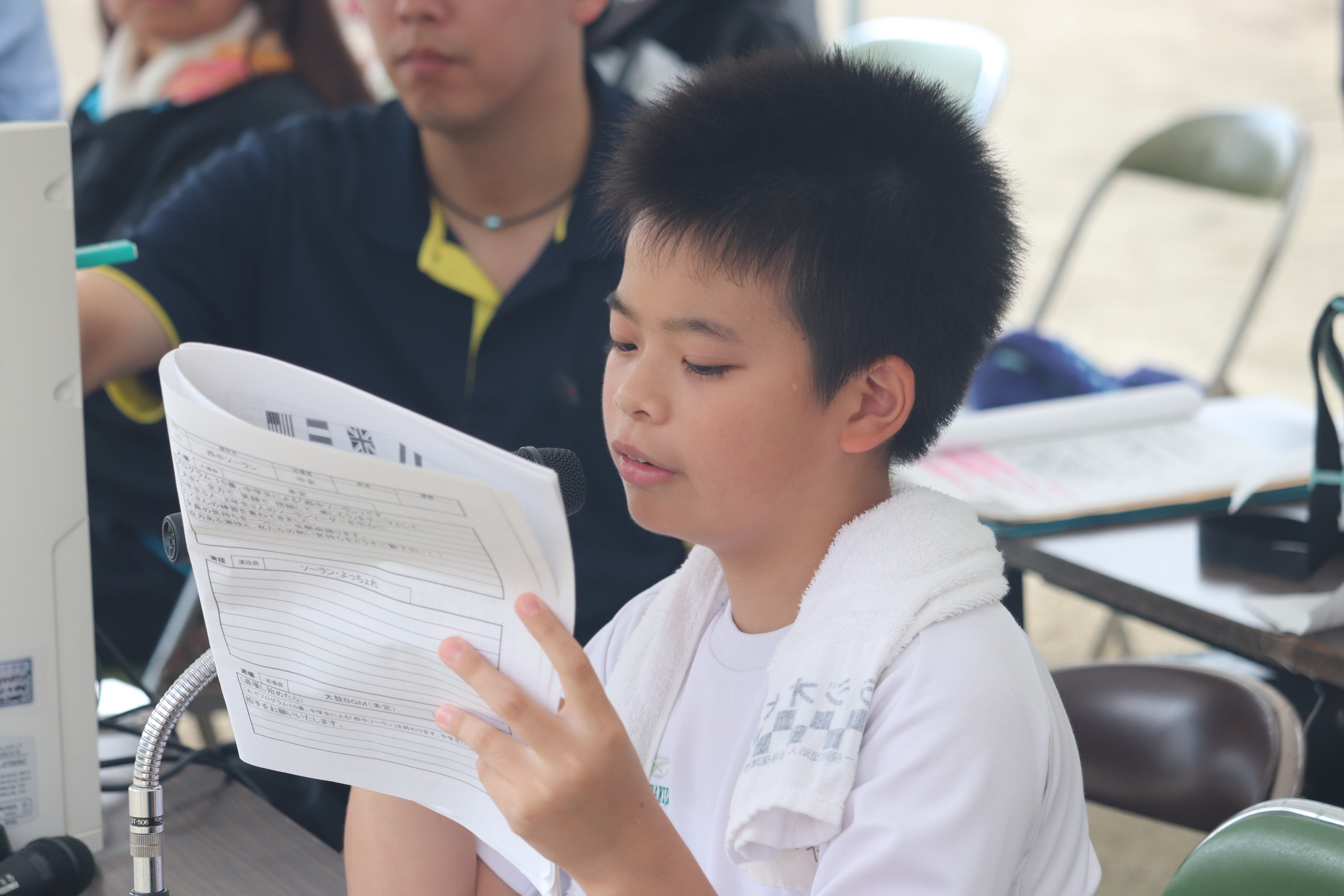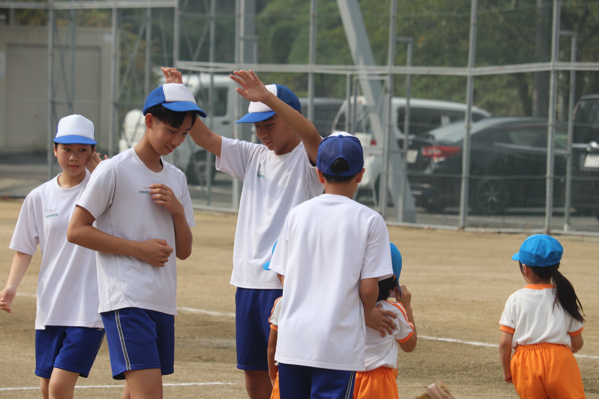 第2回の合同練習は、準備体操と開閉会式の練習です。2限には開会式の隊形に集合し、代表生徒から合同練習に向けての意気込みの話をしたり、隊形の確認をしたり、準備体操の練習をしたりしました。3限には会の流れの説明をしながら、開会式の練習をしたり、閉会式の練習をしたりしました。それぞれ代表になっている生徒が、いつ、どのような話をすれば分かりやすいかなどを考え、時には幼稚園児や小学生に声をかけたり、手を引いて移動したりする姿を見ていると、合同運動会を自分たちで作り上げる気概を感じます。また、幼いときに大きな先輩たちにしてもらった優しい思い出が、今こうして小さな後輩たちへの優しさとなって表れているんだなと継続して取り組んできている重みを感じました。