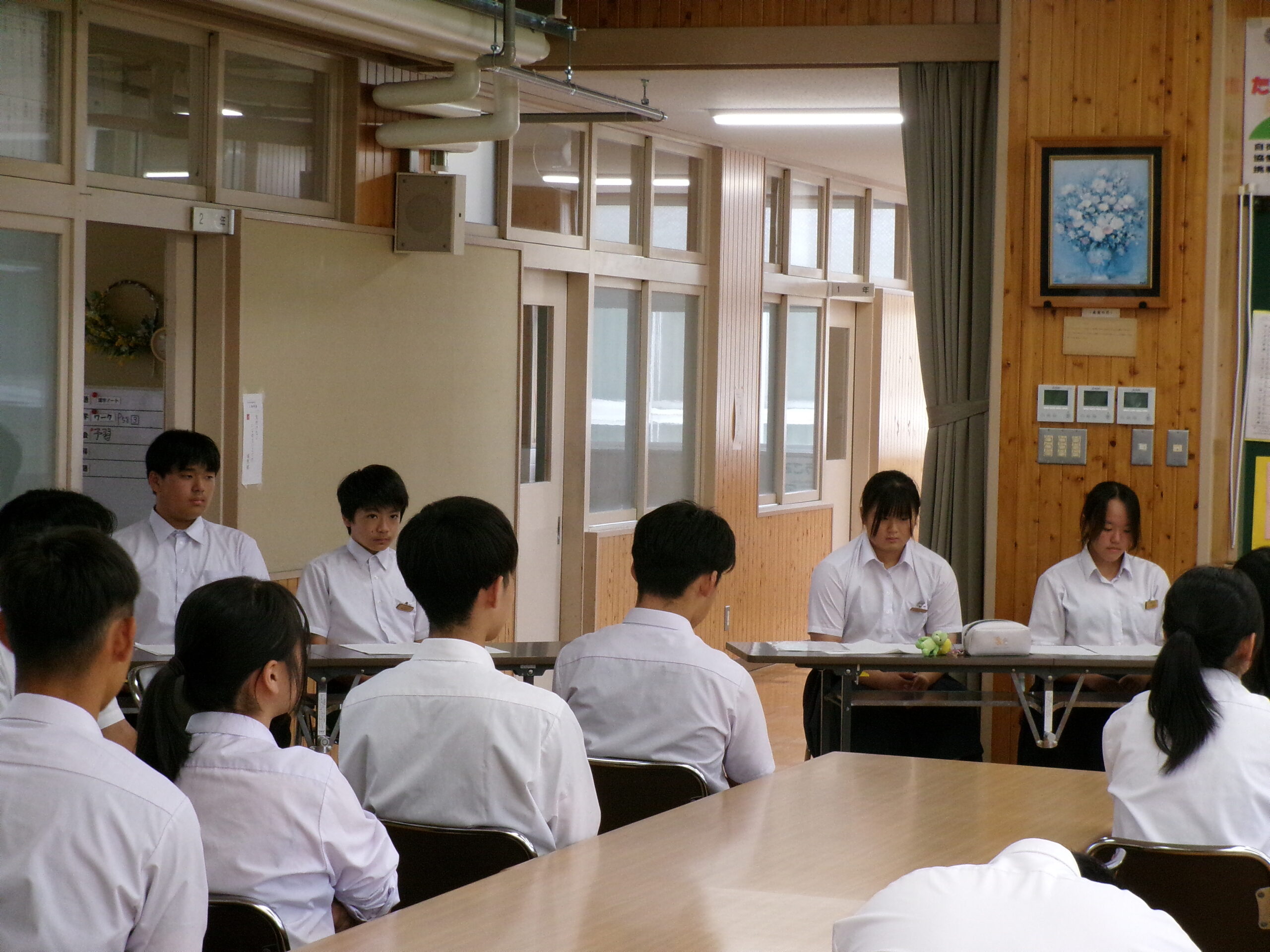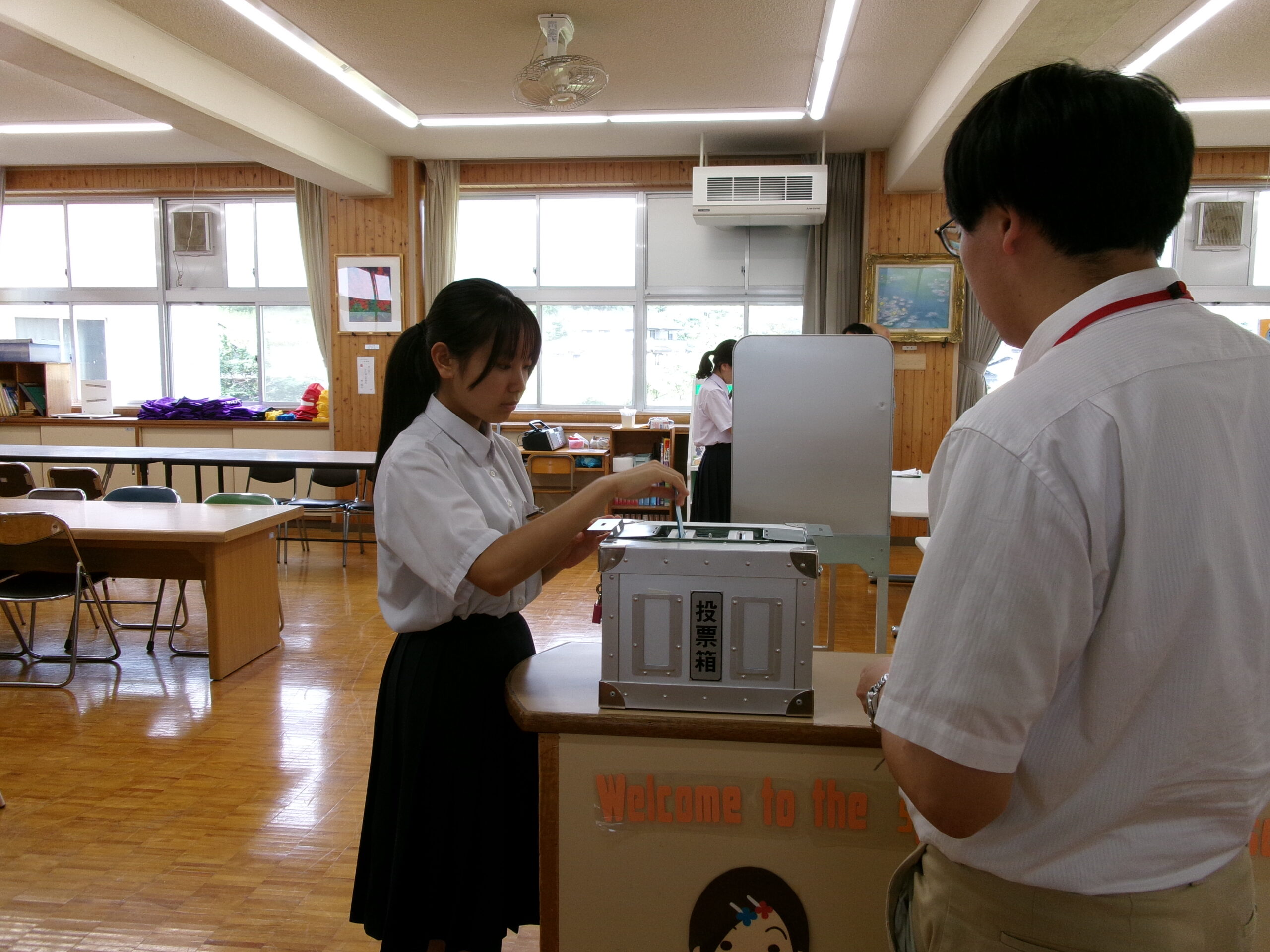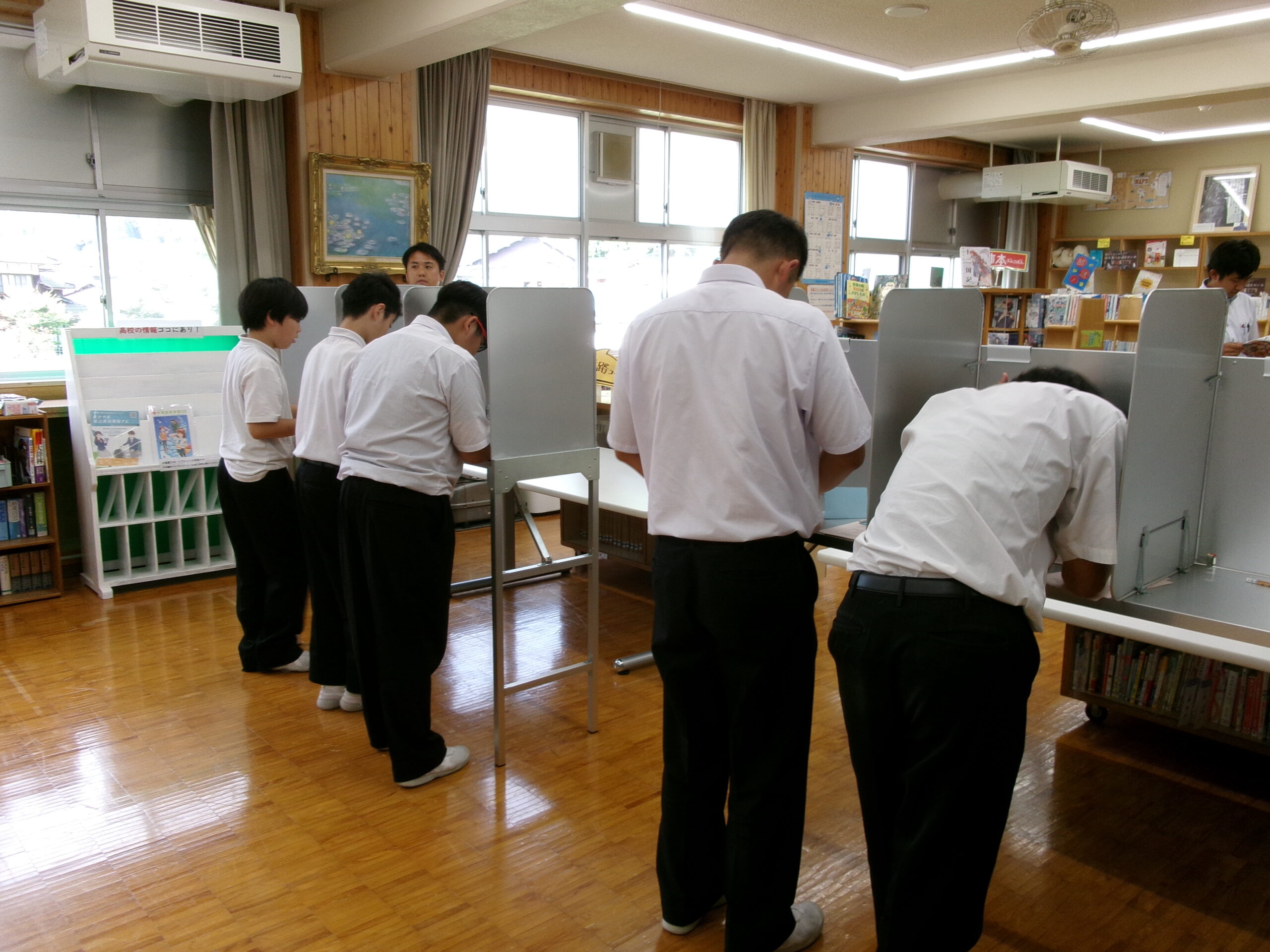 本日6限は生徒会役員選挙に向けての立会演説会並びに選挙を行いました。演説会では、それぞれの候補者が自分の思いをしっかりと伝えていました。同席した先生からは「はっきりした口調で聞き取りやすく、今後が楽しみだ」という感想も聞いています。その後に行われた選挙では、実際に大人の選挙で使われる記載台や投票箱を村役場からお借りしての投票を行っています。18歳成人となり、あと数年後に実際に行う政治参加に向けての練習の意味もあります。