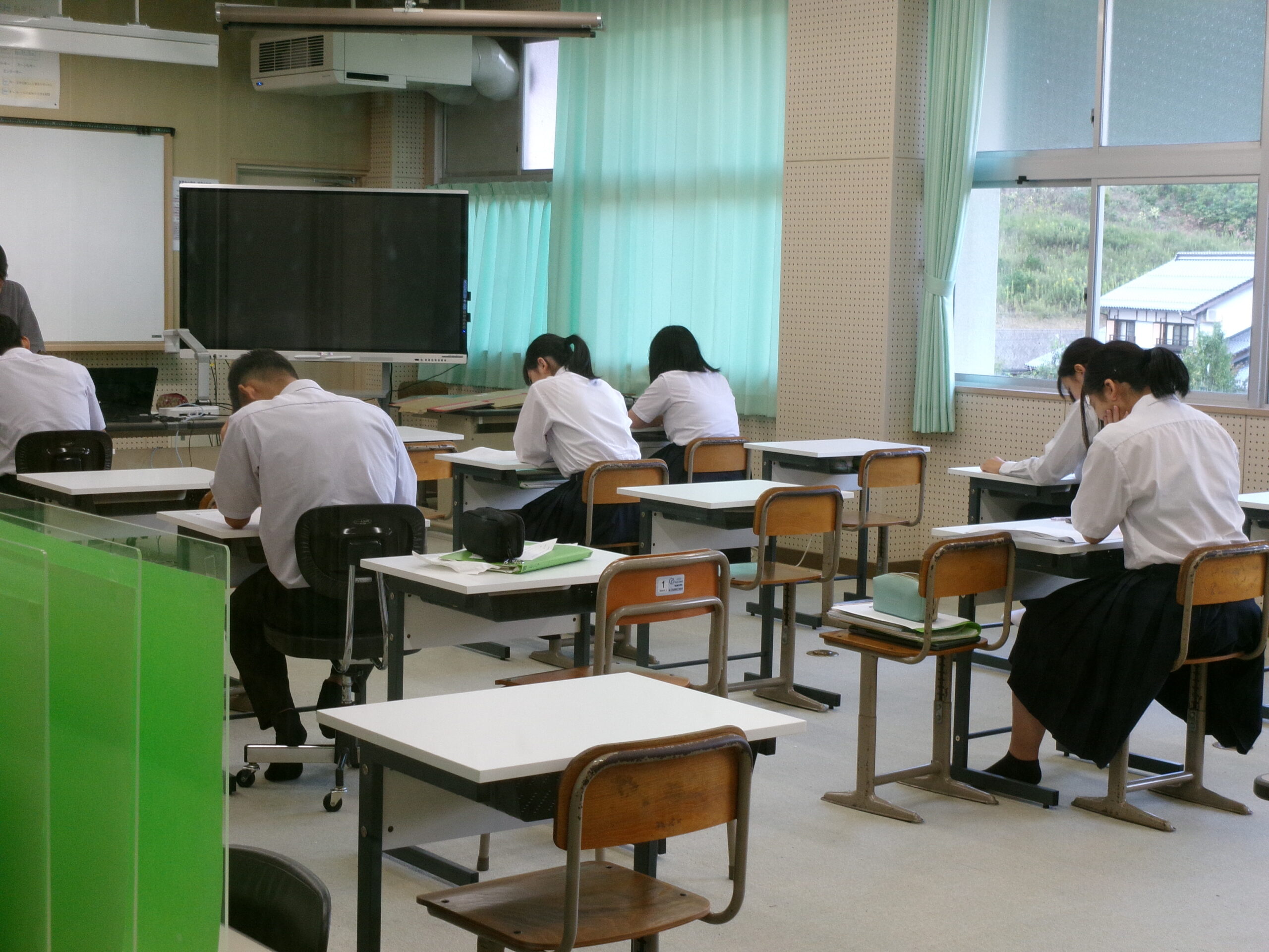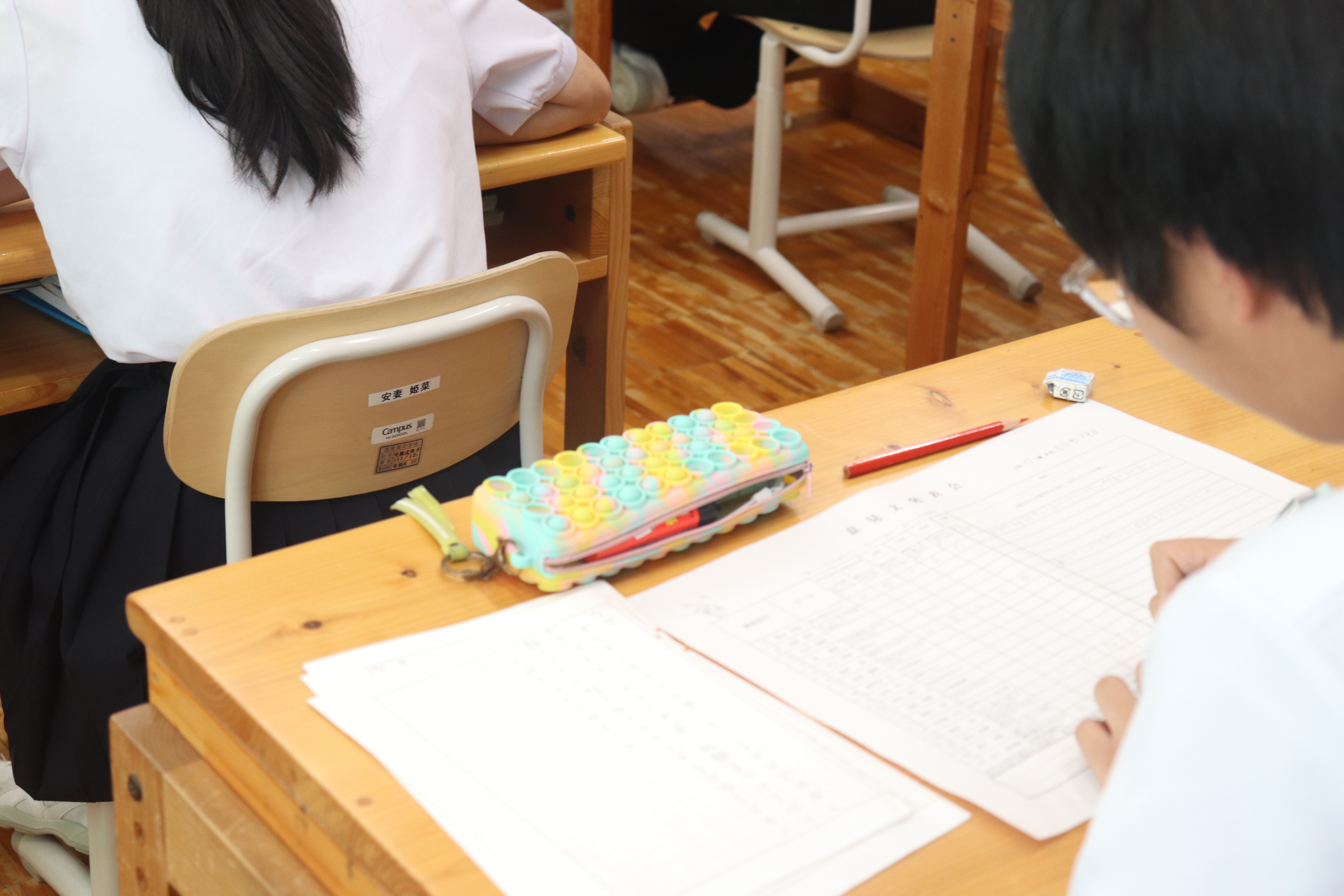 明日の始業式を前に、3年生は登校日です。お弁当持参で5時間の実力テストを実施しました。夏季休業中も、合同運動会に向けての色別アピールで踊るダンスを創ったり、中学生全体で練習したりと何度も登校し、姿を見る機会も多くあったのですが、全員そろっての登校は久しぶりです。朝の会で夏休みの宿題を提出し、テストに臨み、一足早いスタートを切りました。