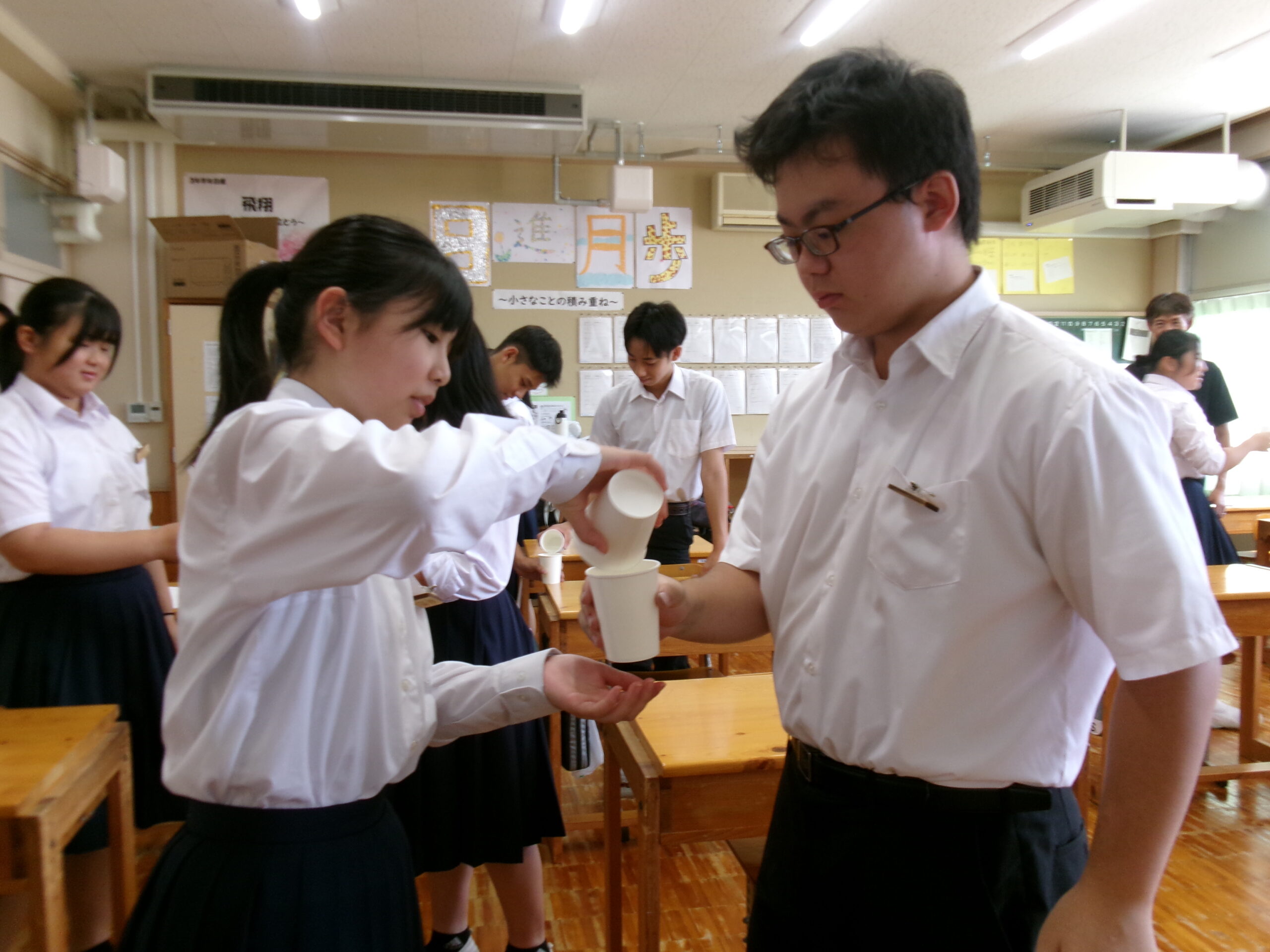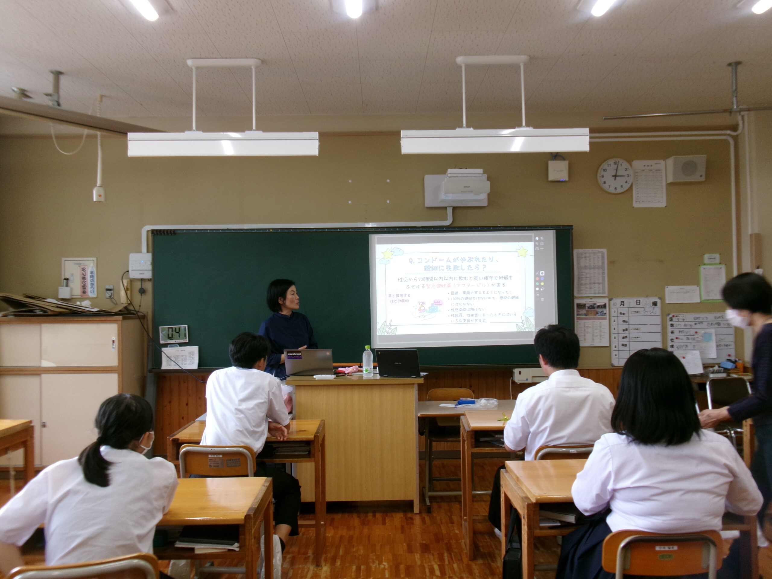 3日の1年生に続き、本日は3年生が澁谷先生による性教育です。3年生は授業の冒頭に簡単な実験を行いました。コップの水を5人の相手と順番に混ぜ合わせます。その後、理科の授業でも使うフェノールフタレイン溶液を加えていくと全員の水が薄いピンク色に染まりました。たった一人だけ、水ではなく、液に染まる薬品を混ぜていたのですが、これが「性感染症」の伝染のメカニズムです。具体的な実験結果をもとに考えたので、他人ごとではなく、将来の自分の体を守ることの大切さとして実感をもてたようでした。
