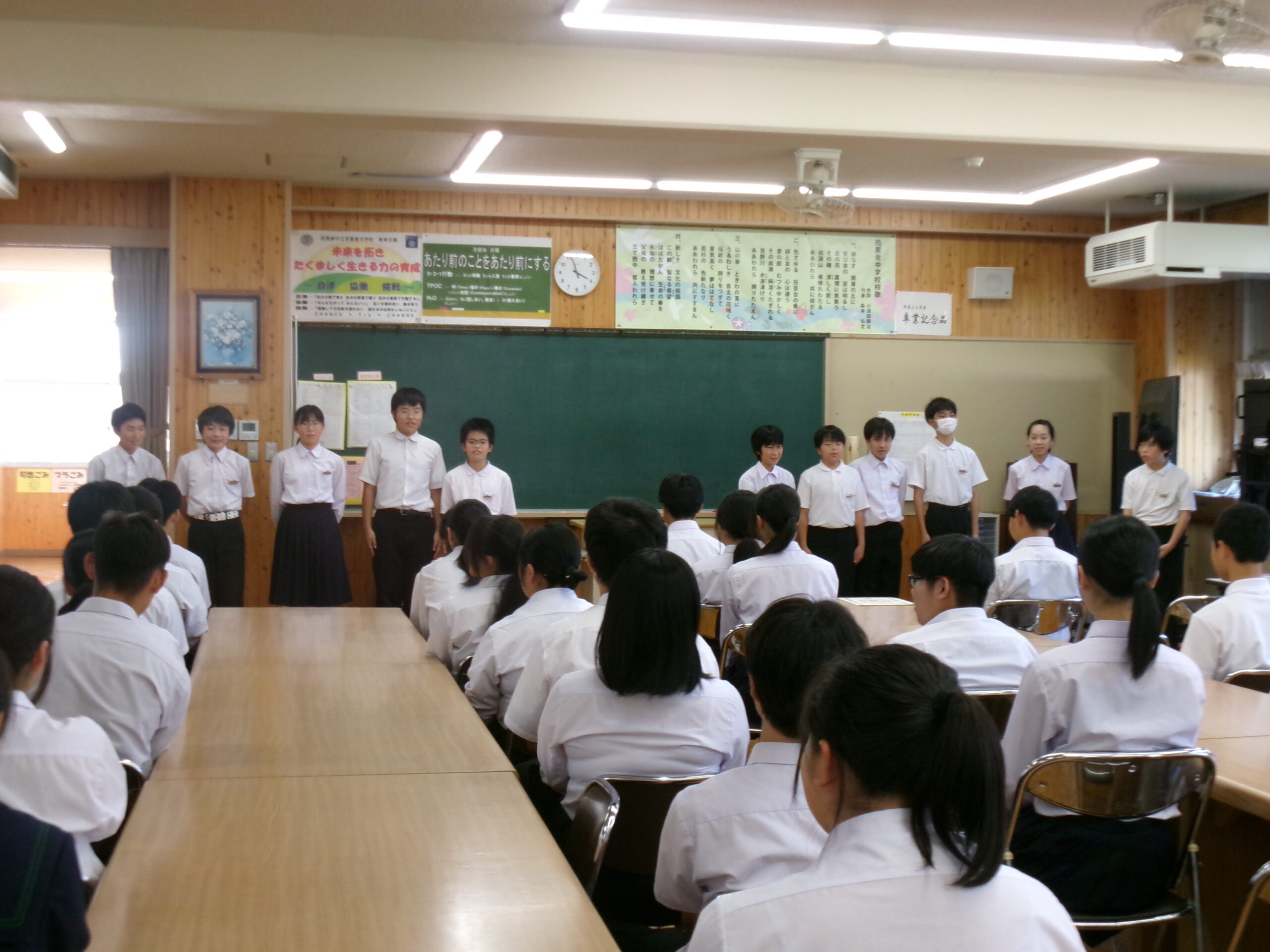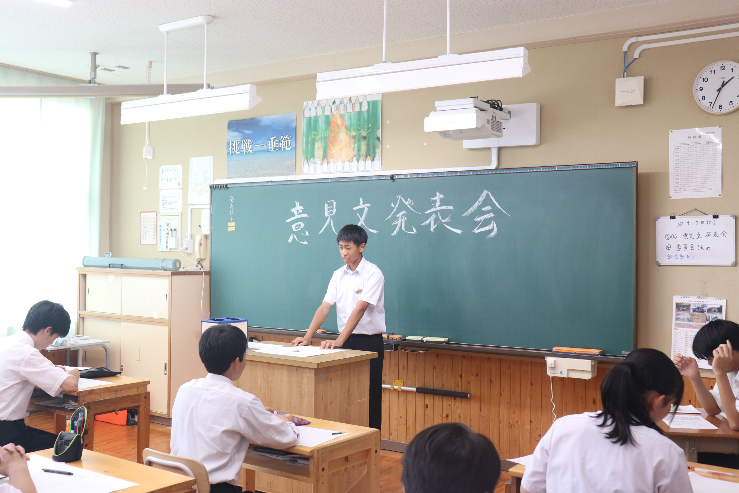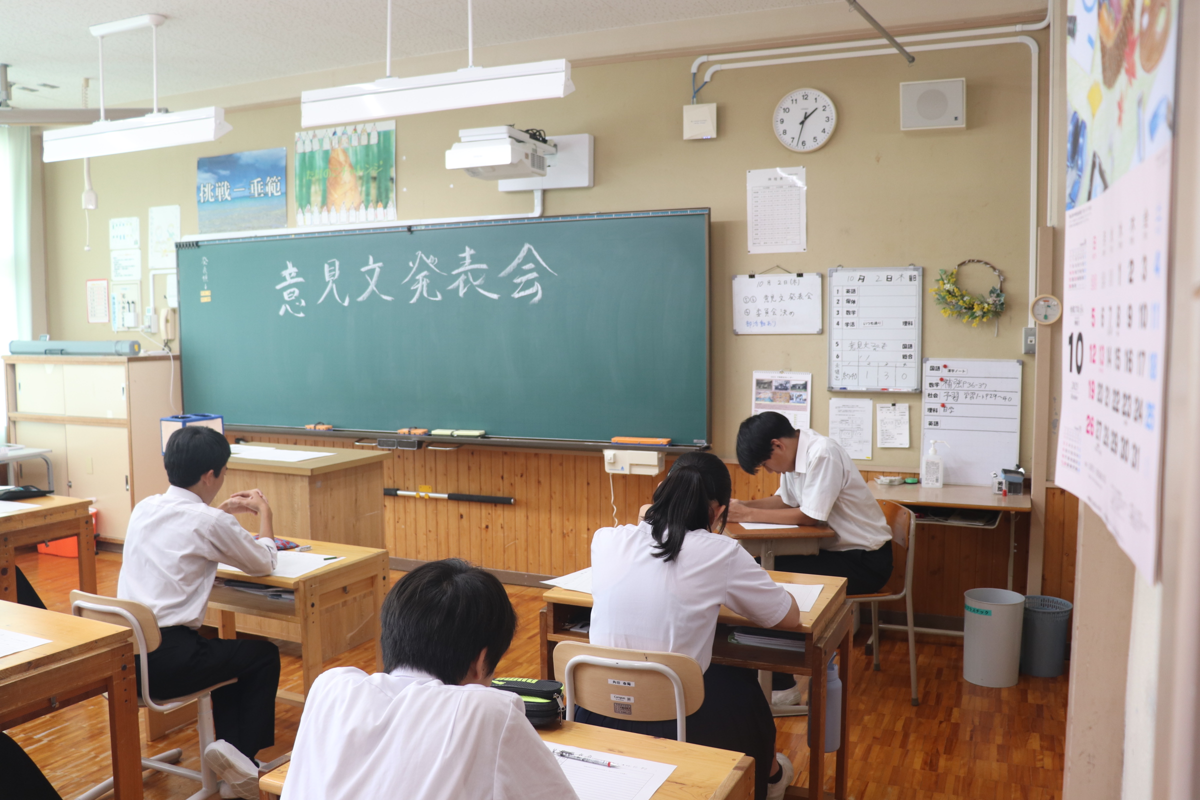 本日5、6限は全校で意見文発表会を行いました。保護者の方への案内が直前となり、都合をつけることができず参加できなかった方もいると思います。申し訳ありませんでした。生徒によっては、夏休みをはじめとして9月中にも何度も書き直し、立派な意見文を発表しました。自分が発表するだけではなく、相互で意見文の内容を評価しながら、今月末の学習発表会での発表者の選出も行っています。ぜひ25日(土)の学習発表会には代表生徒の発表を聞きに来ていただけたらと思います。
