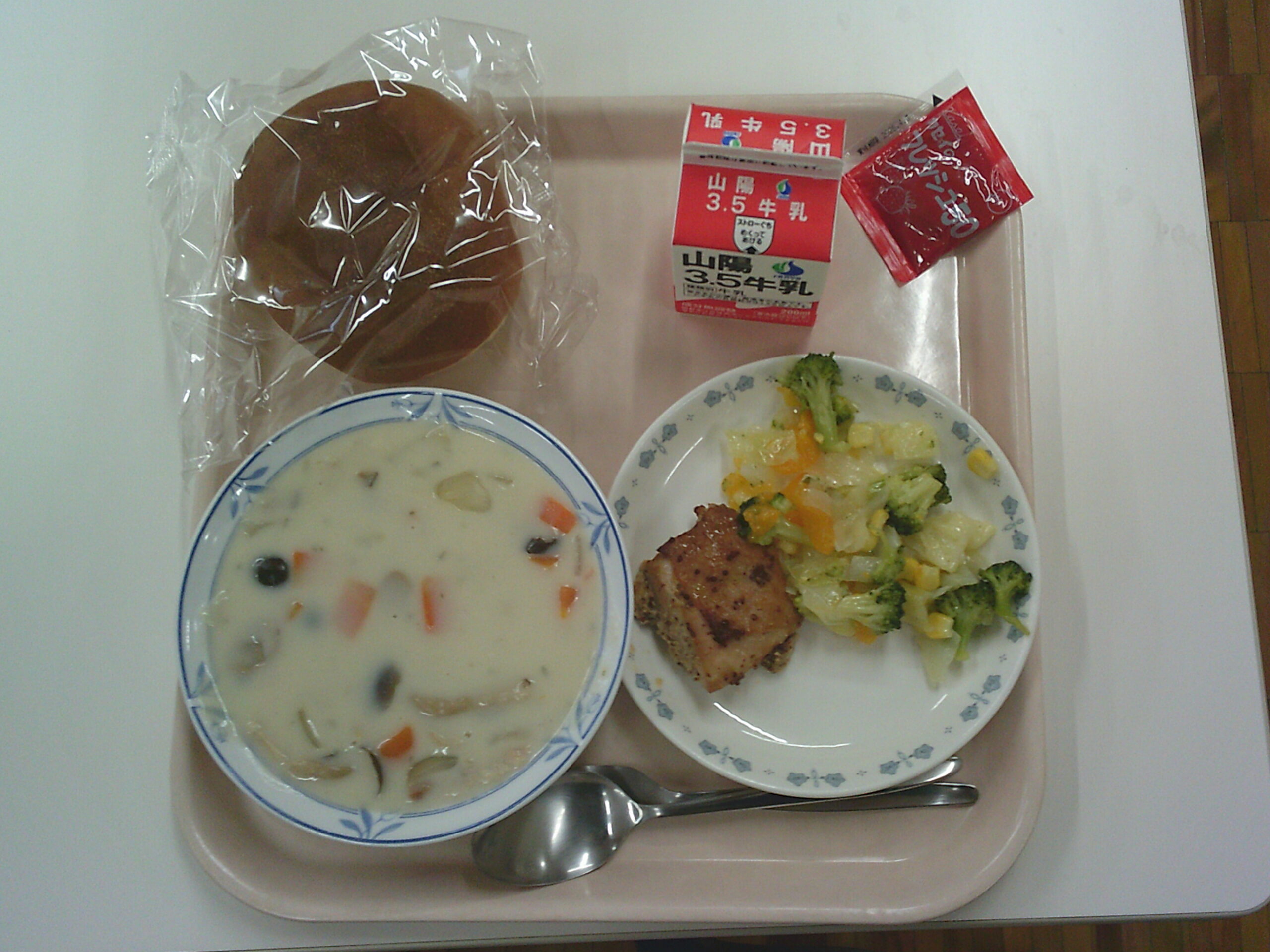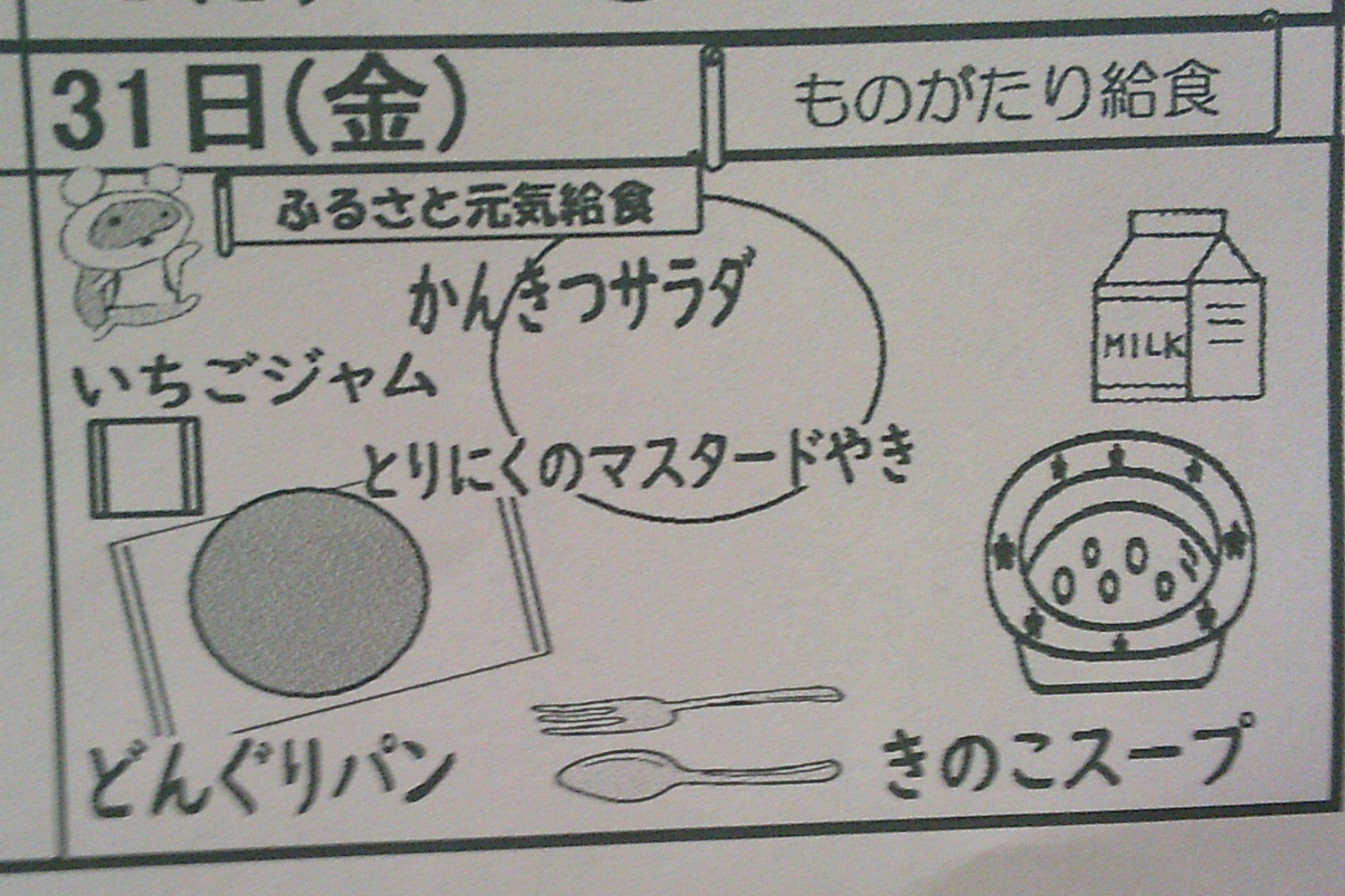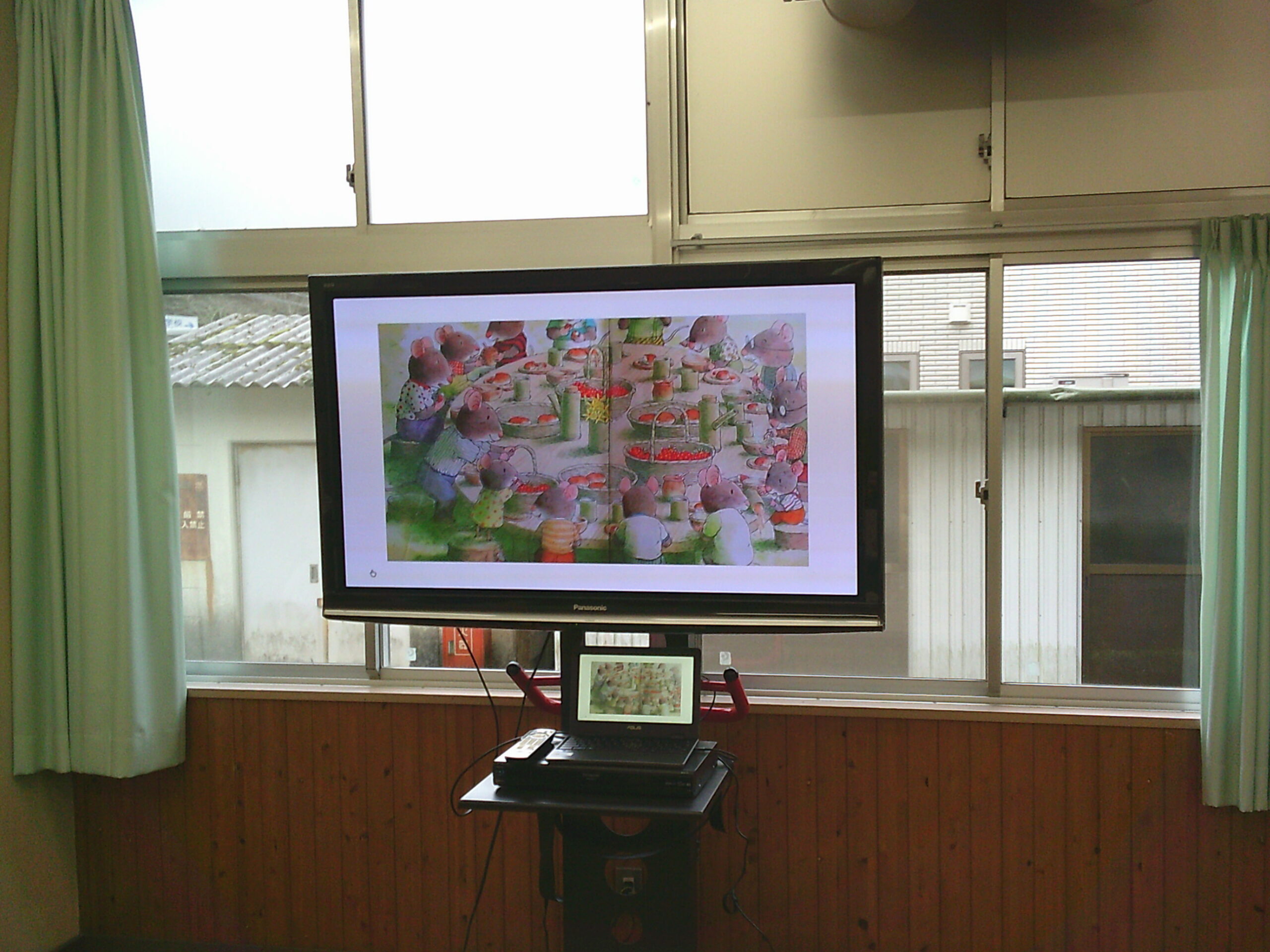 今日の給食は「ものがたり給食」です。「いわむらかずお」さんの14匹のネズミの家族が森で食材を集め、みんなで協力して朝ご飯を作るものがたりの「14ひきのあさごはん」から「どんぐりパン、いちごジャム、きのこスープ」などのメニューが考案されました。食事中はあわくら図書館にある原作の絵本の読み聞かせのVTRも放映しおいしくいただきました。