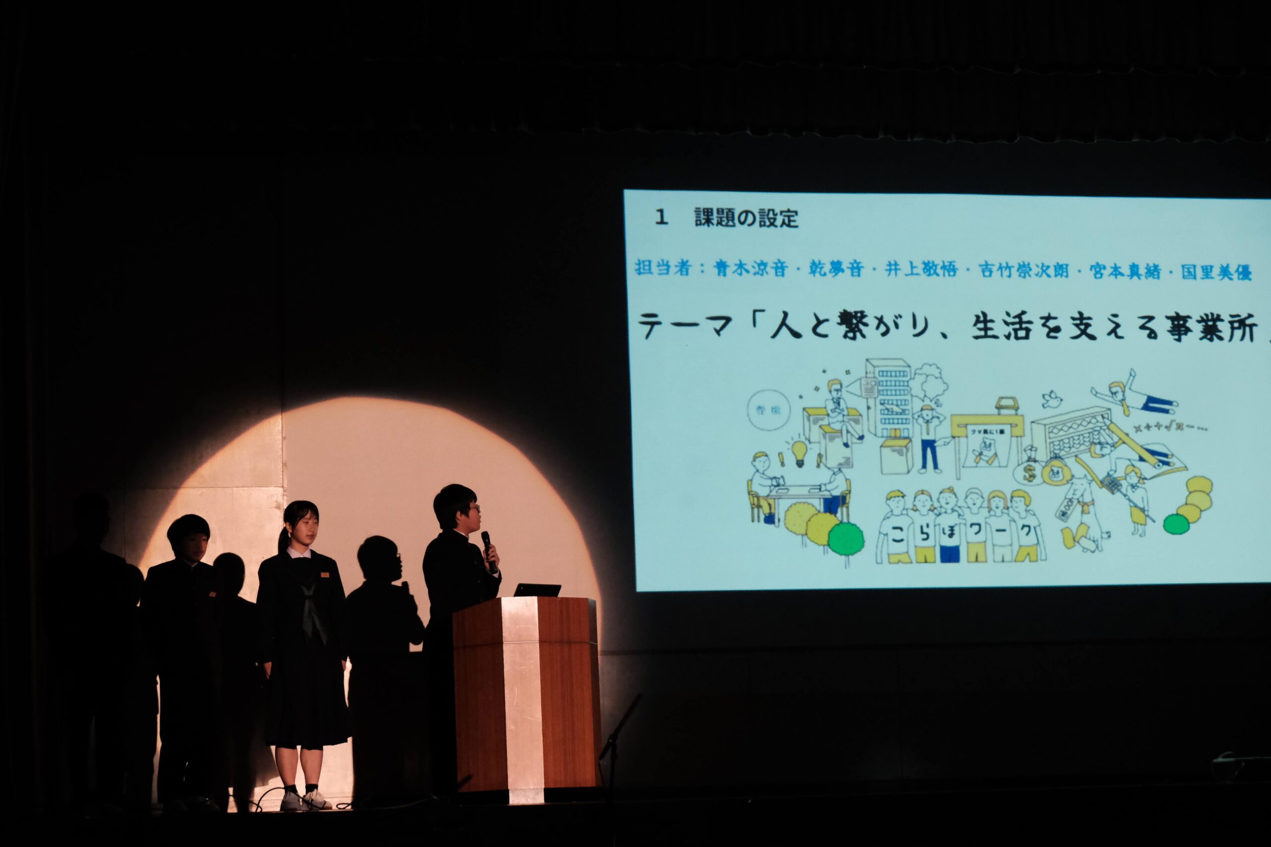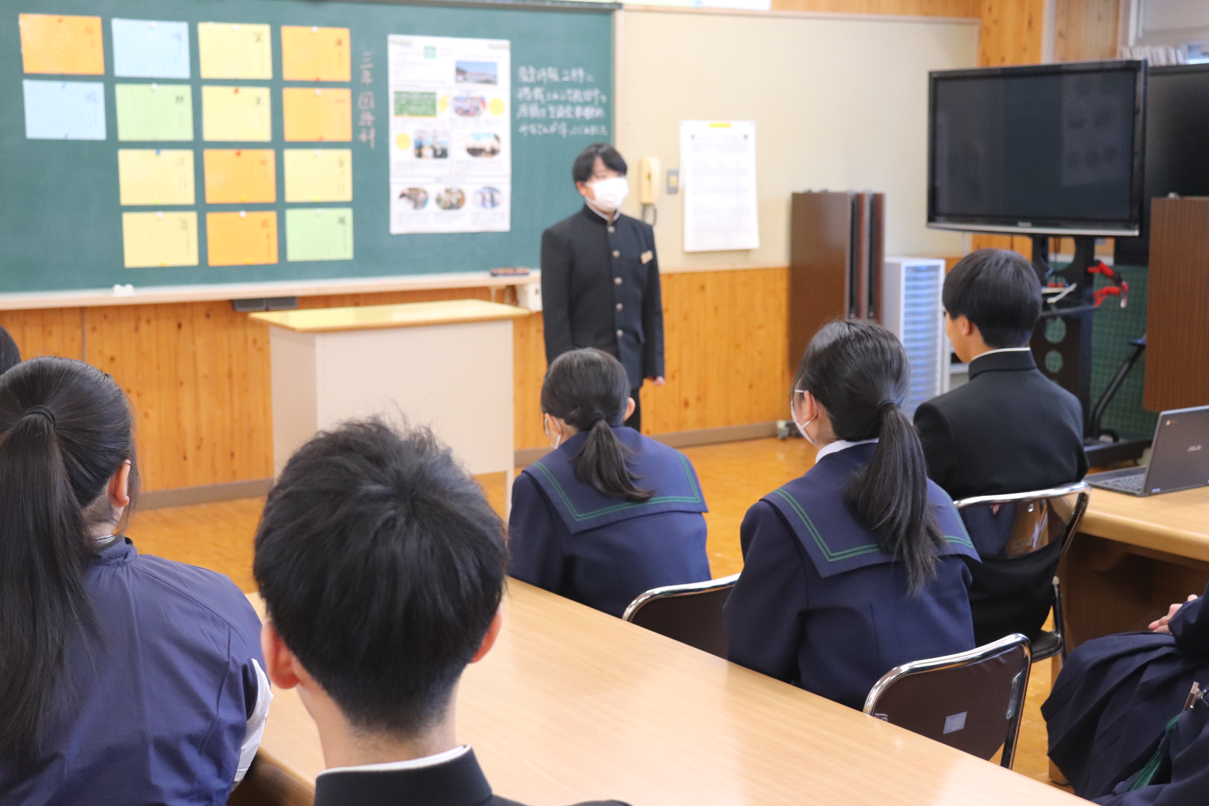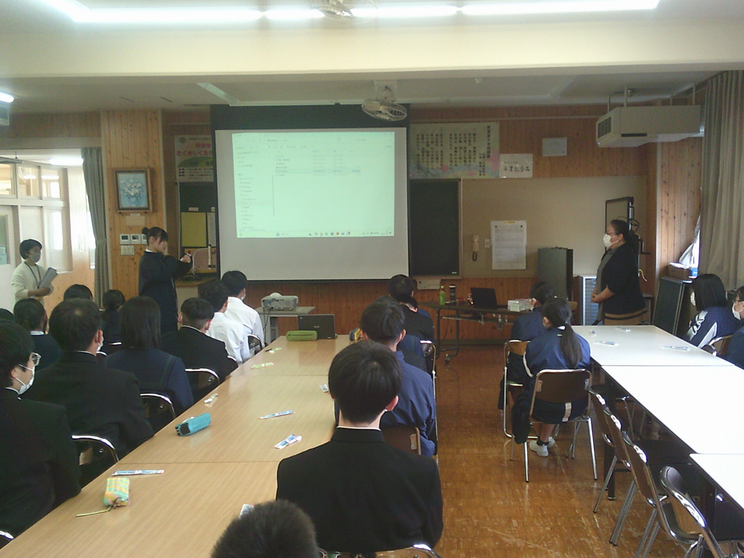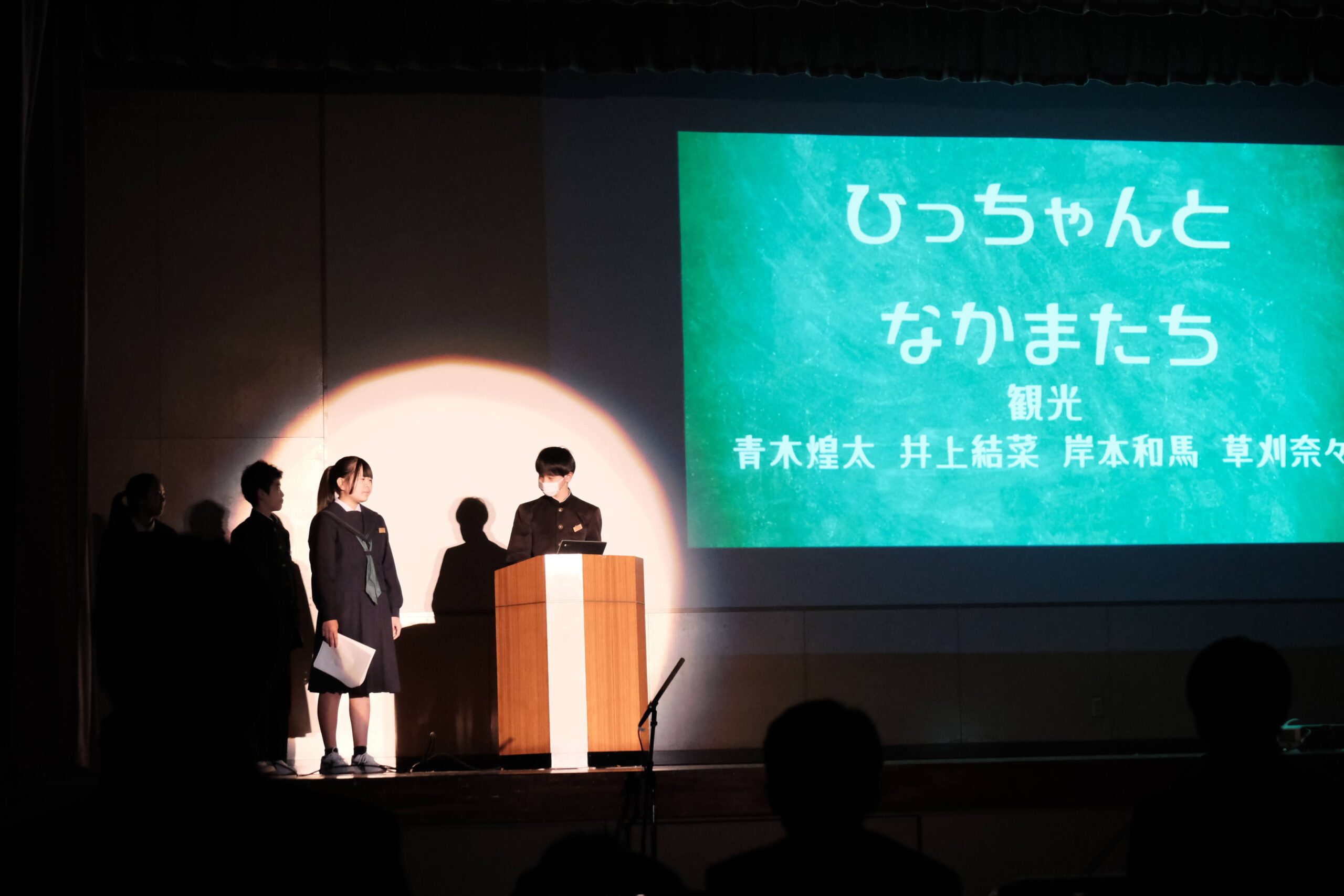 2年生は職場体験の報告会をひらき、1年生が参加しました。来年度の取り組みにむけて、とても参考になりました。