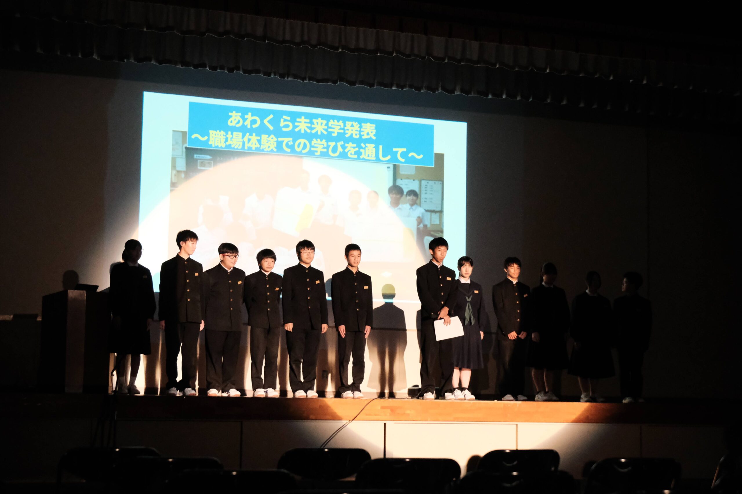 25日(土)の午前中は学習発表会でした。1,2年生は「あわくらみらい学」(地域探究学習)で調べたり、体験したりして考えたことをまとめて発表しました。小学校からの学びをつなぎ、地域について本気で考え、自分たちでできることを考え発表しました。学年が上がるにつれて、探究の深みも増し、あともう少しで、中学校発で地域を巻き込んでの取組になりそうなグループもいくつもありました。3年生は沖縄に行った修学旅行をもとに、オリジナルの劇とスライドを織り交ぜながら、「平和」について訴えました。これらの発表の前後や途中には、「私の主張作文」の発表や、夏季のオーストラリア研修の発表、全校生徒による合唱「TOMORROW」などもあり、充実した日となりました。廊下やランチルームでは、授業や夏季休業中に作成した各教科等の成果物の展示発表も行い、多くの方が中学生の力作を見て帰られました。11月にある、「村の文化祭」にもこれらの展示物は展示する予定です。また、あわくらみらい学の発表についても、動画や冊子で展示する予定です。ぜひ文化祭でも見学していただけたらと思います。
