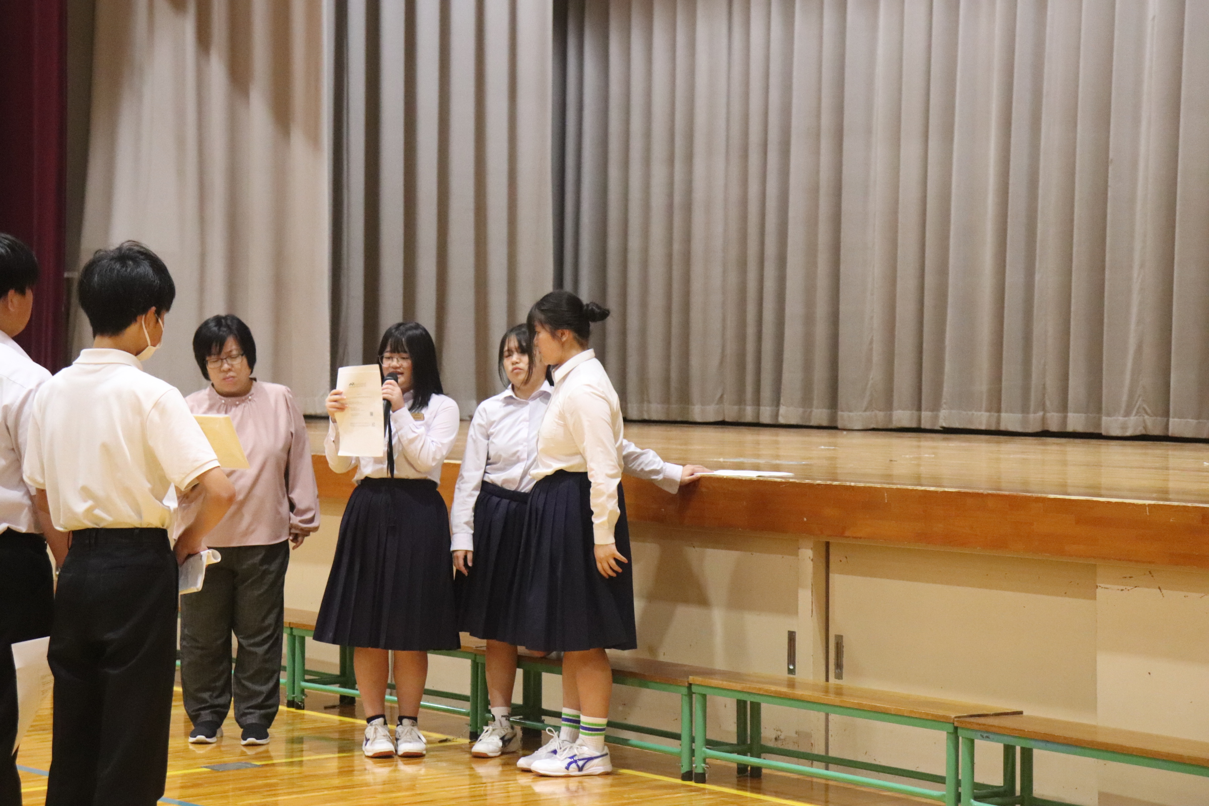2日の専門委員会を受けて、今朝は生徒集会が行われました。委員長として、委員会の取組を全校の前で初めて発表することとなります。前に出た生徒は、しっかり、自分の言葉で、今後の取組を発表していました。