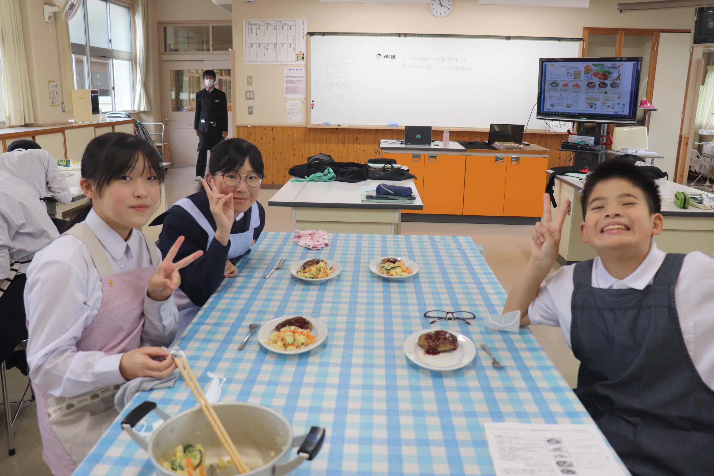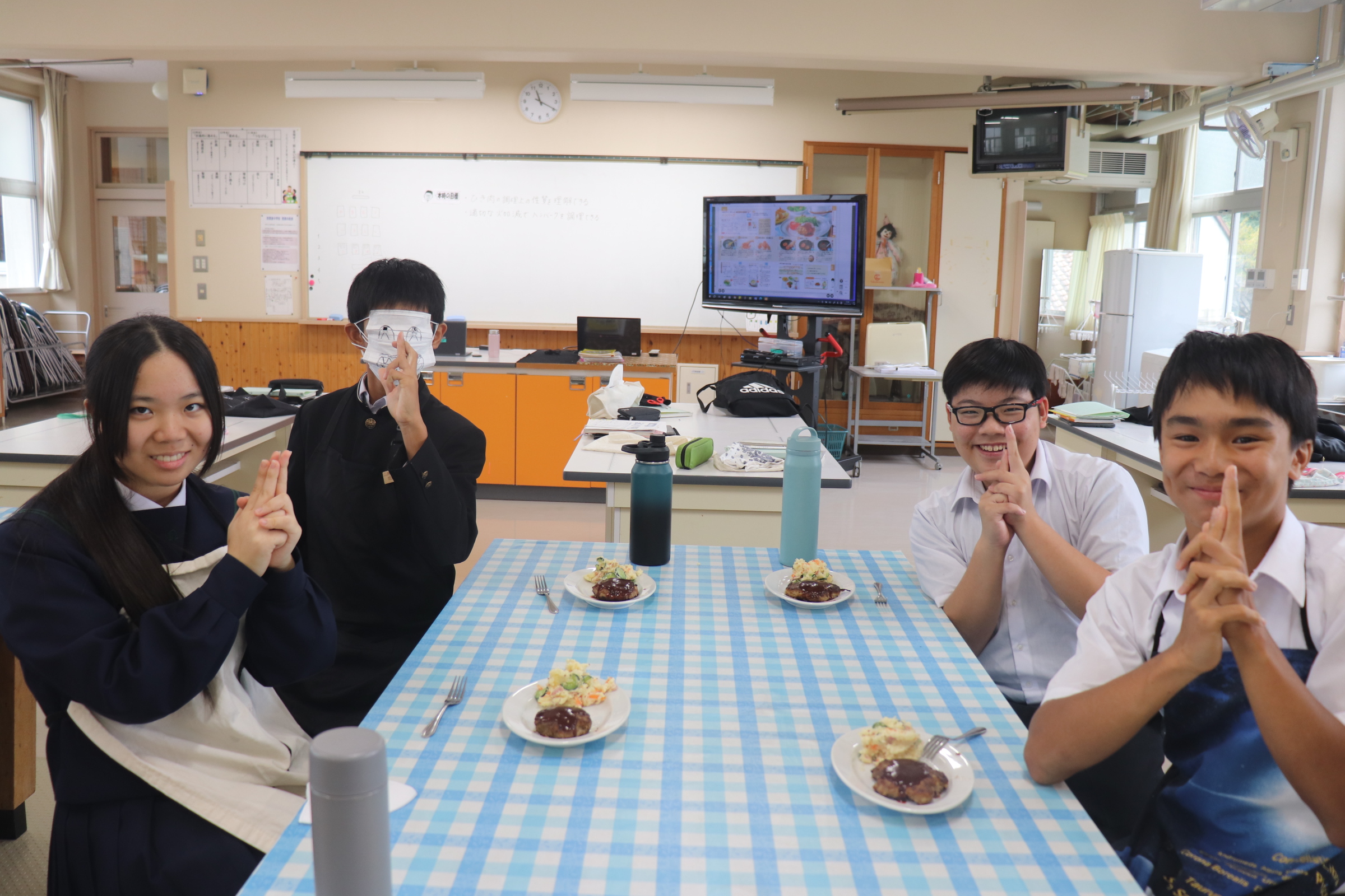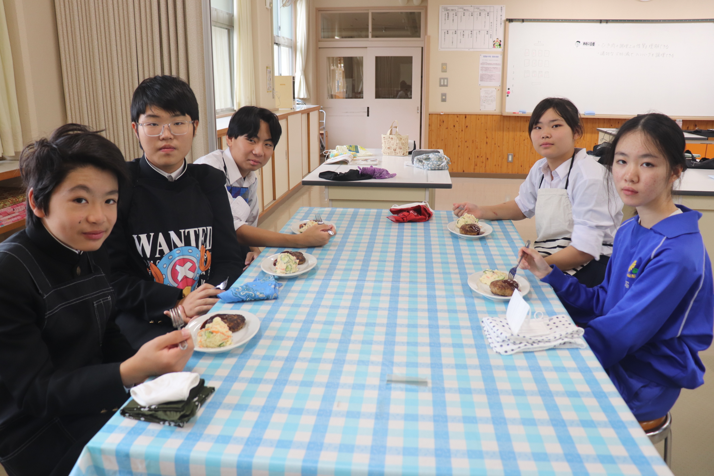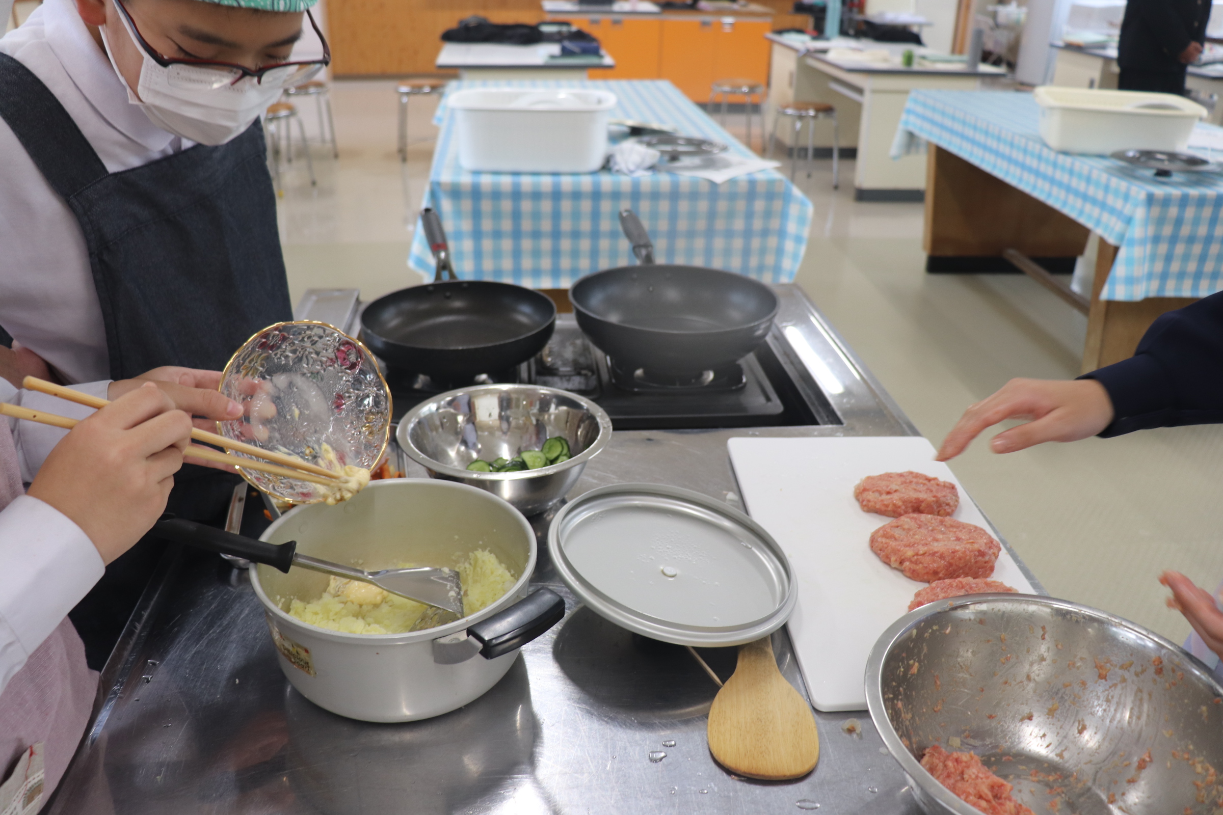 2年生は2、3時間目の家庭科で調理実習を行いました。今回の実習ではハンバーグとポテトサラダを作りました。それぞれのグループで協力しながらおいしく出来上がりました。職員室に届いたハンバーグ、絶品でした。
