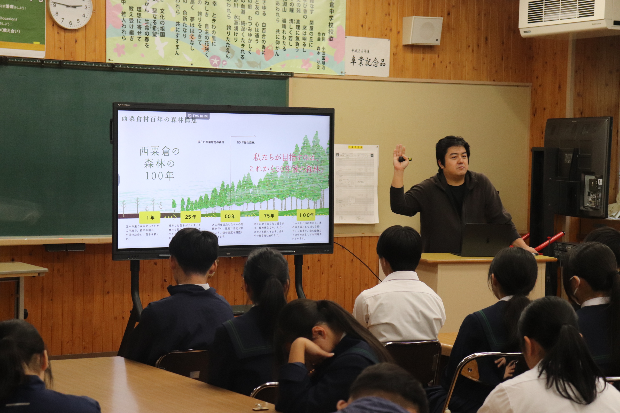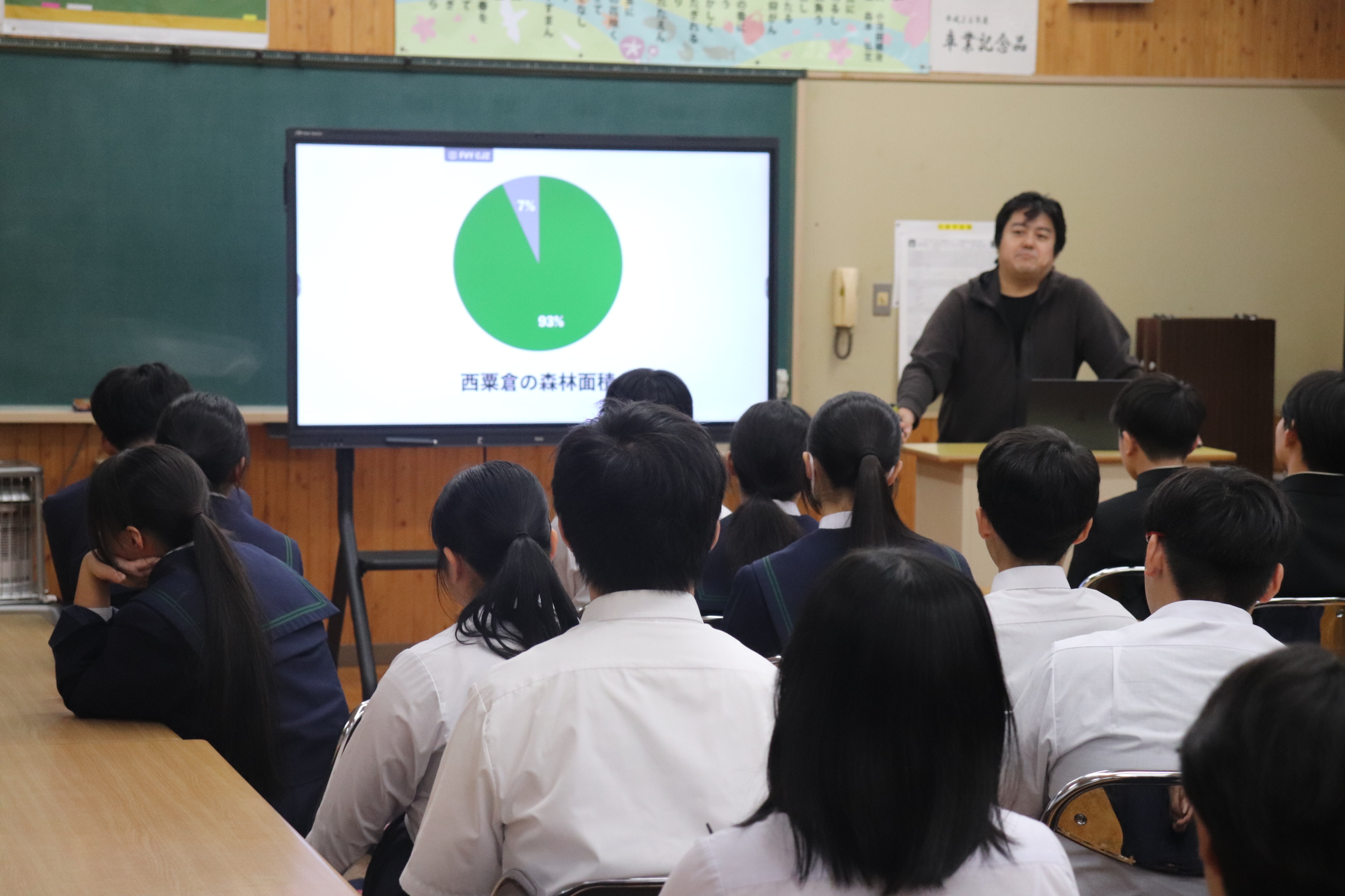 本日は雨天のため、森林教育の一貫として植林に行く予定を変更し、株式会社百森から田畑さんを迎えて校内で講義を行っていただきました。村の93%を占める森林が、戦後伐採されたのちに人工林としてスギやヒノキが植えられ、50~60年経過している現在、百年の森林構想(現在は百森2.0)を立て頑張っている西粟倉の森林活用について丁寧な話をしていただきました。これらの森林教育が、西粟倉から一旦外に出た時に、故郷の良さの一つとして自慢できる糧になればと思います。