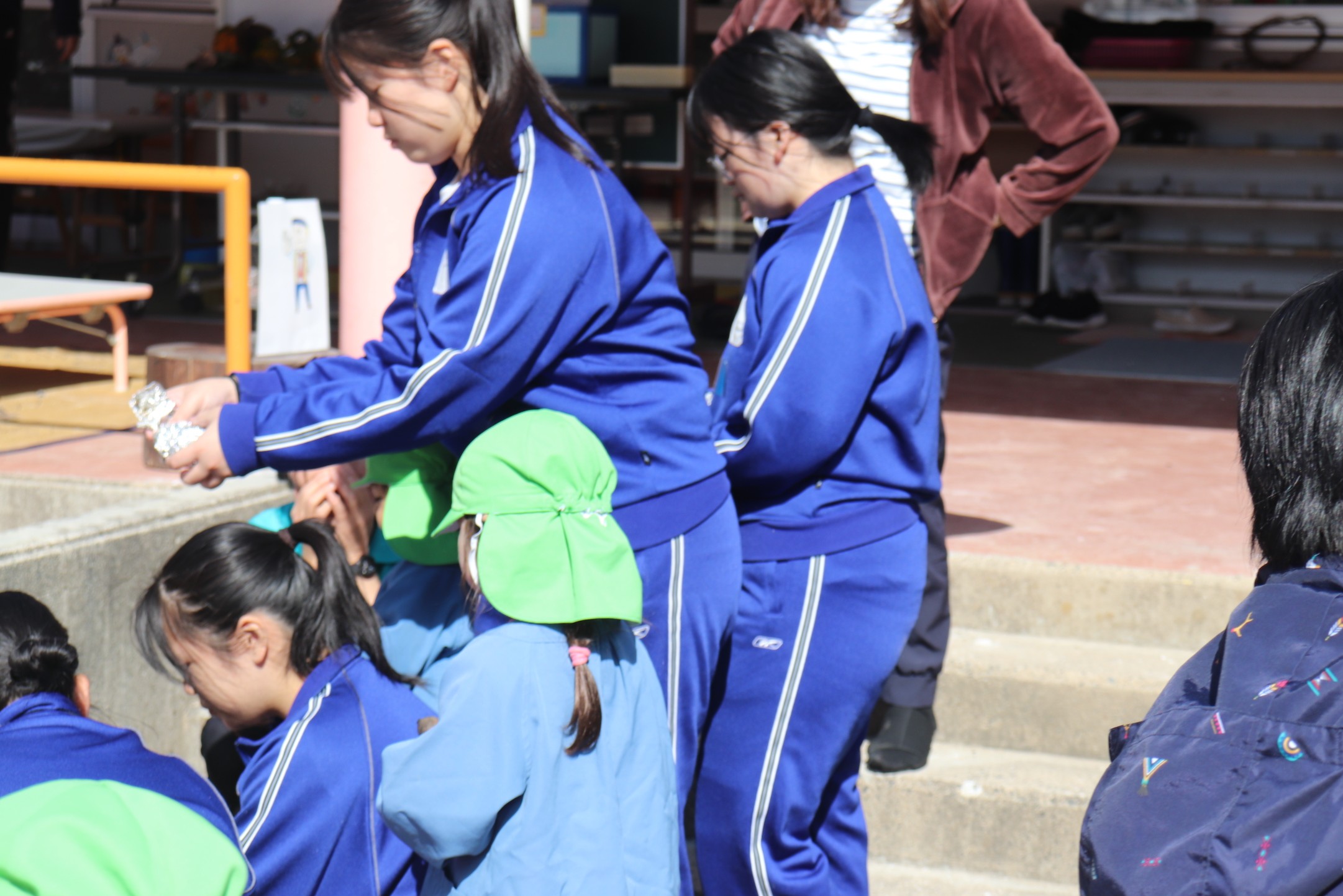 本日の2,3時間目の3年生は、幼稚園でのふれあい体験第2段です。先日の体験で掘った「サツマイモ」を朝から丁寧に焼き、焼き芋パーティーやクイズ大会など園児とふれあう貴重な体験を経験しました。一緒に遊ぶときには、自然と腰を下ろし、目線を下げたりする姿も見られました。この日に向けて製作したプレゼントのメダルを喜んで受け取ってもらった時には緊張もほぐれ、3年生にも笑顔がこぼれていました。事後に感想を聞いていると、ふれあい体験を通して、自分たちも幼い時に地域の多くの人から大切に愛情をもって育ててもらったことを再認識したり、今度は自分たちの番だと実感している様子が伺えました。