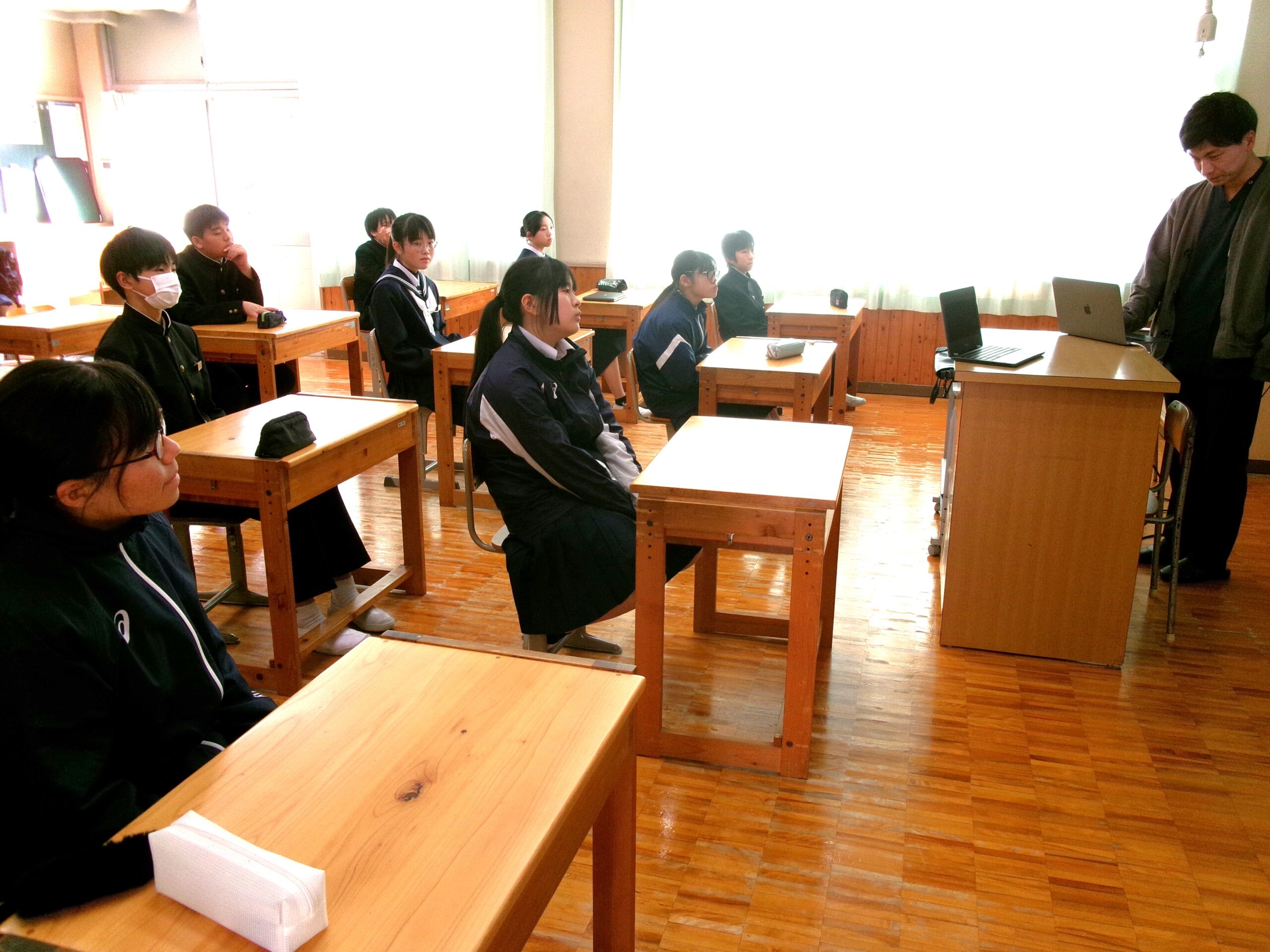 奈義ファミリークリニックの藤原Drを迎え、たばこが心身に及ぼす影響や周囲の人にも健康被害をもたらすことなどを学び、上手な断り方などをロールプレイ研修を交えながら学習しました。実施後、生徒の感想を読むと、「たばこの健康被害についてよく分かった」「身近な人がたばこを吸っていたら注意したい」「誘われてもきっぱり断りたい」といった意見が多くの生徒から上がっていました。