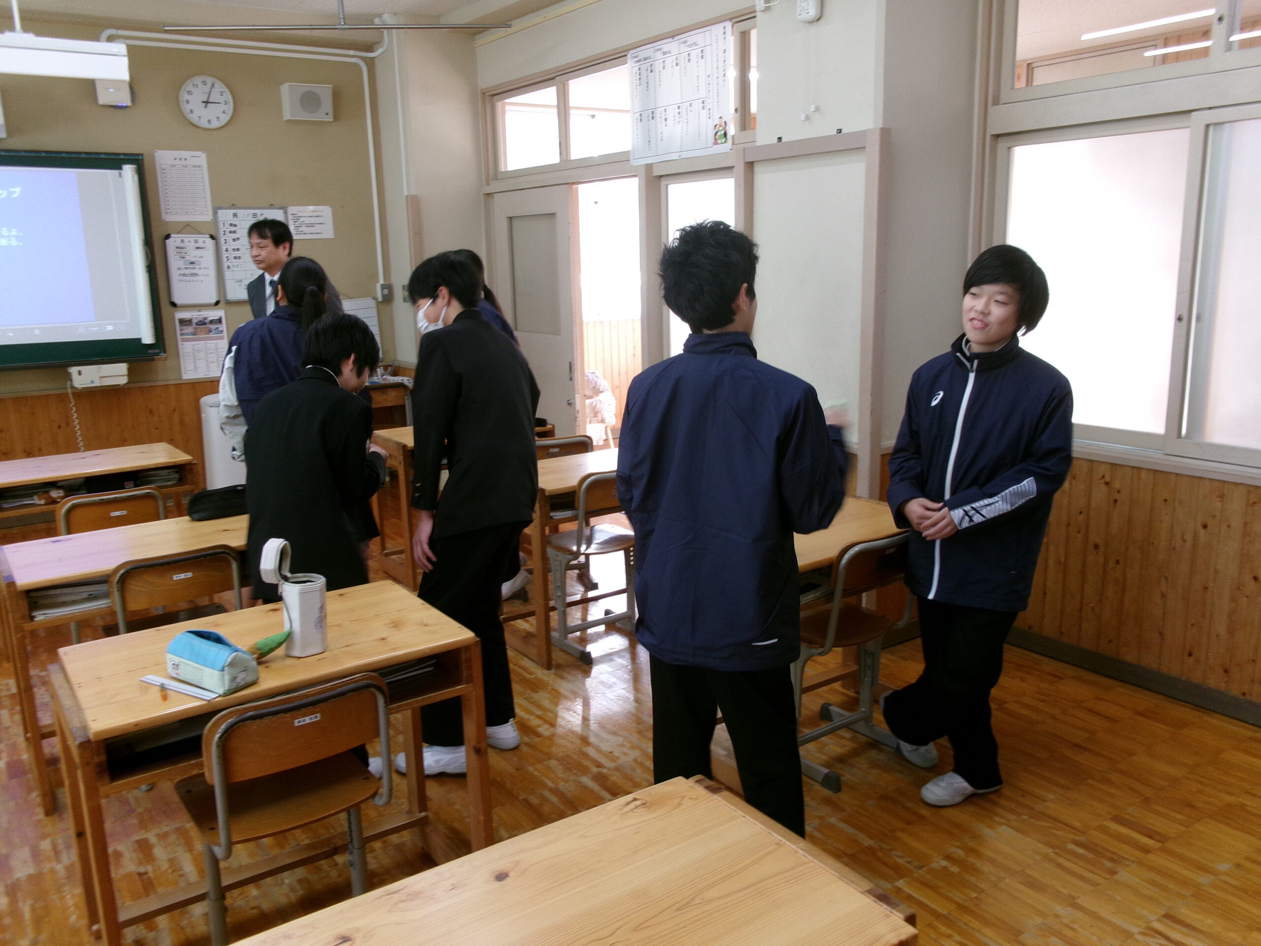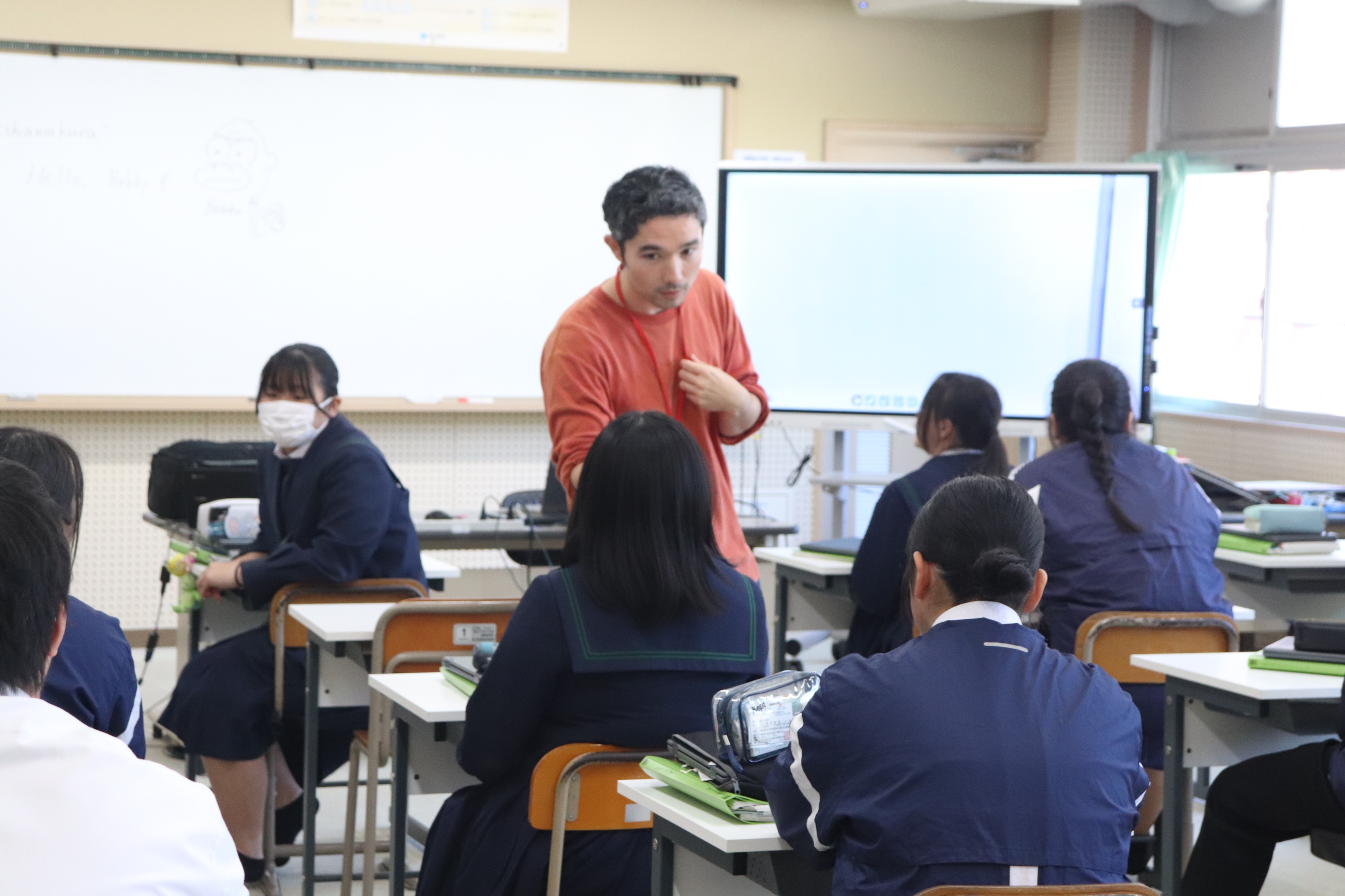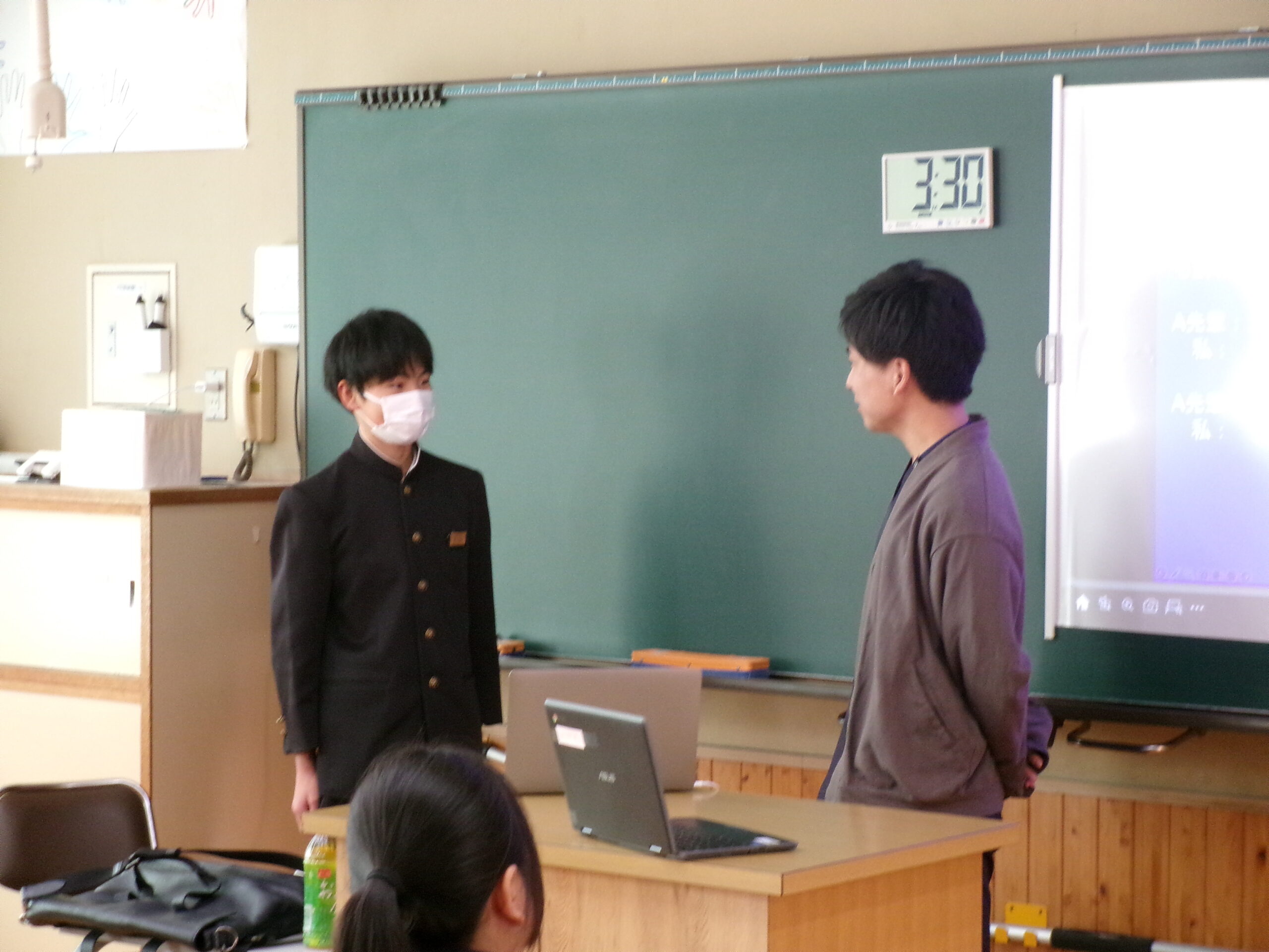 本日の3年生の英語の授業は、岡山市在住のボビー(Bobby)さんと遠隔で結んでの授業です。西粟倉を何度も訪れ、SNSでも西粟倉のことを発信しているボビーさんと準備していた質問だけではなく、即興で様々な質問に相互に応え、「使える英語」を体感しました。11月にはボビーさんが本校を訪問し、対面での授業があります。その際には、中3生の感じている西粟倉の魅力がしっかりアピールできたらいいですね。