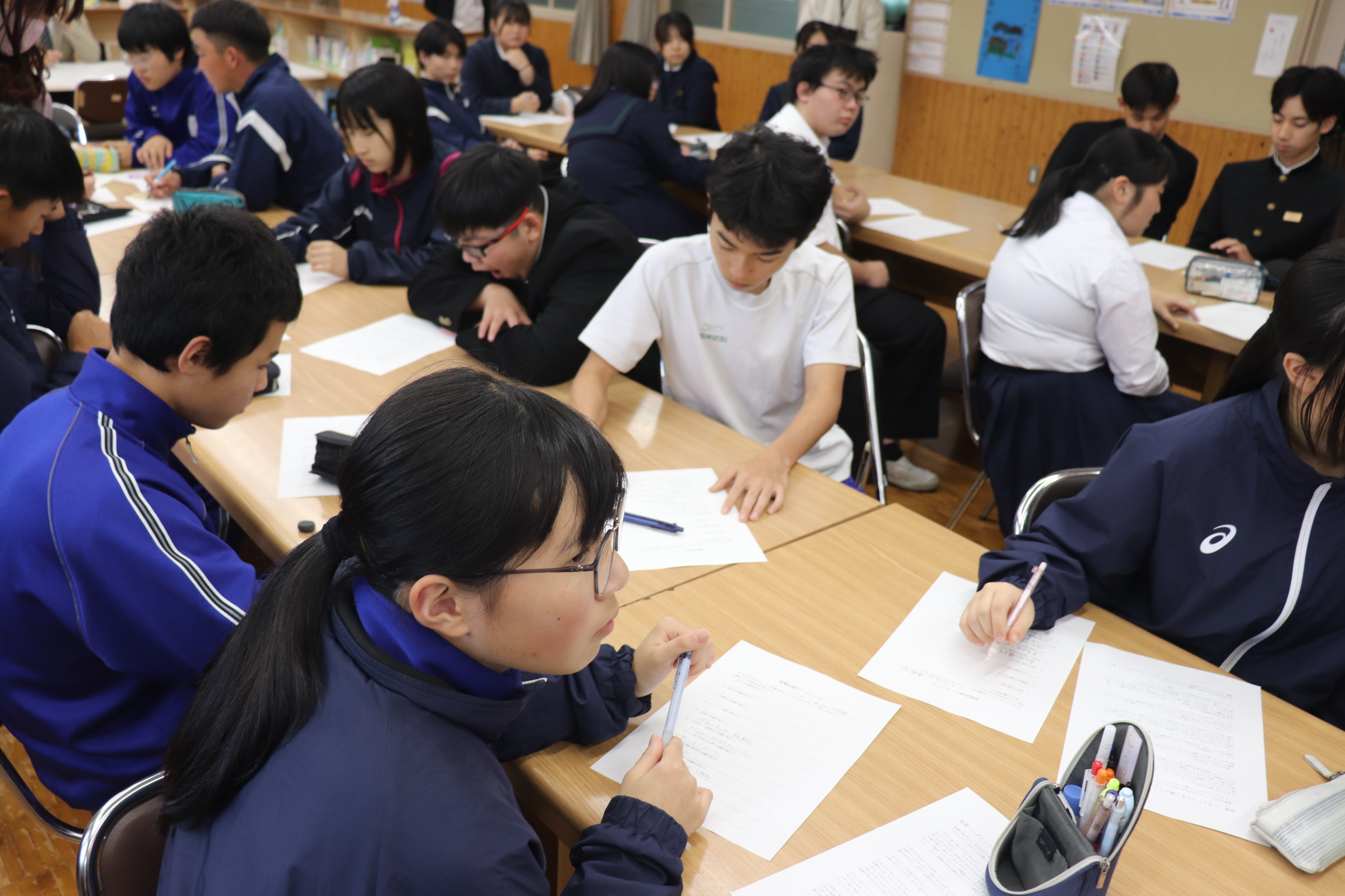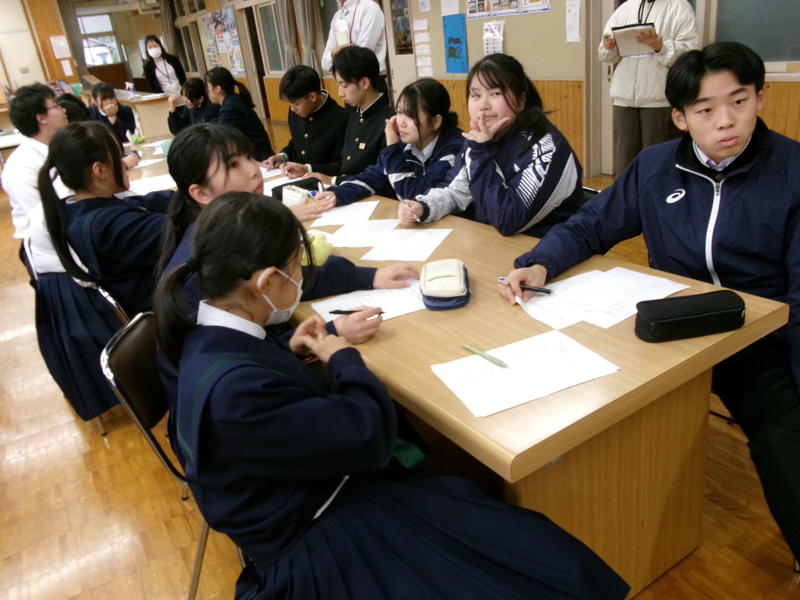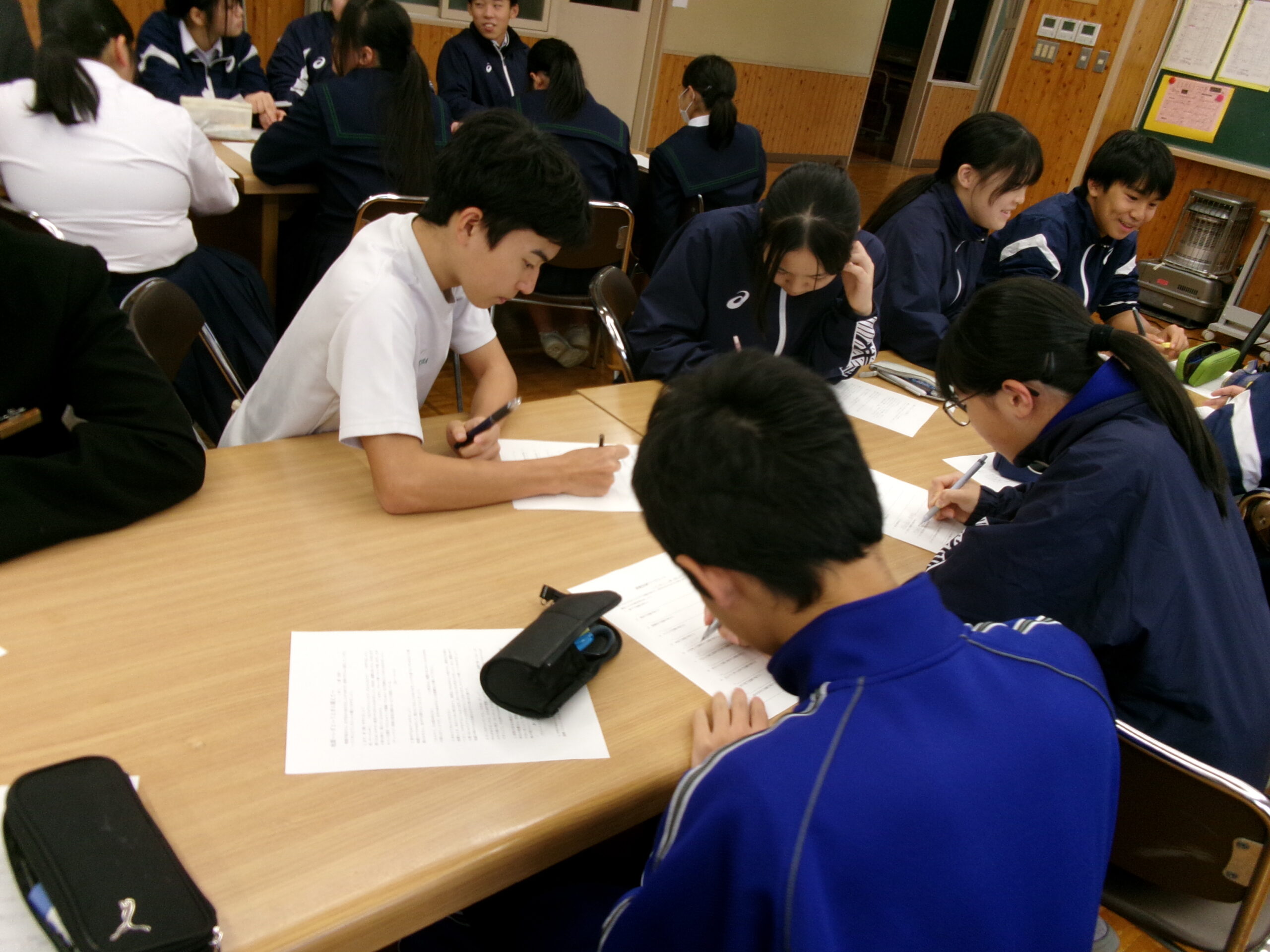 5時間目には地震による避難訓練を行いました。生徒にとっては抜き打ちで、授業開始直前に緊急地震速報の訓練の音声がなり、とっさに身を守る行動をとりながら、指示を待ってグランドへの避難となります。避難は整然と行われ、短時間で全員の避難の確認が取れました。その後、オープンスペースに戻り、様々な状況で地震が起こった時にどうすればよいかを考えたり、全国で起こる可能性のある巨大地震や西粟倉村で想定される地震はどのようなものが考えられるのか、避難する際のポイントや避難所での共助についてなどの話を校長先生からしていただきました。授業で使用したワークシートは、記入後、保護者の方にも見ていただくような設計にしています。村のHPには、様々な想定も含めて丁寧に示されています。家庭でも家族が離れ離れになった際の合流のしかたなどを是非話し合っていただけたらと思います。