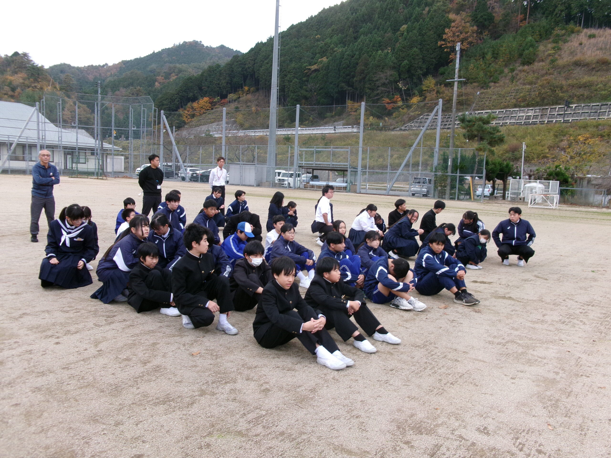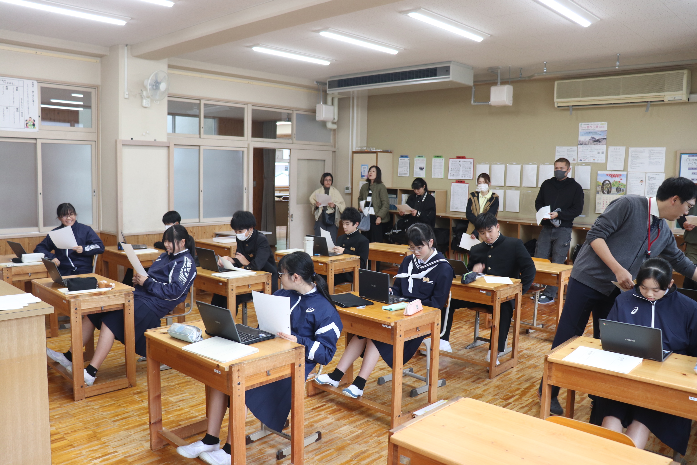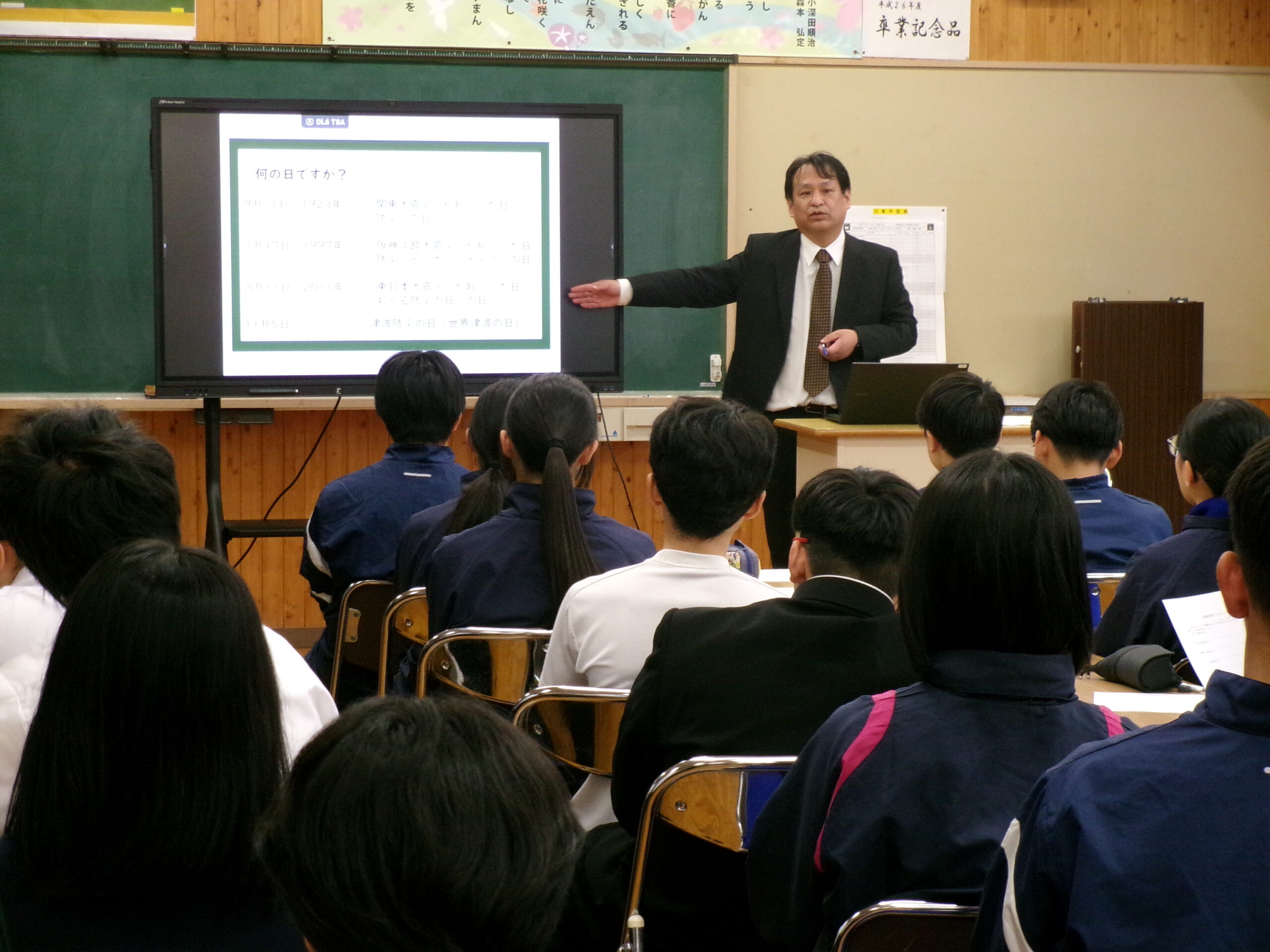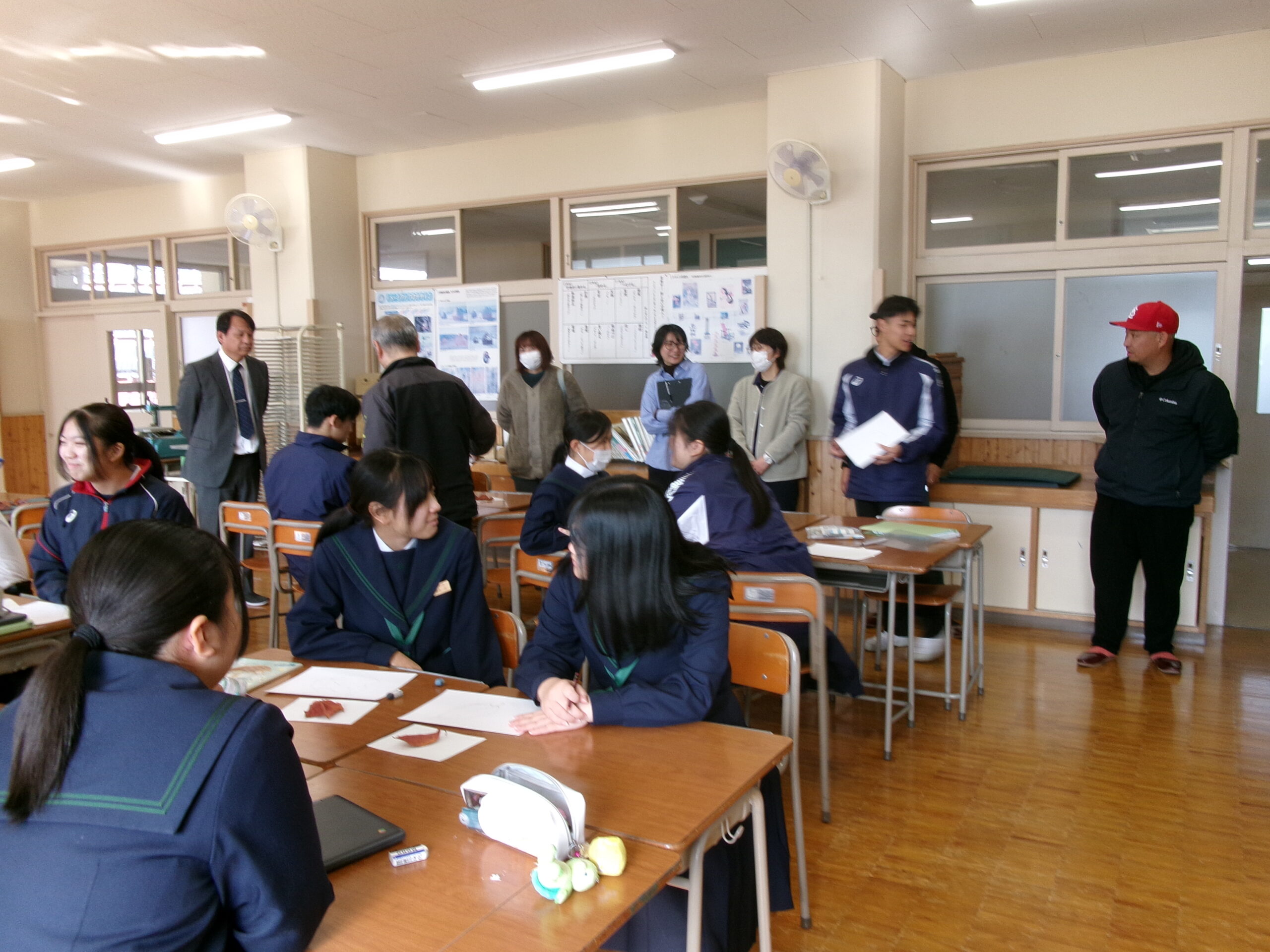 5時間目には地震による避難訓練を行いました。生徒にとっては抜き打ちで、授業開始直前に緊急地震速報の訓練の音声がなり、とっさに身を守る行動をとりながら、指示を待ってグランドへの避難となります。避難は整然と行われ、短時間で全員の避難の確認が取れました。その後、オープンスペースに戻り、様々な状況で地震が起こった時にどうすればよいかを考えたり、全国で起こる可能性のある巨大地震や西粟倉村で想定される地震はどのようなものが考えられるのか、避難する際のポイントや避難所での共助についてなどの話を校長先生からしていただきました。授業で使用したワークシートは、記入後、保護者の方にも見ていただくような設計にしています。村のHPには、様々な想定も含めて丁寧に示されています。家庭でも家族が離れ離れになった際の合流のしかたなどを是非話し合っていただけたらと思います。