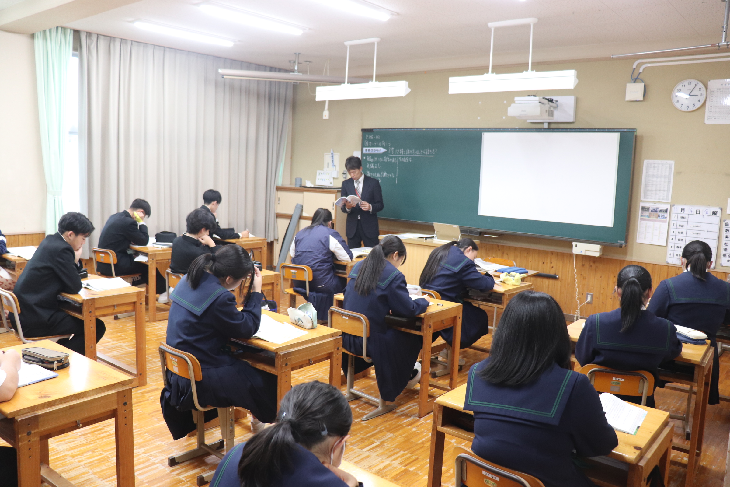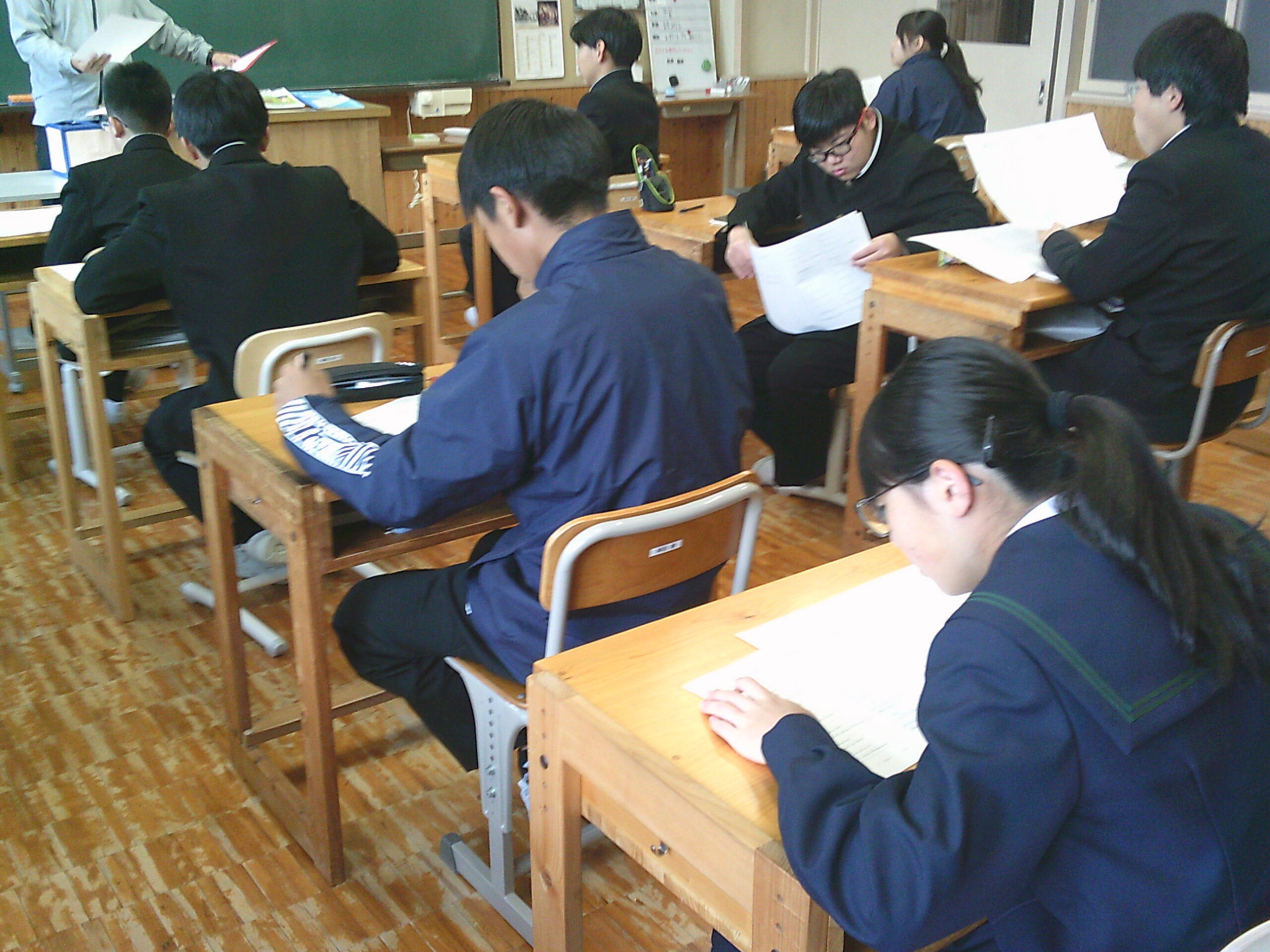 本日4限の3年生の英語の授業では、岡山県の実施委託による英検IBAのテストを実施しました。希望する級に分かれて通常の授業ではない英語のテストに対して、生徒は問題に真摯に向き合い熱心に回答をしていました。