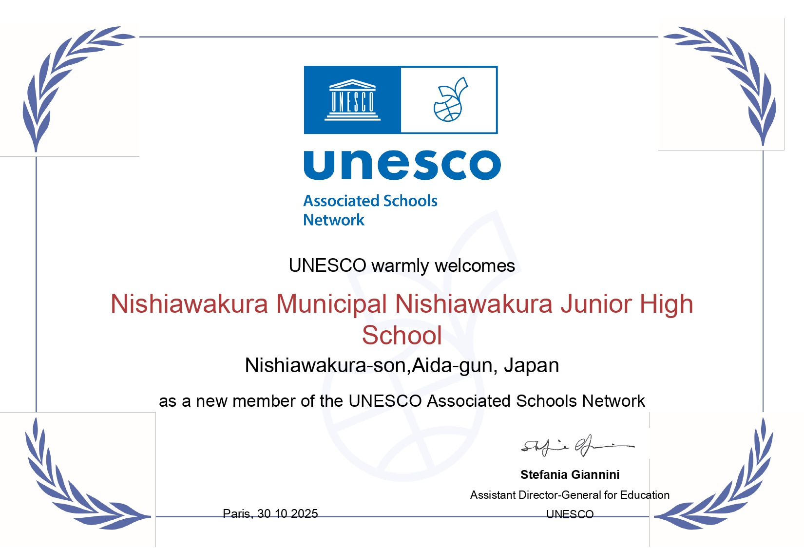 ユネスコ(国際連合教育科学文化機関、United Nations Educational, Scientific and Cultural Organization U.N.E.S.C.O.)は、諸国民の教育、科学、文化の協力と交流を通じて、国際平和と人類の福祉の促進を目的とした国際連合の専門機関です。文部科学省及び日本ユネスコ国内委員会では、ユネスコスクールを持続可能な開発のための教育(ESD)の推進拠点として位置付けています。本校のSDGsの取組をはじめ、様々な取り組みが認められ、フランス本部からこのような認定証が届きました。この認定証は職員室前の廊下に額に入れて掲示をしています。この認定証を励みに、さらに様々な活動に取り組んでいきましょう。