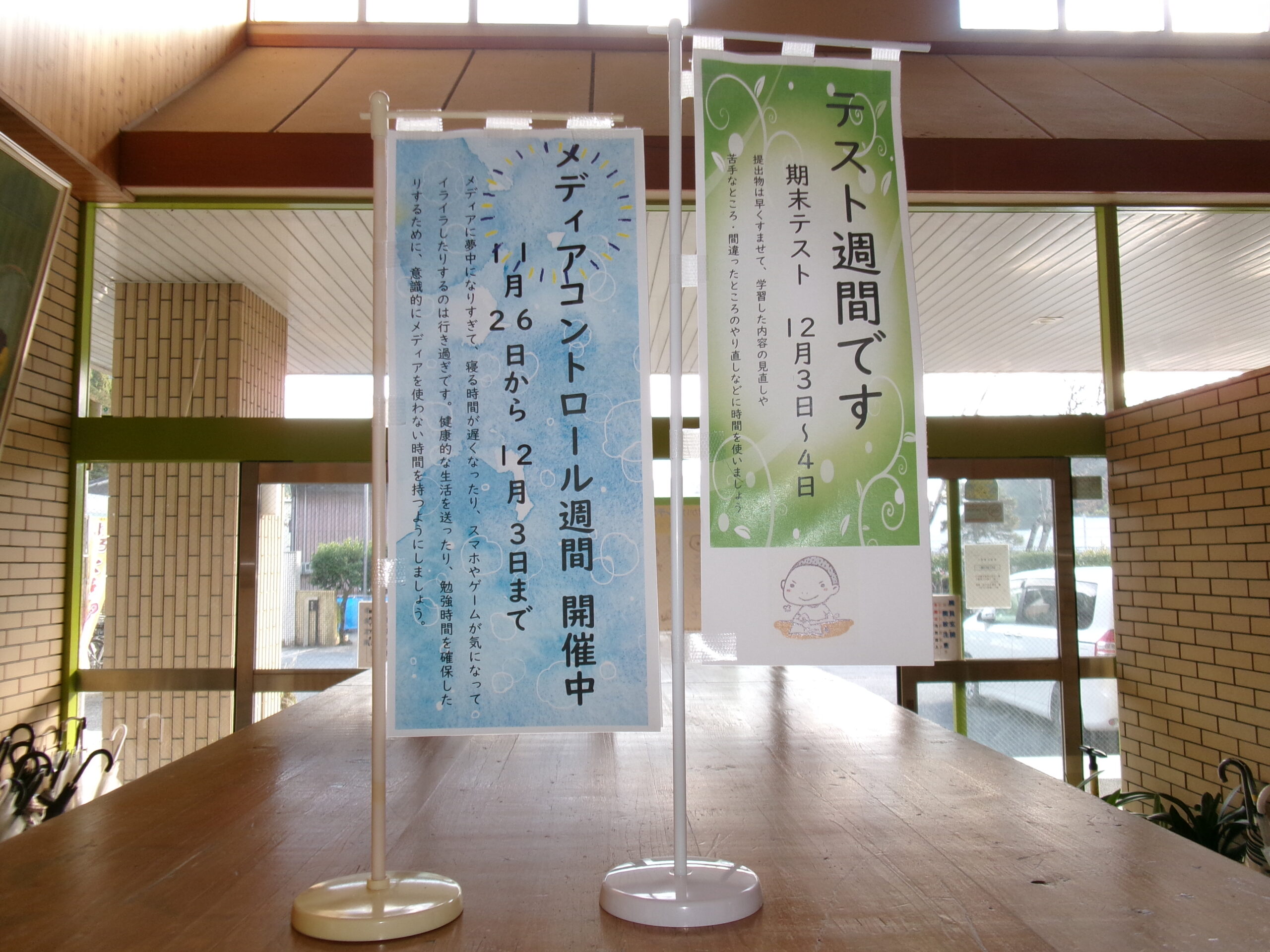 期末テストに向けて、連休や学校行事の関係で21日(金)にテスト範囲及び計画表を配布し、テスト勉強を頑張っていることと思います。学校でも、皆さんを応援しようと小さなのぼり旗を準備しました。少しだけメディアとの接触を控え、期末テストで目標とする点数が取れるよう、これまでの学習をしっかり復習して下さい。