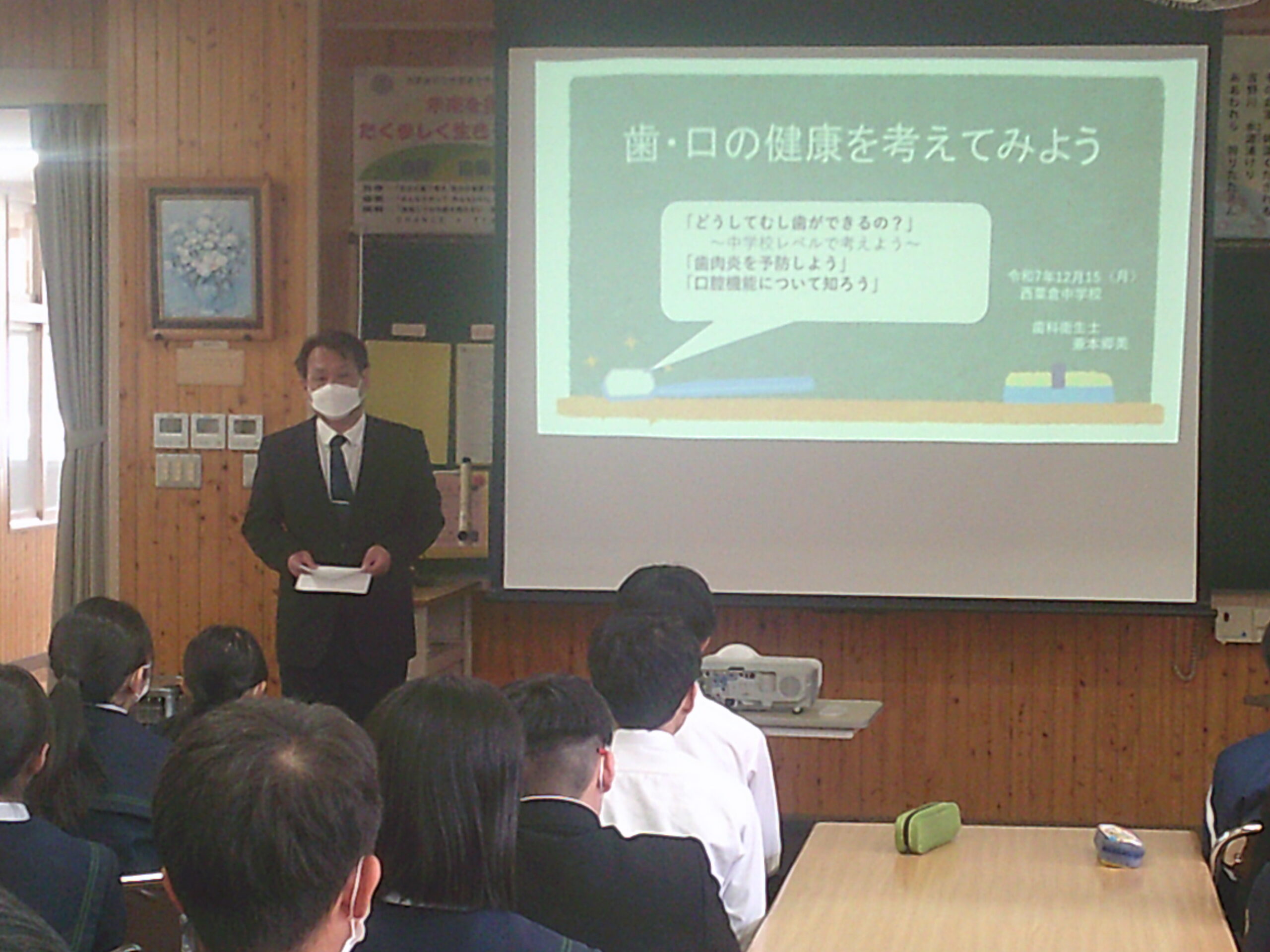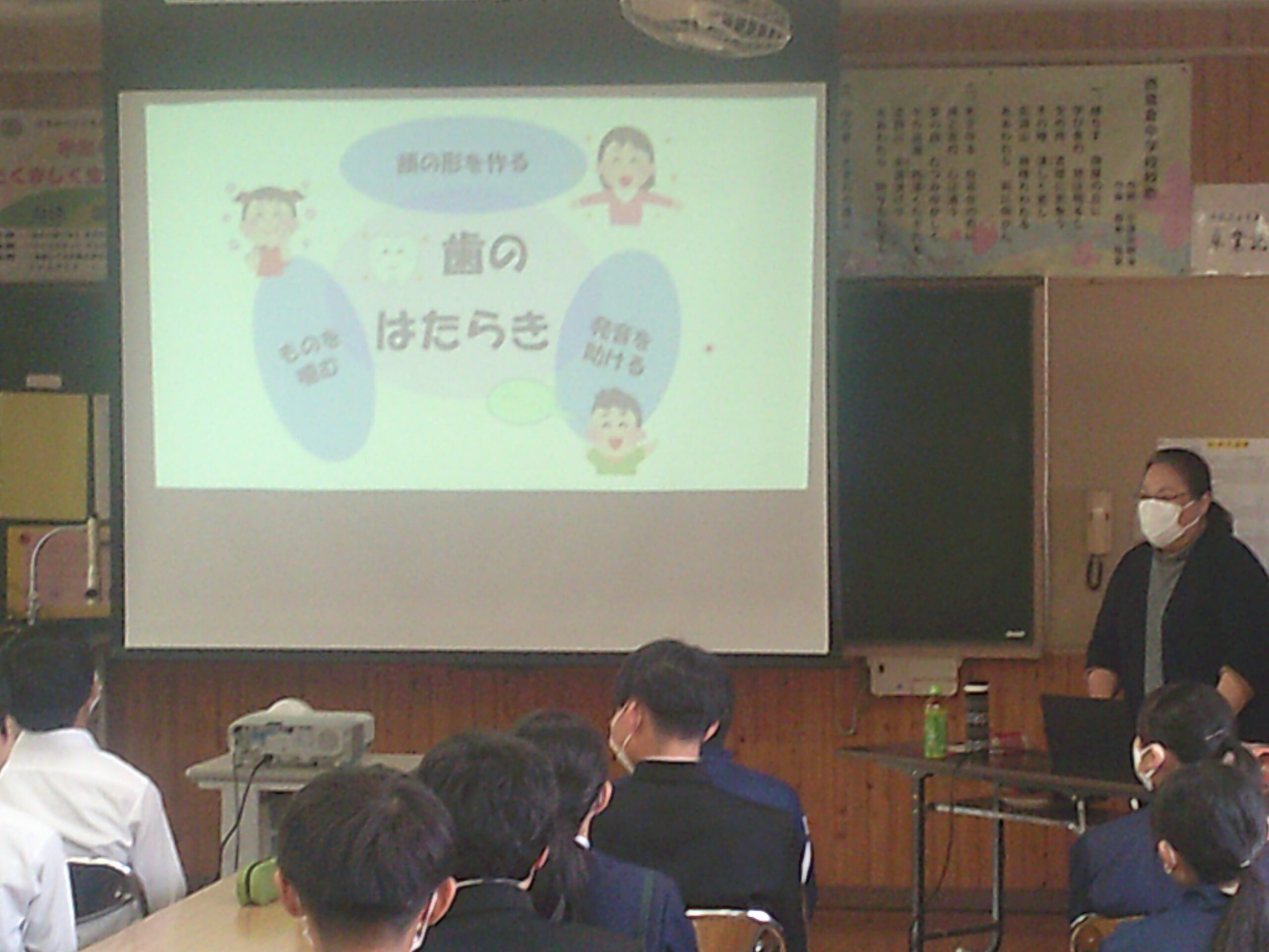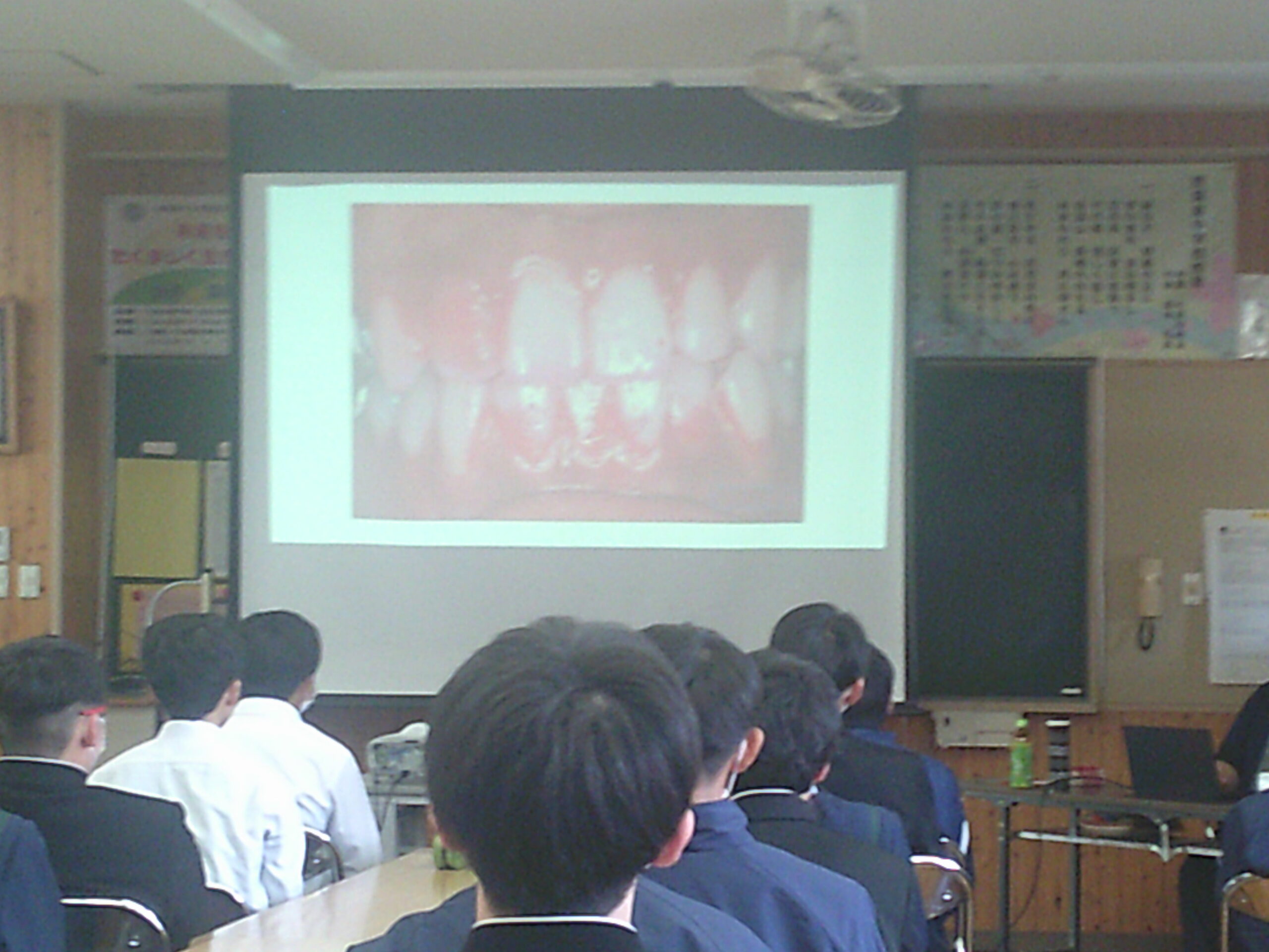 本日3限は、歯科衛生士の兼本先生をお迎えして、全校一斉に「歯」について考える時間をもちました。人が生きていく上で「食べる」ことは重要なことです。自分の咀嚼力を知り、しっかり噛んで食べることで、口腔内の健康も保たれます。今日の話を聞いて、「これからはしっかり噛んで食べよう」「『咀嚼力チェックガム』で自分のかむ力を確かめてみたい」といった生徒の声が多数上がっていました。歯科検診の結果を受けてまだ通院し処置をしていない歯がある人は、早めに受診をして健康的な口腔内を保ちましょう。