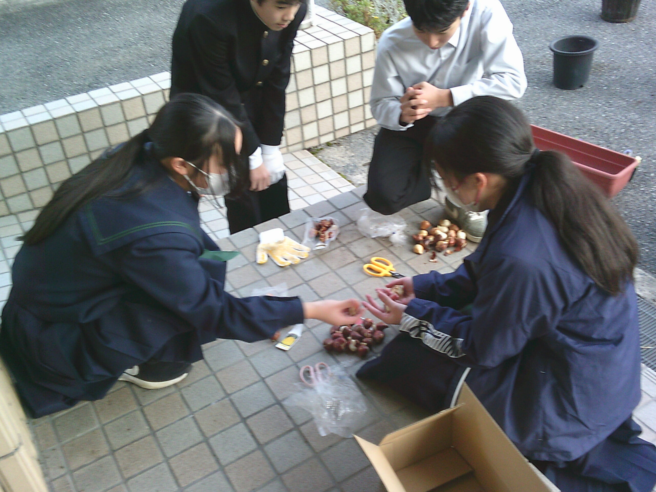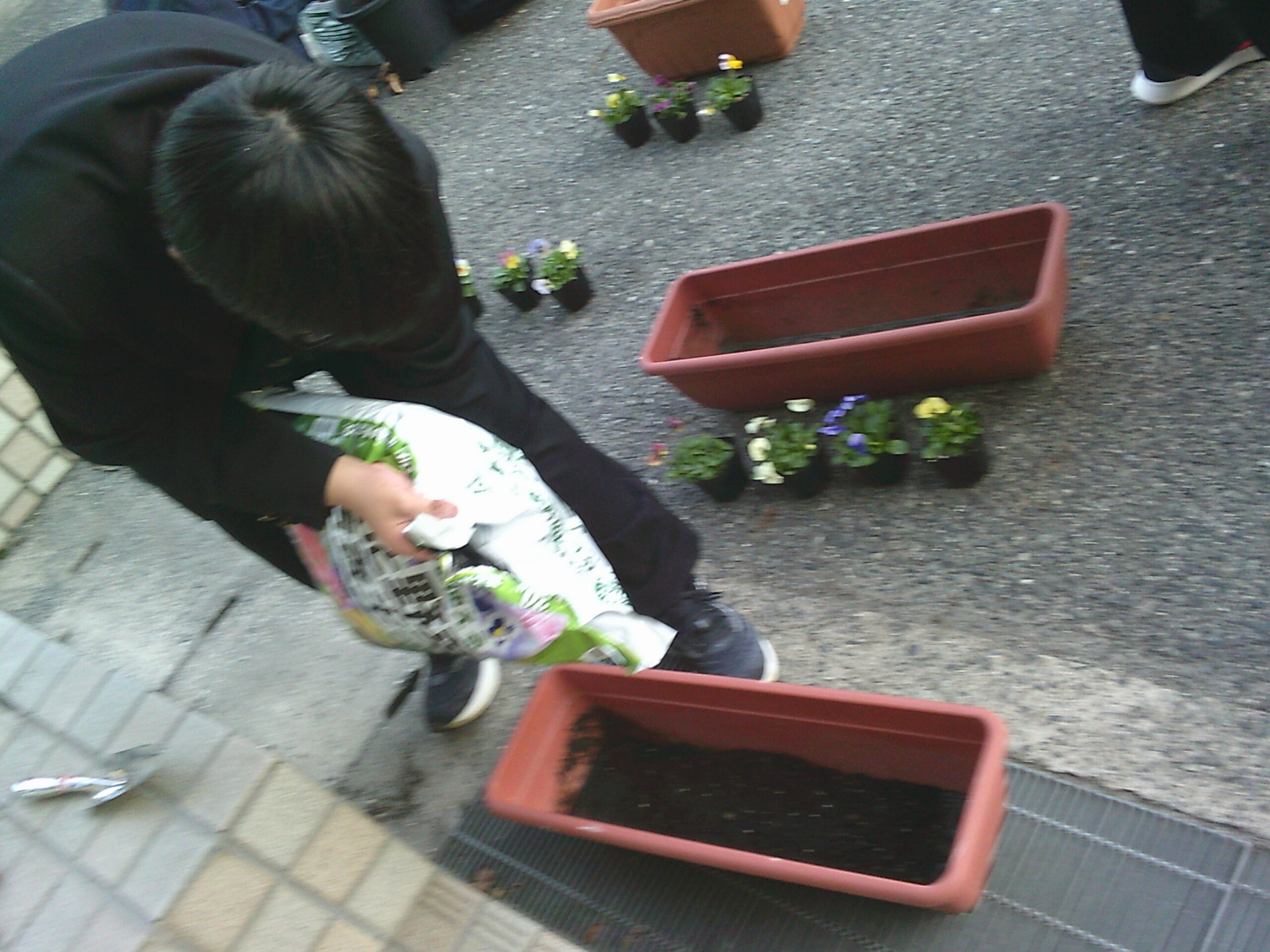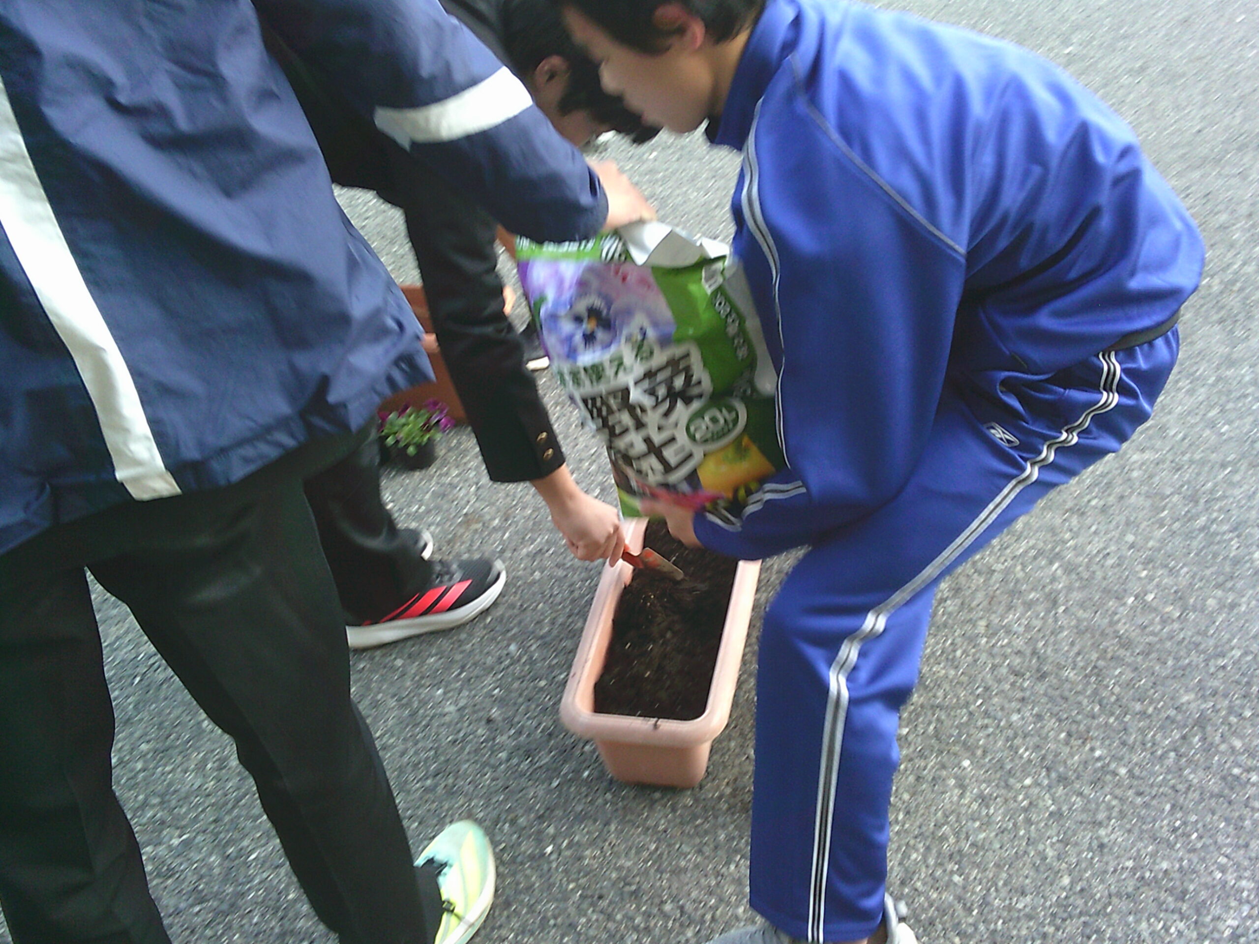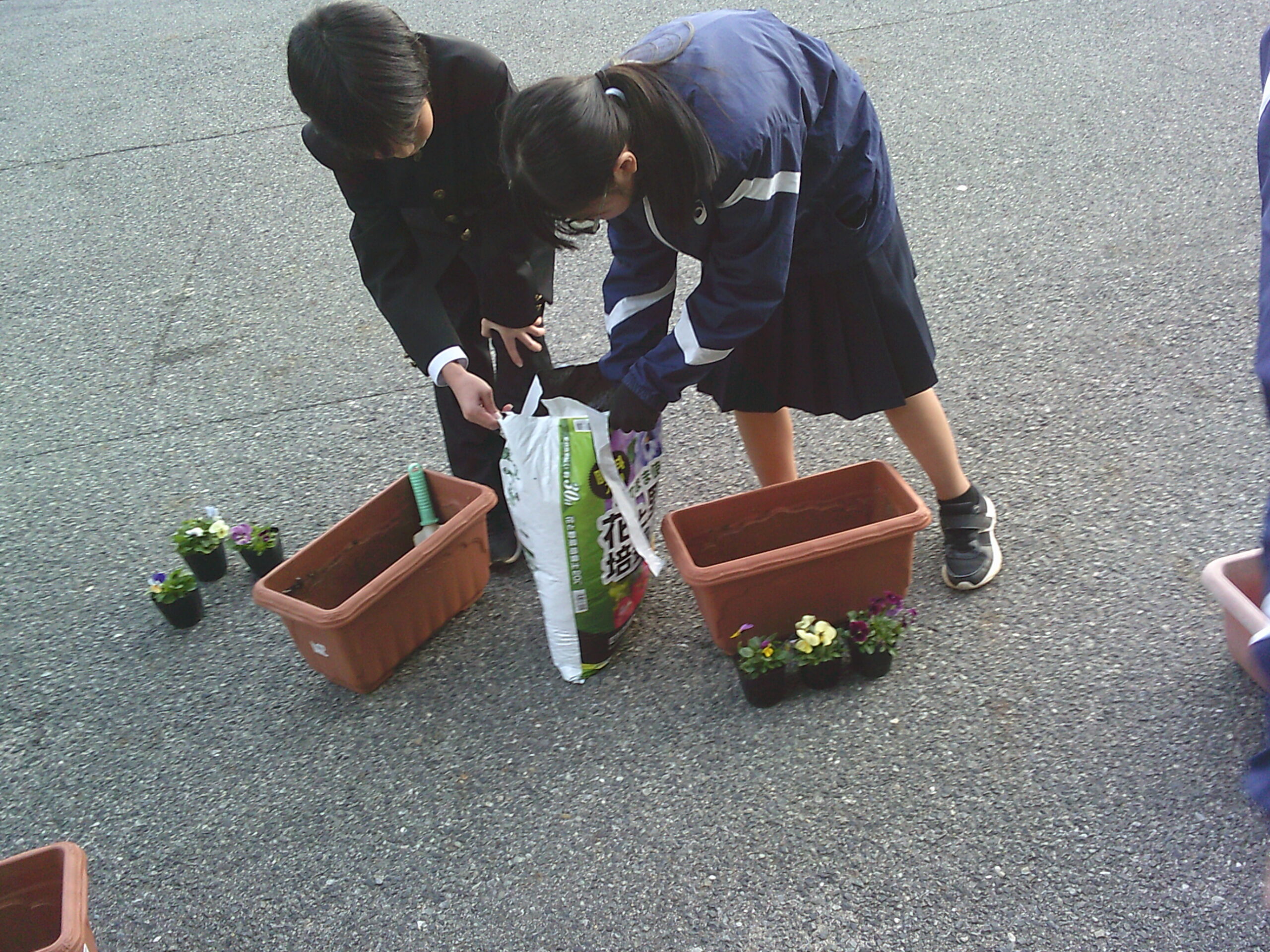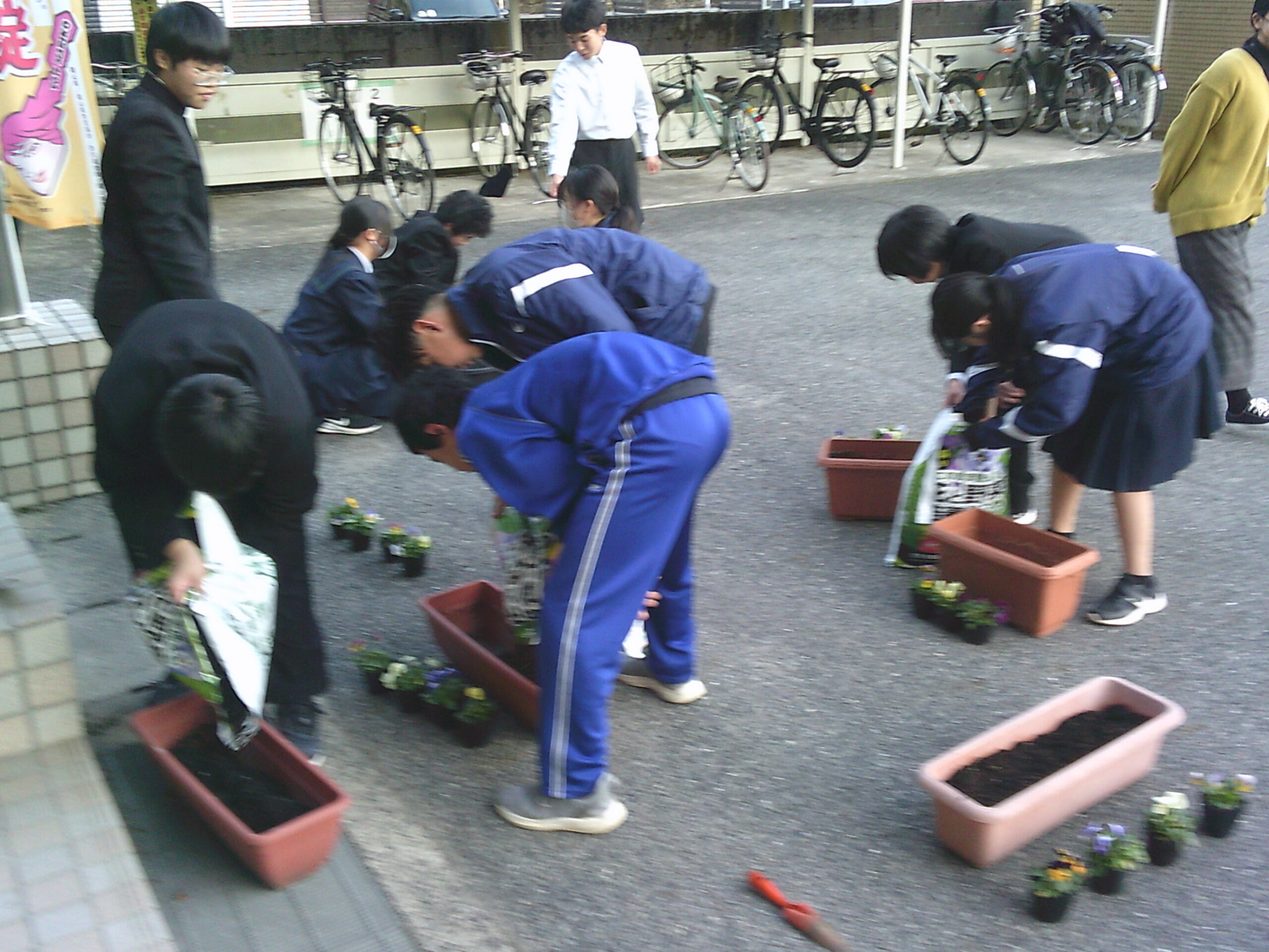 生徒会の整備文化委員会とボランティアの人たちで放課後プランターにビオラの苗やイチゴの苗、チューリップの球根を植えました。冒頭、整備文化委員長から、卒業式にきれいな花が咲くよう、丁寧に植えていこうという掛け声のもと、集まった十数人の生徒は次々と丁寧に土を入れ、苗や球根を植えていきました。とりあえず、玄関前に置いていますが、今後天候を見て一時避難をさせながら、大きく立派な花が咲くよう、大切に育てていきたいと思います。きっと3年生も、後輩たちの思いを受け止めてくれることでしょう。