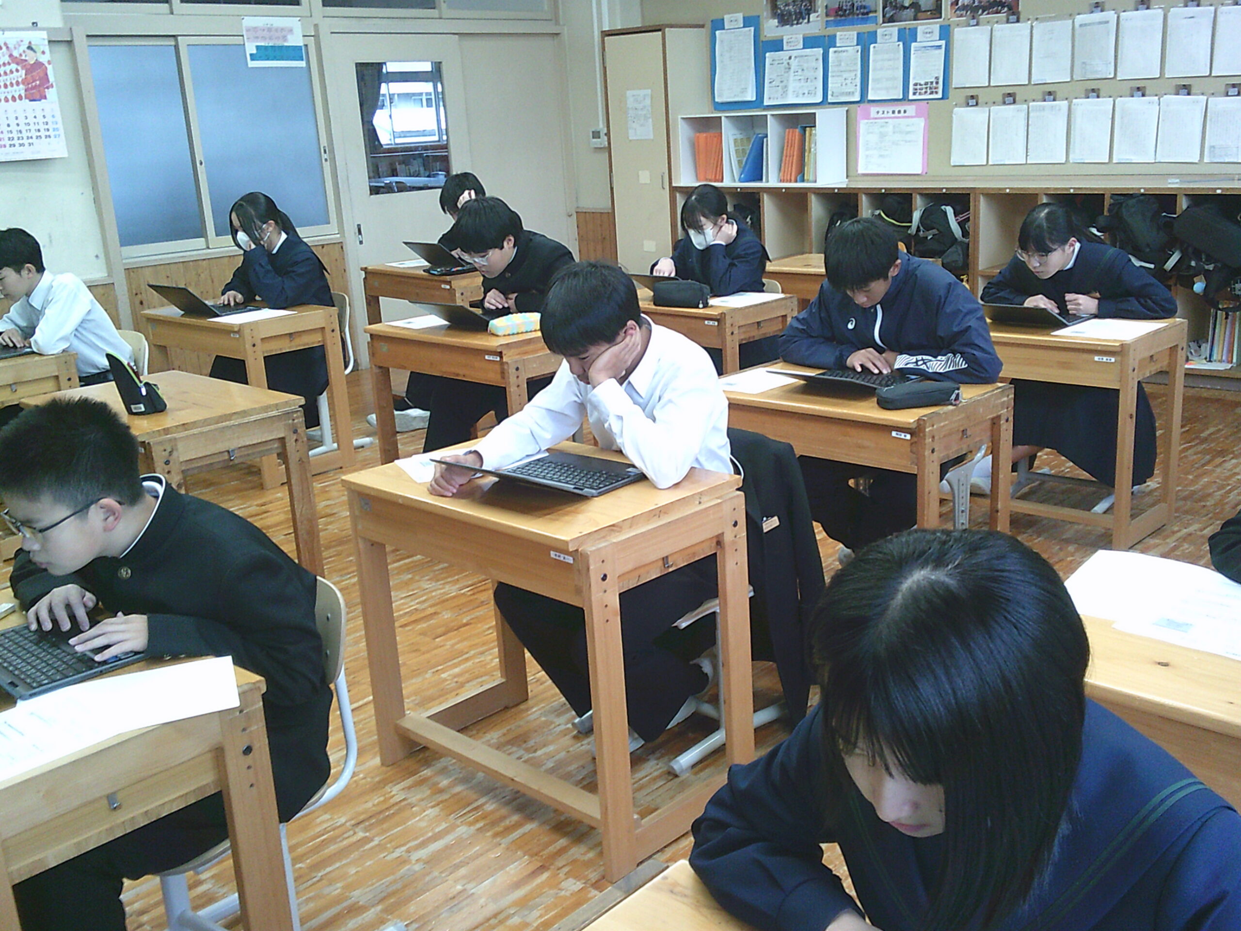 岡山県全体で実施している、中学校1、2年生の学力の定着状況を確認するテストを本日実施しました。このテストは国語と数学の2教科あり、全てPC上で解答を行います。生徒たちは、通常のテストと違い、PCでのテストということもあり、普段とは違う緊張の中、これまで学習した内容を振り返りながら、テストに取組んでいました。