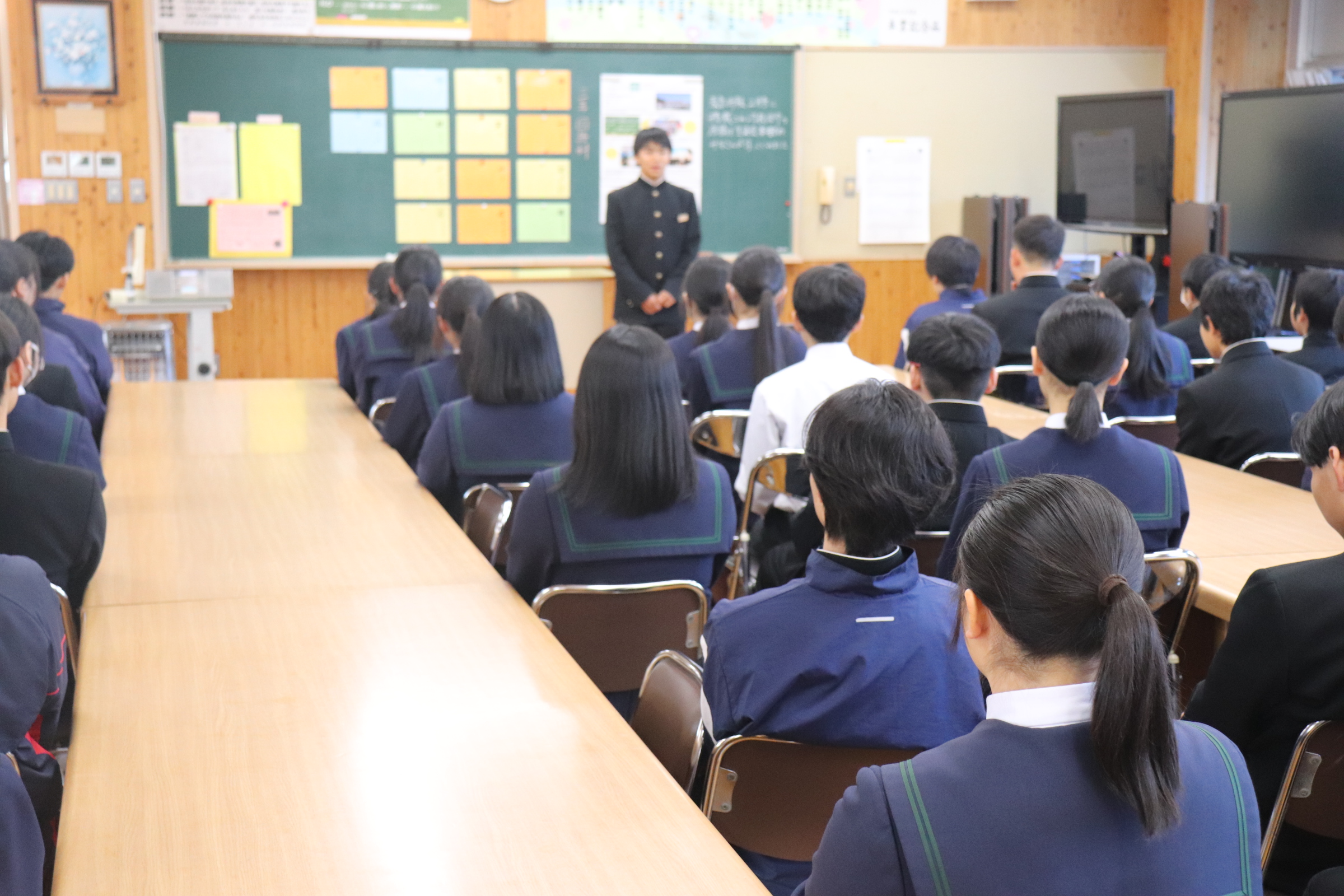 生徒総会では、執行部からの報告や提案を、1年生もしっかり聞いていました。