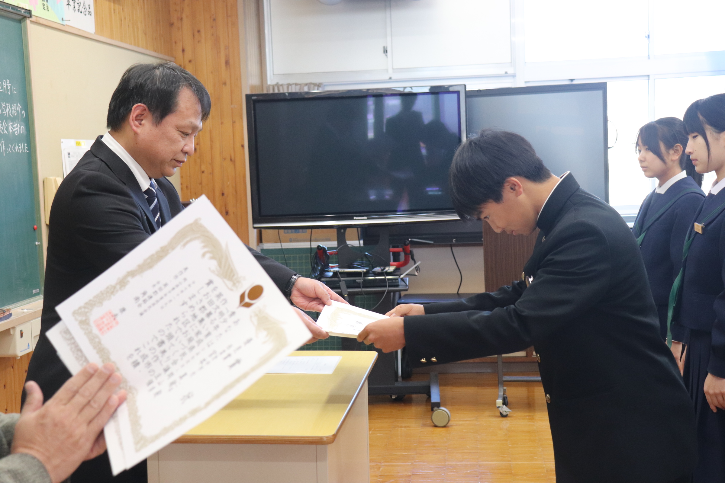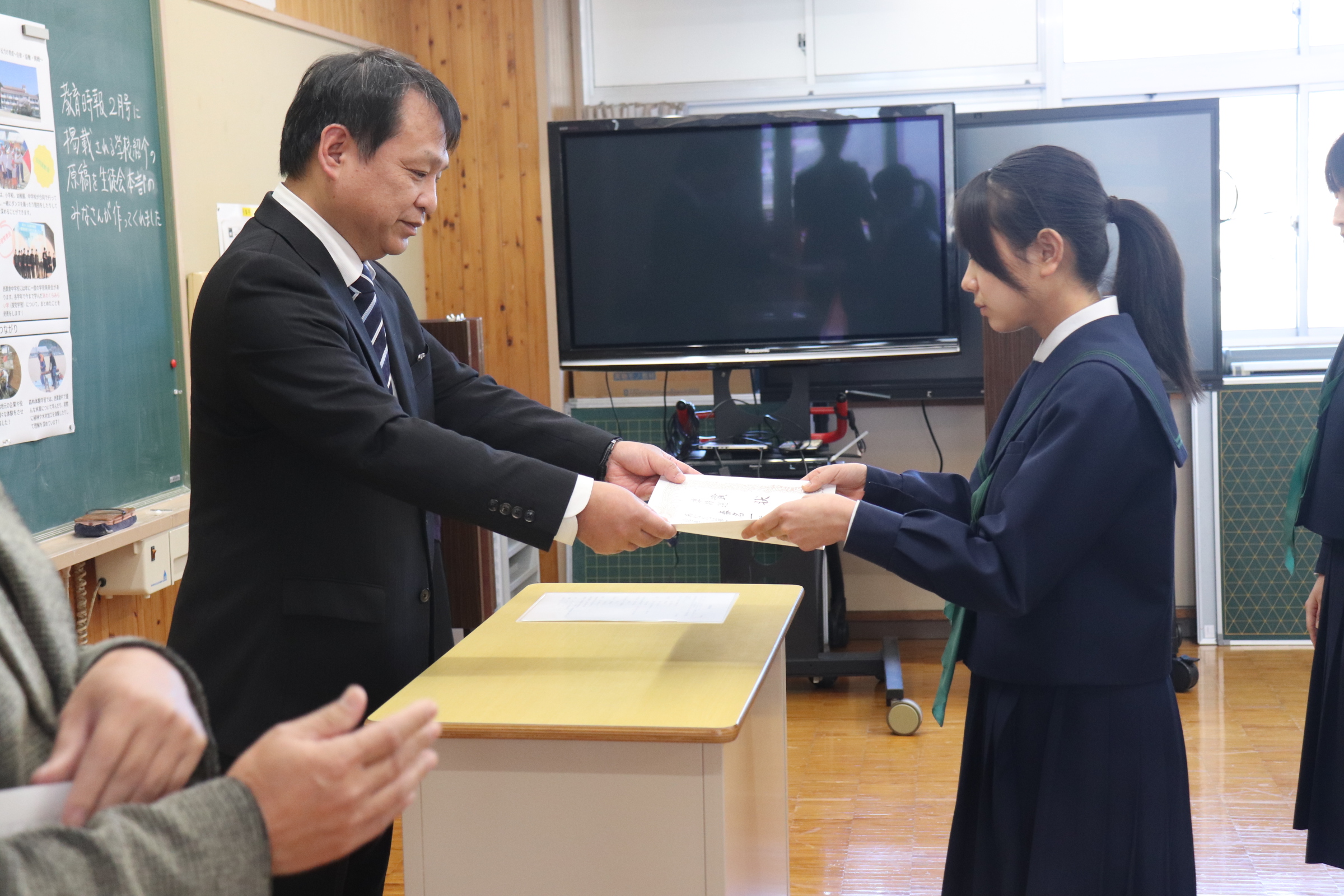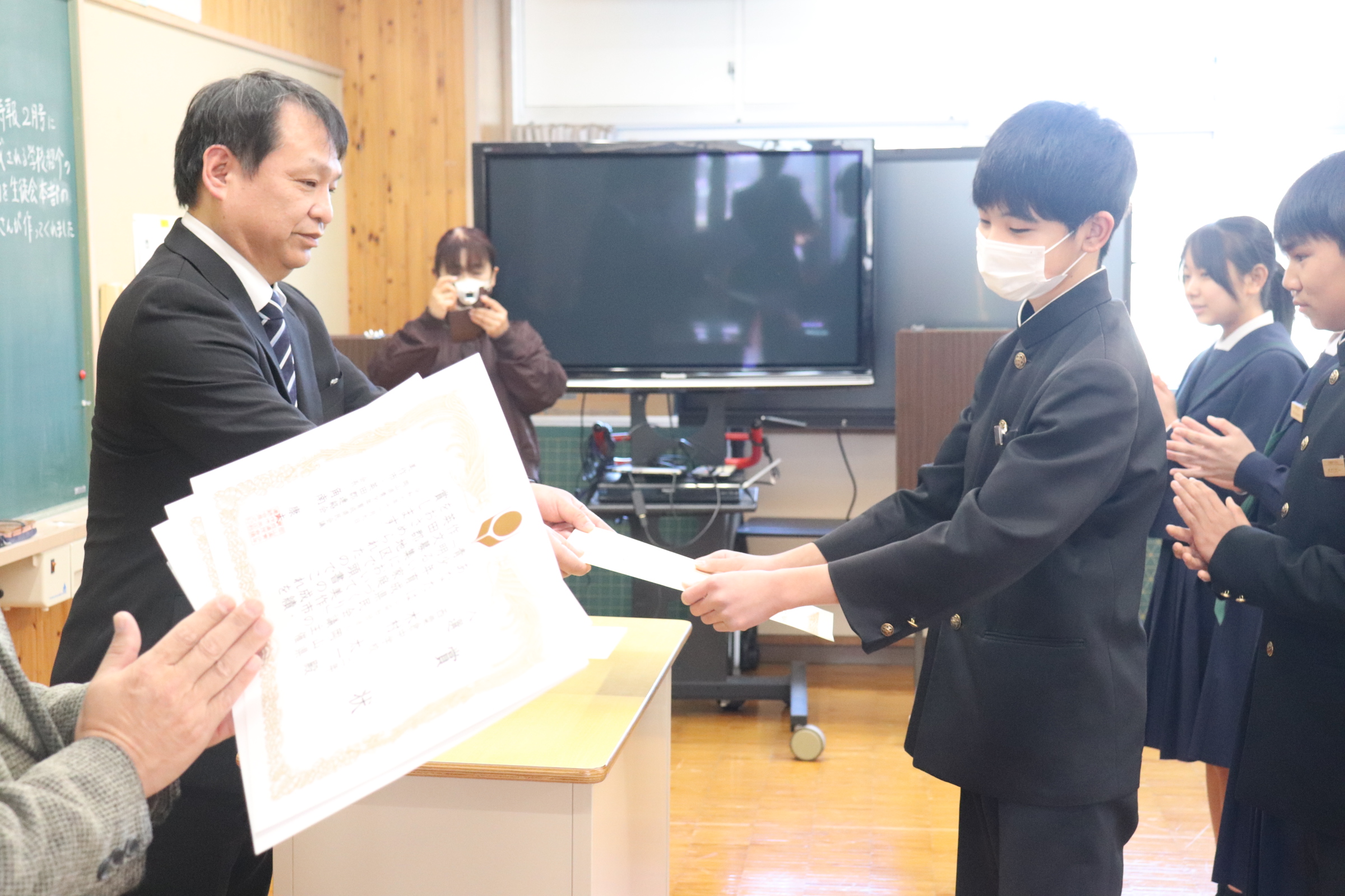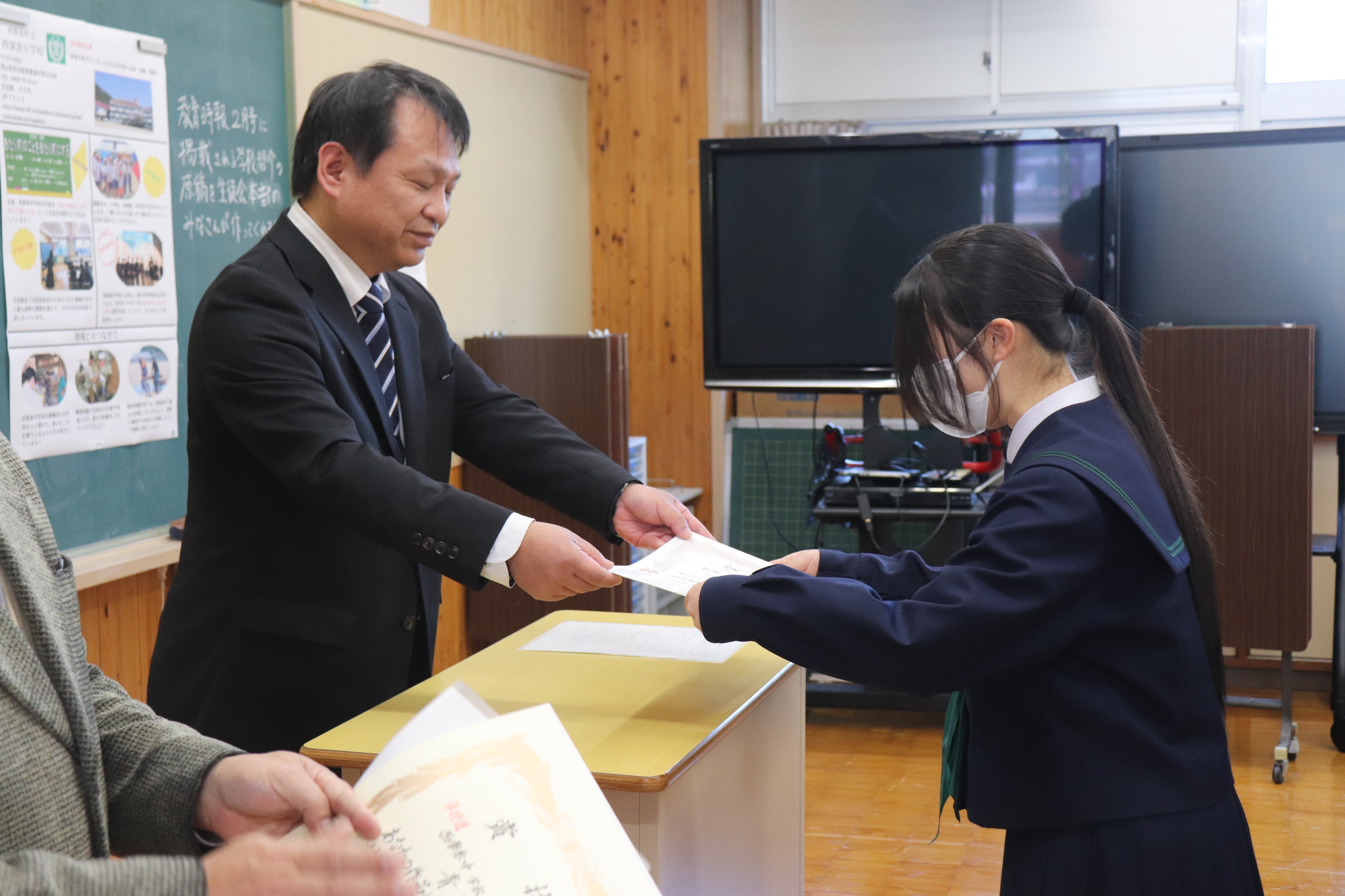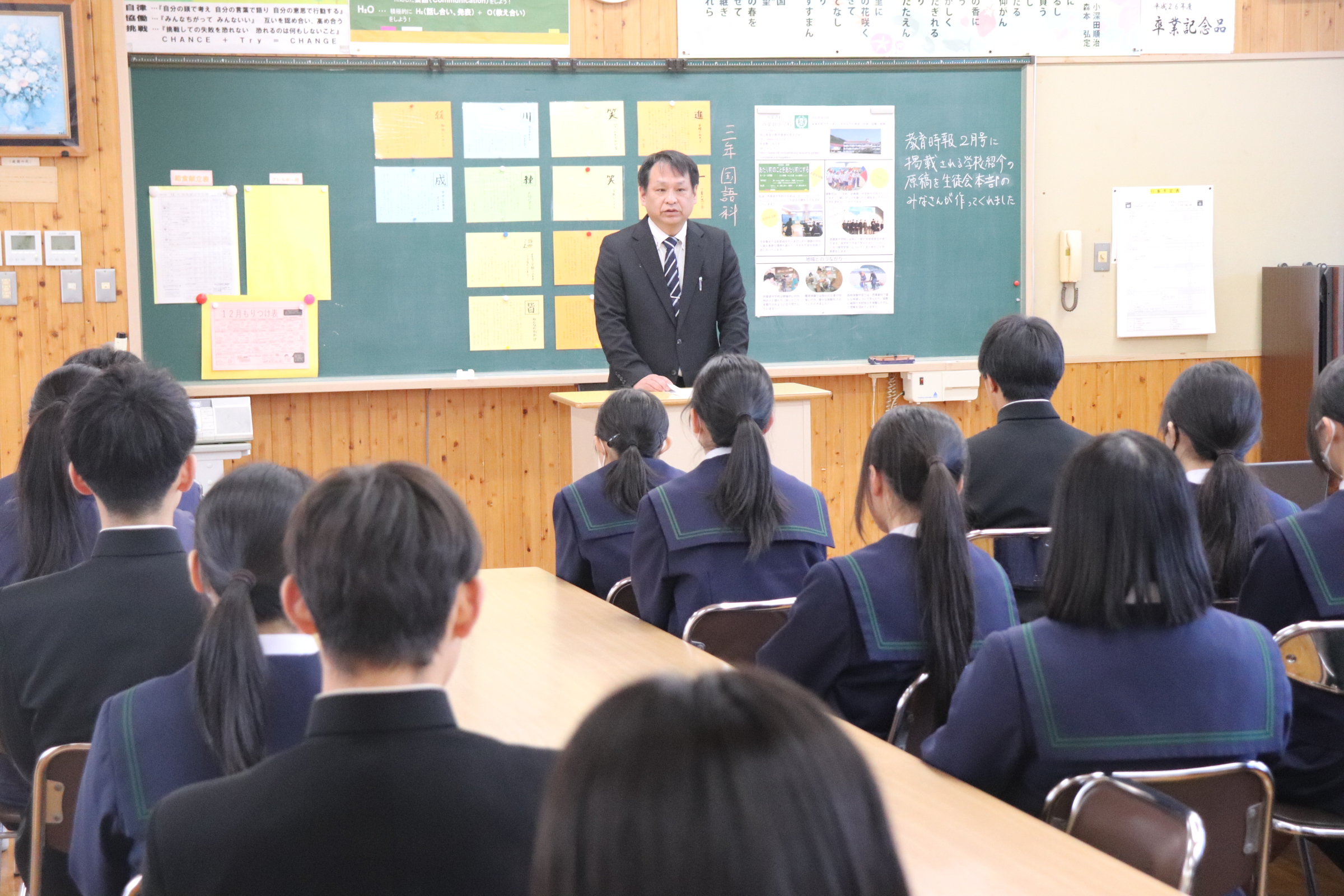 2学期終業式では、校歌斉唱からはじまり、それぞれの学級の2学期について、学級委員長が総括しました。2学期協力して学習に取組めたり仲良く過ごせた反面、勉強に集中できなかったり、家庭学習ができていなかったりといった反省が出ていました。校長からの話では、行事では、リーダーが入れ替わりながら活躍した2学期だったこと、西中統一模試では、西粟倉村が大切にしている「学びを楽しむ」という姿が見られたことなどの総括がありました。式に引き続いて行われた表彰伝達では、書道や作文など様々分野で活躍している人の賞状を披露し伝達を行っています。