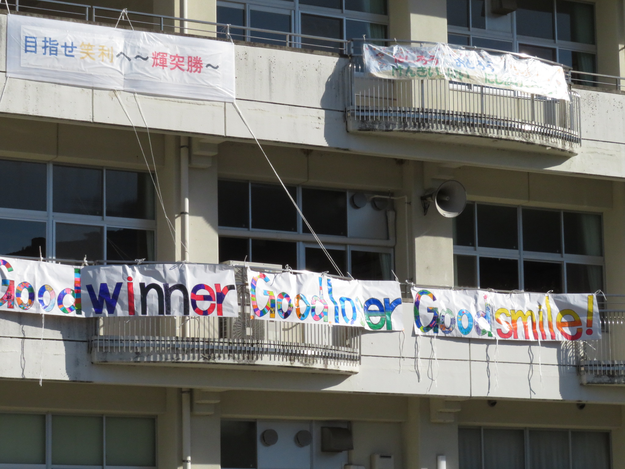 本年度の合同運動会の小学校スローガンは、写真の通りです。「Good loser」(グッドローザー)の文字が見えます。これは、2学期の始業式で子どもたちに話した言葉です。(詳しくは、学校便り9月号をご覧ください。)